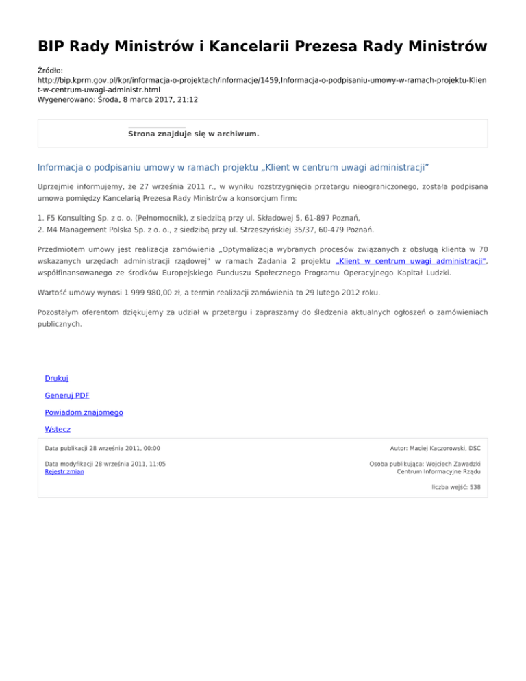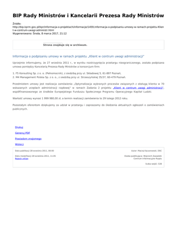 BIP Rady Ministrów i Kancelarii Prezesa Rady Ministrów Źródło: http://bip.kprm.gov.pl/kpr/informacja-o-projektach/informacje/1459,Informacja-o-podpisaniu-umowy-w-ramach-projektu-Klien t-w-centrum-uwagi-administr.html Wygenerowano: Środa, 8 marca 2017, 21:12 Strona znajduje się w archiwum. Informacja o podpisaniu umowy w ramach projektu „Klient w centrum uwagi administracji” Uprzejmie informujemy, że 27 września 2011 r., w wyniku rozstrzygnięcia przetargu nieograniczonego, została podpisana umowa pomiędzy Kancelarią Prezesa Rady Ministrów a konsorcjum firm: 1. F5 Konsulting Sp. z o. o. (Pełnomocnik), z siedzibą przy ul. Składowej 5, 61-897 Poznań, 2. M4 Management Polska Sp. z o. o., z siedzibą przy ul. Strzeszyńskiej 35/37, 60-479 Poznań. Przedmiotem umowy jest realizacja zamówienia „Optymalizacja wybranych procesów związanych z obsługą klienta w 70 wskazanych urzędach administracji rządowej" w ramach Zadania 2 projektu „Klient w centrum uwagi administracji", współfinansowanego ze środków Europejskiego Funduszu Społecznego Programu Operacyjnego Kapitał Ludzki. Wartość umowy wynosi 1 999 980,00 zł, a termin realizacji zamówienia to 29 lutego 2012 roku. Pozostałym oferentom dziękujemy za udział w przetargu i zapraszamy do śledzenia aktualnych ogłoszeń o zamówieniach publicznych. Drukuj Generuj PDF Powiadom znajomego Wstecz Data publikacji 28 września 2011, 00:00 Data modyfikacji 28 września 2011, 11:05 Rejestr zmian Autor: Maciej Kaczorowski, DSC Osoba publikująca: Wojciech Zawadzki Centrum Informacyjne Rządu liczba wejść: 538