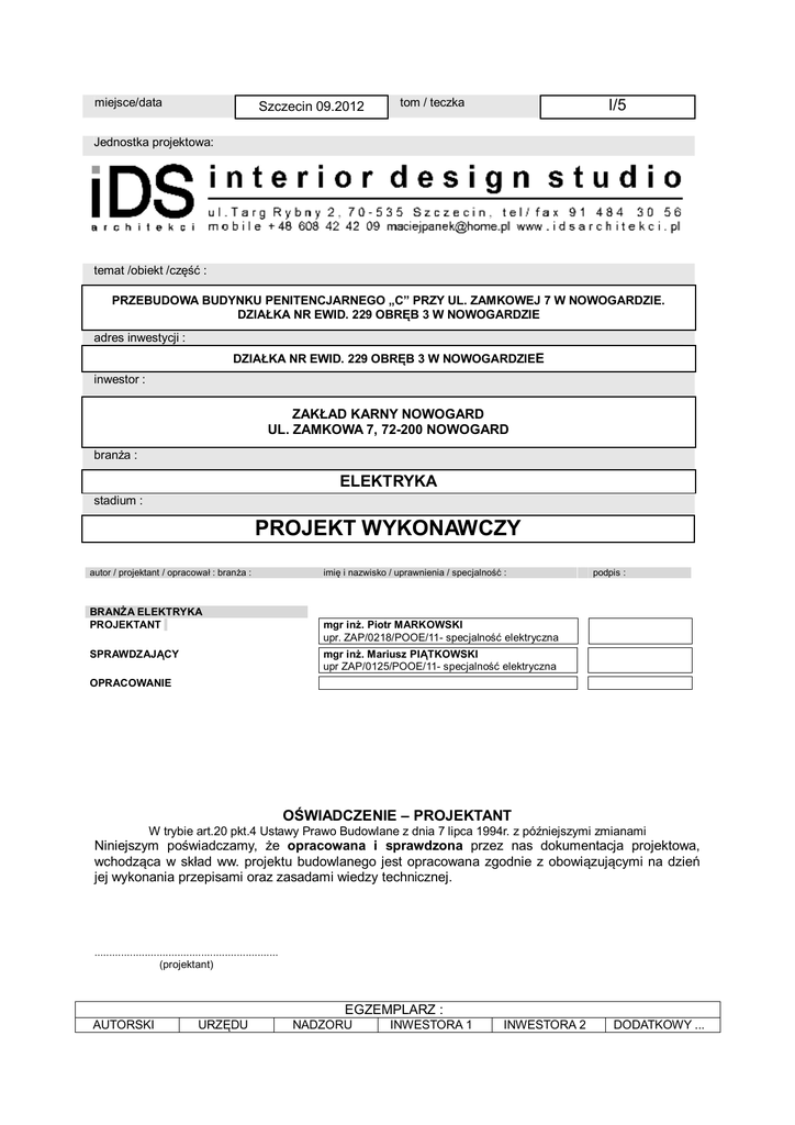 miejsce/data Szczecin 09.2012 tom / teczka I/5 Jednostka projektowa: temat /obiekt /część : PRZEBUDOWA BUDYNKU PENITENCJARNEGO „C” PRZY UL. ZAMKOWEJ 7 W NOWOGARDZIE. DZIAŁKA NR EWID. 229 OBRĘB 3 W NOWOGARDZIE adres inwestycji : DZIAŁKA NR EWID. 229 OBRĘB 3 W NOWOGARDZIEE inwestor : ZAKŁAD KARNY NOWOGARD UL. ZAMKOWA 7, 72-200 NOWOGARD branża : ELEKTRYKA stadium : PROJEKT WYKONAWCZY autor / projektant / opracował : branża : BRANŻA ELEKTRYKA PROJEKTANT SPRAWDZAJĄCY imię i nazwisko / uprawnienia / specjalność : podpis : mgr inż. Piotr MARKOWSKI upr. ZAP/0218/POOE/11- specjalność elektryczna mgr inż. Mariusz PIĄTKOWSKI upr ZAP/0125/POOE/11- specjalność elektryczna OPRACOWANIE OŚWIADCZENIE – PROJEKTANT W trybie art.20 pkt.4 Ustawy Prawo Budowlane z dnia 7 lipca 1994r. z późniejszymi zmianami Niniejszym poświadczamy, że opracowana i sprawdzona przez nas dokumentacja projektowa, wchodząca w skład ww. projektu budowlanego jest opracowana zgodnie z obowiązującymi na dzień jej wykonania przepisami oraz zasadami wiedzy technicznej. .............................................................. (projektant) EGZEMPLARZ : AUTORSKI URZĘDU NADZORU INWESTORA 1 INWESTORA 2 DODATKOWY ... 1 Spis treści 1Opis techniczny.........................................................................................................................2 1.1Podstawa opracowania.......................................................................................................2 1.2Temat opracowania.............................................................................................................2 1.3Bilans energetyczny............................................................................................................2 1.4Linie zasilające...................................................................................................................2 1.5Rozdzielnice projektowane.................................................................................................3 1.6Instalacje odbiorcze............................................................................................................3 1.7Uziom budynku..................................................................................................................9 1.8Instalacja odgromowa.........................................................................................................9 1.9Ochrona przeciwporażeniowa............................................................................................9 1.10Uwagi końcowe.............................................................................................................10 1.11Obliczenia techniczne.....................................................................................................10 2Rysunki........................................................................................................................................ SCHEMAT ZASILANIA .....................................................................................................E1 RZUT PARTERU.................................................................................................................E2 RZUT PIĘTRA I...................................................................................................................E3 RZUT PIĘTRA II..................................................................................................................E4 RZUT PIĘTRA III................................................................................................................E5 RZUT DACHU.....................................................................................................................E6 SCHEMAT ROZDZIELNICY RCG.....................................................................................E7 SCHEMAT ROZDZIELNICY RC1......................................................................................E8 SCHEMAT ROZDZIELNICY RC2......................................................................................E9 SCHEMAT ROZDZIELNICY RC3....................................................................................E10 SCHEMAT ROZDZIELNICY CELI Cxxx..........................................................................E11 RZUT PARTERU- INSTALACJA STEROWANIA............................................................E12 RZUT PIĘTRA I – INSTALACJA STEROWANIA............................................................E13 RZUT PIĘTRA II – INSTALACJA STEROWANIA...........................................................E14 RZUT PIĘTRA III – INSTALACJA STEROWANIA.........................................................E15 SCHEMAT INSTALACJI PRZYZYWOWEJ-PARTERU...................................................E16 SCHEMAT INSTALACJI PRZYZYWOWEJ-PIĘTRO I....................................................E17 SCHEMAT INSTALACJI PRZYZYWOWEJ-PIĘTRO II...................................................E18 SCHEMAT INSTALACJI PRZYZYWOWEJ-PIĘTRO III.................................................E19 PRZEBUDOWA BUDYNKU PENITENCJARNEGO „C”PRZY UL. ZAMKOWEJ 7 W NOWOGARDZIE DZIAŁKA NR EWID. 229 OBRĘB 3 W NOWOGARDZIE 2 1 Opis techniczny 1.1 Podstawa opracowania ● Projekty budowlane i branżowe ● Obowiązujące normy i przepisy ● Warunki techniczne przyłączenia do sieci elektroenergetycznej ● Warunki Techniczne Budynków i Polskie Normy PN-IEC 60364 1.2 Temat opracowania Projekt wykonawczy branży elektrycznej instalacji wewnętrznych dla: Przebudowa budynku penitencjarnego „C” przy ul. Zamkowej 7 w Nowogardzie działka nr ewid. 229 obręb 3 w Nowogardzie. Niniejszy projekt obejmuje swoim zakresem zasilanie budynku z istniejącego złącza ZK-3b do projektowanej rozdzielnicy głównej budynku RCG oraz instalacje wnętrzowe, instalacja odgromową i uziemiającą. 1.3 Bilans energetyczny Na etapie projektowania z bilansu dla obiektu po uwzględnieniu współczynników jednoczesności uzys