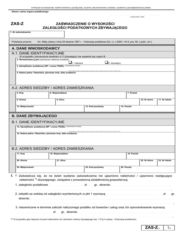 WYPEŁNIĆ NA MASZYNIE, KOMPUTEROWO LUB RĘCZNIE, DUŻYMI, DRUKOWANYMI LITERAMI, CZARNYM LUB NIEBIESKIM KOLOREM. Nazwa i adres organu podatkowego . . . . . . . . . . . . . . . . . . . . . . . . . . . . . . . . (miejscowość i data) ZAS-Z ZAŚWIADCZENIE O WYSOKOŚCI ZALEGŁOŚCI PODATKOWYCH ZBYWAJĄCEGO 1. Nr zaświadczenia Podstawa prawna: Art. 306g ustawy z dnia 29 sierpnia 1997 r. - Ordynacja podatkowa (Dz. U. z 2005 r. Nr 8, poz. 60, z późn. zm.). A. DANE WNIOSKODAWCY A.1. DANE IDENTYFIKACYJNE W przypadku zaznaczenia kwadratu nr 2 (zbywający) nie wypełnia się części B. 2. Wnioskodawcą jest (zaznaczyć właściwy kwadrat): 2. zbywający 1. nabywca 3. Identyfikator podatkowy NIP / numer PESEL (niepotrzebne skreślić) └────┴────┴────┴────┴────┴────┴────┴────┴────┴────┴────┘ 4. Nazwa pełna / Nazwisko, pierwsze imię, data urodzenia A.2. ADRES SIEDZIBY / ADRES ZAMIESZKANIA 5. Kraj 6. Województwo 8. Gmina 7. Powiat 9. Ulica 12. Miejscowość 13. Kod pocztowy 10. Nr domu 11. Nr lokalu 22. Nr domu 23. Nr lokalu 14. Poczta B. DANE ZBYWAJĄCEGO B.1. DANE IDENTYFIKACYJNE 15. Identyfikator podatkowy NIP / numer PESEL (niepotrzebne skreślić) └────┴────┴────┴────┴────┴────┴────┴────┴────┴────┴────┘ 16. Nazwa pełna / Nazwisko, pierwsze imię, data urodzenia B.2. ADRES SIEDZIBY / ADRES ZAMIESZKANIA 17. Kraj 18. Województwo 20. Gmina 19. Powiat 21. Ulica 24. Miejscowość I. 1) 25. Kod pocztowy 26. Poczta Zaświadcza się, że na dzień wydania zaświadczenia nie ujawniono należności / ujawniono następujące należności *) zbywającego, związane z prowadzoną działalnością gospodarczą: 1. zaległości podatkowe. . . . . . . . . . . . . . . . . . . . . . zł . . . . gr, słownie:. . . . . . . . . . . . . . . . . . . . . . . . . . . . . . . . . . . . . . . . . . . . . . . . . . . . . . . . . . . . . . . . . . . . . . . . . . . . . . . . . . . . . . . . . . . . . . . . . . . . . . . . . . . . . . . . . . . . . . . . . . . . . . . . . . . , 2. odsetki za zwłokę od zaległości wymienionych w pkt 1 wynoszą. gr, słownie:. . . . . . . . . . . . . . . . . . . . . . . . . . . . . . . . . . . zł . . . . . . . . . . . . . . . . . . . . . . . . . . . . . . . . . . . . . . . . . . . . . . . . . . . . . . . . . . . . . . . . . . . . . . . . . . . . . . . . . . . . . . . . . . . . . . . . . . . . . . . . . . . . . . . . . . . . . . . . . . . . . . . . . . . . . . . . . . . . . . . . . . . . . . . . . . . . . . . . . . . . . . . . . . . . . . . . . . . . . . , 3. niezwrócone w terminie zaliczki naliczonego podatku od towarów i usług oraz ich oprocentowanie wynoszą . . . . . . . . . . . . . . . . . . . . . . zł . . . gr, słownie:. . . . . . . . . . . . . . . . . . . . . . . . . . . . . . . . . . . . . . . . . . . . . . . . . . . . . . . . . . . . . . . . . . . . . . . . . . . . . . . . . . . . . . . . . . . . . . . . . . . . . . . . . . . . . . . . . . . . . . . . . . . . . . . . . . . . . . . . . . . . . . . . . . . . . . . . 1) W przypadku gdy nabywca nie jest małżonkiem lub członkiem rodziny zbywającego (art. 112 § 4 ustawy - Ordynacja podatkowa). ZAS-Z (3) 1/2 , WYPEŁNIĆ NA MASZYNIE, KOMPUTEROWO LUB RĘCZNIE, DUŻYMI, DRUKOWANYMI LITERAMI, CZARNYM LUB NIEBIESKIM KOLOREM. 4. koszty postępowania egzekucyjnego wynoszą . . . . . . . . . . . . . . . . . . . . zł . . . gr, słownie:. . . . . . . . . . . . . . . . . . . . . . . . . . . . . . . . . . . . . . . . . . . . . . . . . . . . . . . . . . . . . . . . . . . . . . . . . . . . . . . . . . . . . . . . . . . . . . . . . . . . . . . . . . . . . . . . . . . . II. 2) Zaświadcza się, że na dzień wydania zaświadczenia nie ujawniono należności / ujawniono następujące należności *) zbywającego, związane z prowadzoną działalnością gospodarczą: 1. zaległości podatkowe . . . . . . . . . . . . . . . . . . . . . . . . . . . . . . . zł . . . gr, słownie:. . . . . . . . . . . . . . . . . . . . . . . . . . . . . . . . . . . . . . . . . . . . . . . . . . . . . . . . . . . . . . . . . . . . . . . . . . . . . . . . . . . . . . . . . . . . . . . . . . . . . . . . . . . . . . . . . . . . . . . . . . . . . . . . . . . . . . . . . . . . . . . . . . . . . . . . . . . . . . . . . . . . . . . . . . . . . . . . . . . . . . . . . . . . . . . . . . . . . . . . . . . . . . . . . . . . . . . . . . , 2. podatki niepobrane oraz pobrane, a niewpłacone z tytułu sprawowanej przez zbywającego funkcji płatnika lub inkasenta wynoszą . . . . . . . . . . . . . . . . . . . . . zł . . . gr, słownie:. . . . . . . . . . . . . . . . . . . . . . . . . . . . . . . . . . . . . . . . . . , . . . . . . . . . . . . . . . . . . . . . . . . . . . . . . . . . . . . . . . . . . . . . . . . . . . . . . . . . . . . . . . . . . . . . . . . . . . . . . . . . . . . . . . . . . . . . . . 3. odsetki za zwłokę od zaległości wymienionych w pkt 1 i 2 wynoszą. słownie . . . . . . . . . . . . . . . . . . . . . . . . . . . . . . . . . zł . . . gr, , . . . . . . . . . . . . . . . . . . . . . . . . . . . . . . . . . . . . . . . . . . . . . . . . . . . . . . . . . . . . . . . . . . . . . . . . . . . . . . . . . . . . . . 4. niezwrócone w terminie zaliczki naliczonego podatku od towarów i usług oraz ich oprocentowanie wynoszą . . . . . . . . . . . . . . . . . . . . . . zł . . . gr, słownie:. . . . . . . . . . . . . . . . . . . . . . . . . . . . . . . . . . . . . . . . . . . . . . . . . . . . . . . . . . . . . . . . . . . . . . . . . . . . . . . . . . . . . . . . . . . . . . . . . . . . . . . . . . . . . . . . . . . . . . . . . . . . . . . . . . . . . . . . . . . . . . . . . . . . . . . . . 5. koszty postępowania egzekucyjnego wynoszą . . . . . . . . . . . . . . . . . . . . zł . . . gr, słownie:. . . . . . . . . . . . . . . . . .