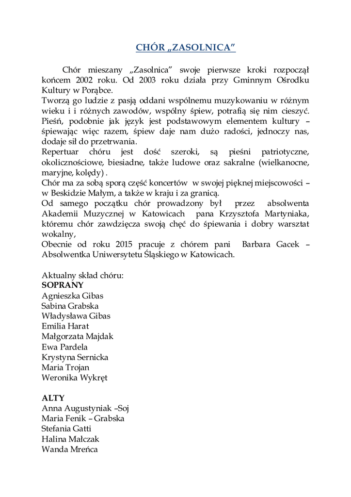 CHÓR „ZASOLNICA” Chór mieszany „Zasolnica” swoje pierwsze kroki rozpoczął końcem 2002 roku. Od 2003 roku działa przy Gminnym Ośrodku Kultury w Porąbce. Tworzą go ludzie z pasją oddani wspólnemu muzykowaniu w różnym wieku i i różnych zawodów, wspólny śpiew, potrafią się nim cieszyć. Pieśń, podobnie jak język jest podstawowym elementem kultury – śpiewając więc razem, śpiew daje nam dużo radości, jednoczy nas, dodaje sił do przetrwania. Repertuar chóru jest dość szeroki, są pieśni patriotyczne, okolicznościowe, biesiadne, także ludowe oraz sakralne (wielkanocne, maryjne, kolędy) . Chór ma za sobą sporą część koncertów w swojej pięknej miejscowości – w Beskidzie Małym, a także w kraju i za granicą. Od samego początku chór prowadzony był przez absolwenta Akademii Muzycznej w Katowicach pana Krzysztofa Martyniaka, któremu chór zawdzięcza swoją chęć do śpiewania i dobry warsztat wokalny, Obecnie od roku 2015 pracuje z chórem pani Barbara Gacek – Absolwentka Uniwersytetu Śląskiego w Katowicach. Aktualny skład chóru: SOPRANY Agnieszka Gibas Sabina Grabska Władysława Gibas Emilia Harat Małgorzata Majdak Ewa Pardela Krystyna Sernicka Maria Trojan Weronika Wykręt ALTY Anna Augustyniak –Soj Maria Fenik – Grabska Stefania Gatti Halina Małczak Wanda Mreńca Teresa Olearczyk Maria Sadlik Anna Walusiak Mirosława Wawak TENORY Kazimierz Drabek Eugeniusz Harat Adam Orawczak Jan Sadlik Julian Walusiak Władysław Wykręt BASY Kazimierz Dudziak Antoni Dudzik Leon Laszczak Mieczysław Micherda Władysław Wykręt Nazwa chóru „Zasolnica” pochodzi od zalesionego stoku górskiego. Ten kompleks jest rezerwatem przyrody utworzony w 1973 roku w celu ochrony starodrzewia buczyny karpackiej regla dolnego, tworząc najokazalszy park krajobrazowy w zachodniej części Porąbki , tuż za rzeką Sołą, przepływającą przez naszą miejscowość, na której to rzece znajduje się najstarsza Zapora Wodna w Polsce z 1936 roku wraz z Elektrownią Wodną. Zapraszamy do Porąbki, zapraszamy na nasze występy.