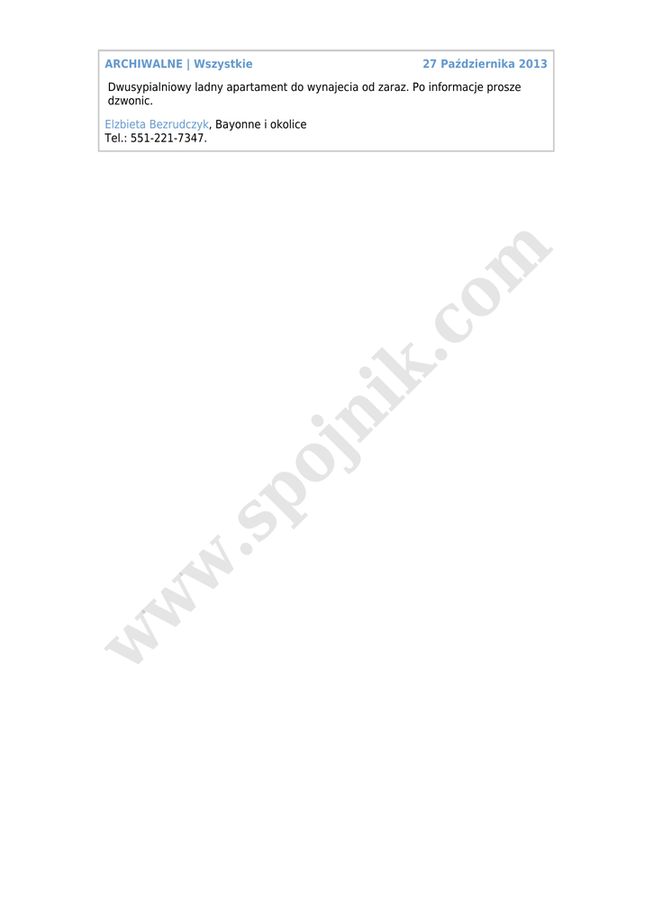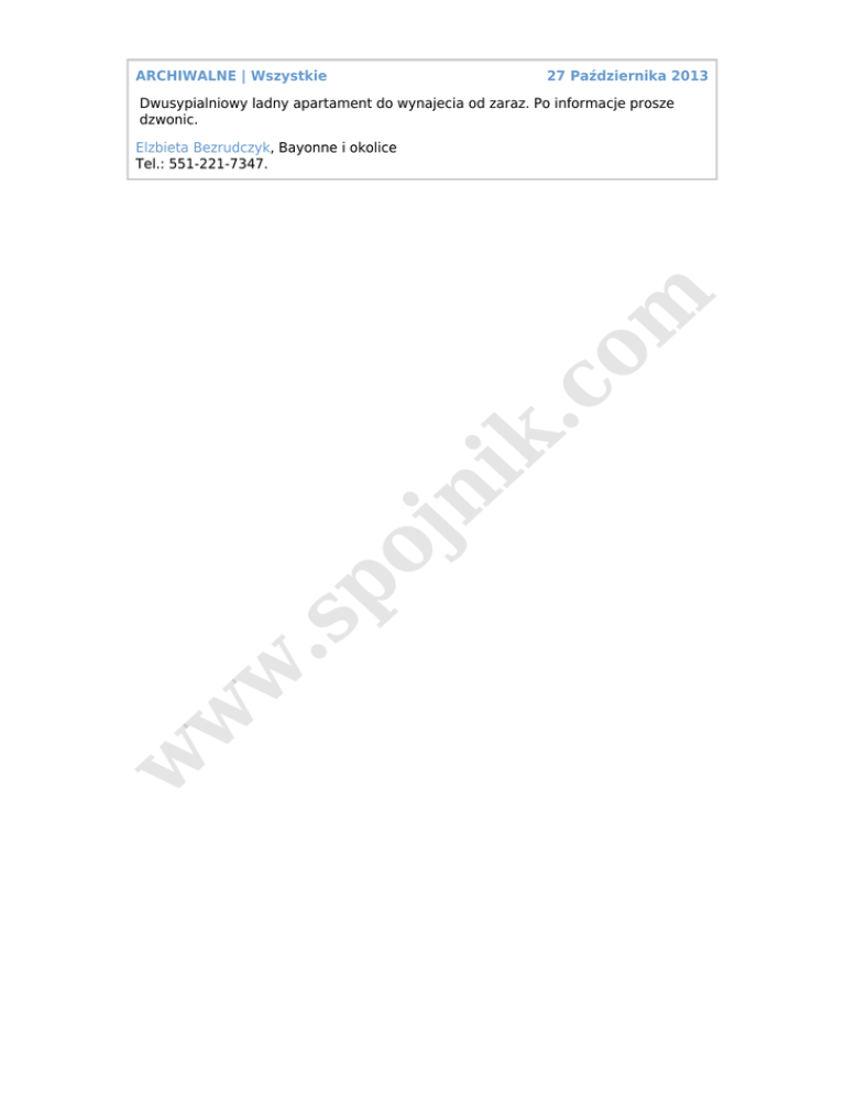 ARCHIWALNE | Wszystkie 27 Października 2013 Dwusypialniowy ladny apartament do wynajecia od zaraz. Po informacje prosze dzwonic. w w w .s po jn ik .c o m Elzbieta Bezrudczyk, Bayonne i okolice Tel.: 551-221-7347.