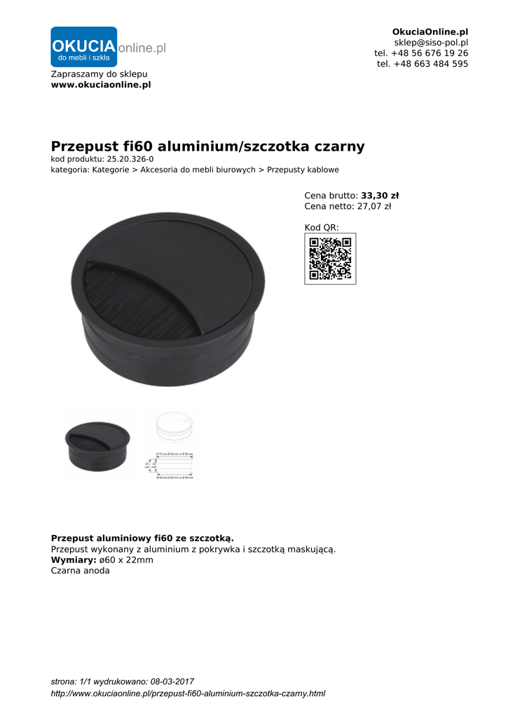 OkuciaOnline.pl [email protected] tel. +48 56 676 19 26 tel. +48 663 484 595 Zapraszamy do sklepu www.okuciaonline.pl Przepust fi60 aluminium/szczotka czarny kod produktu: 25.20.326-0 kategoria: Kategorie > Akcesoria do mebli biurowych > Przepusty kablowe Cena brutto: 33,30 zł Cena netto: 27,07 zł Kod QR: Przepust aluminiowy fi60 ze szczotką. Przepust wykonany z aluminium z pokrywka i szczotką maskującą. Wymiary: ø60 x 22mm Czarna anoda strona: 1/1 wydrukowano: 08-03-2017 http://www.okuciaonline.pl/przepust-fi60-aluminium-szczotka-czarny.html