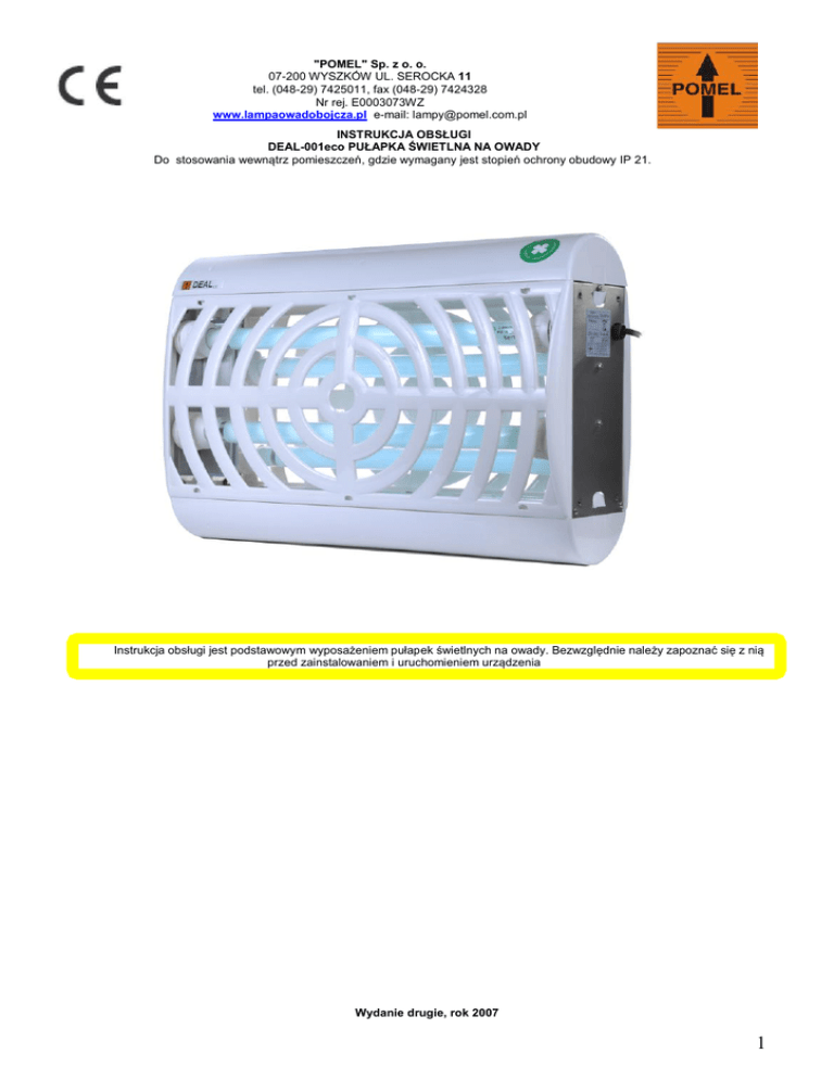 "POMEL" Sp. z o. o. 07-200 WYSZKÓW UL. SEROCKA 11 tel. (048-29) 7425011, fax (048-29) 7424328 Nr rej. E0003073WZ www.lampaowadobojcza.pl e-mail: [email protected] INSTRUKCJA OBSŁUGI DEAL-001eco PUŁAPKA ŚWIETLNA NA OWADY Do stosowania wewnątrz pomieszczeń, gdzie wymagany jest stopień ochrony obudowy IP 21. Instrukcja obsługi jest podstawowym wyposażeniem pułapek świetlnych na owady. Bezwzględnie należy zapoznać się z nią przed zainstalowaniem i uruchomieniem urządzenia Wydanie drugie, rok 2007 1 DEKLARACJA ZGODNOŚCI WE Nr 16/2007 Ja niżej podpisany reprezentujący niżej wymienionego producenta "POMEL" Sp. z o. o. 07-200 WYSZKÓW UL. SEROCKA 11 Deklaruję, że wyrób: Pułapka świetlna na owady DEAL-001eco, Jest zgodny z postanowieniami następujących dyrektyw: Dyrektywą 2006/95/WE dot. Wymagań dla sprzętu elektrycznego i Dyrektywą 2004/108/WE dot. Kompatybilności elektromagnetycznej W Dyrektywie 2006/95/WE, uwzględnione są następujące normy zharmonizowane: PN-EN 60335-1:2004+A1:2005+A2:2006(U); PN-EN 60335-2-59:2007 W Dyrektywie 2004/108/WE, uwzględnione są następujące normy zharmonizowane: PN-EN 55014-1:2004; PN-EN 61000-3-2:2004+A2; PN-EN 61000-3-3:1997; PN-EN 61000-3-3:1997/A1;2005; PN-EN 55014-2:1999; PN-EN 55014-2:1999/A1:2004 I wynikające z niej normy do badań Ta deklaracja zgodności traci swą ważność, jeśli produkt zostanie zmieniony lub przebudowany bez naszej zgody. Dwie ostatnie cyfry roku, w którym naniesiono oznakowanie CE na sprzęt elektryczny: 07 Dyrektor Wyszków 17.10 2007r Paweł Trzciński SPIS TREŚCI 1. Wstęp 2. Instalowanie i obsługa pułapek świetlnych 3. Znaki i napisy bezpieczeństwa 4. Ryzyko szczątkowe 5. Części zamienne 6. Konserwacja i naprawy 7. Zużyty sprzęt 8. Warunki gwarancji 9. Ewidencja napraw 10. KARTA GWARANCYJNA 2 2 5 5 6 6 7 7 8 8 Wstęp Niniejsza instrukcja obsługi jest istotną częścią składową wyrobu. Przed przystąpieniem do eksploatacji pułapki świetlnej nabywca zobowiązany jest zapoznać się z instrukcją obsługi, która w sposób przejrzysty ukazuje wszystkie zagadnienia związane z prawidłowym użytkowaniem i obsługą pułapki. Stosowanie się do zaleceń producenta zawartych w niniejszej instrukcji gwarantuje użytkownikowi pełną satysfakcję z eksploatacji pułapki. W przypadku trudności w zrozumieniu instrukcji zwrócić się należy do producenta w celu uzyskania szerszych informacji. 1. Ważne informacje oznaczone są znakiem 2. i tłustym drukiem Instalowanie i obsługa pułapek świetlnych 2.1. Opis ogólny i przeznaczenie urządzenia Jedną z głównych przyczyn niskiego stanu higieny sanitarnej w pomieszczeniach domowych, gospodarczych i przemysłu rolno-spożywczego są zaniedbania w zwalczaniu szkodliwych owadów, przede wszystkim nadlatujących licznie do pomieszczeń różnych gatunków much i muchówek krwiopijnych np. komarów, meszek (zwanych popularnie muszkami). Muchy należą do owadów najczęściej występujących w pomieszczeniach. W miejscach gromadzenia się odpadów populacje much mogą być bardzo liczne, zważywszy, że jedna tylko samica muchy domowej w ciągu życia składa do 1000 jaj. Wylęgające się larwy znajdują dogodne warunki rozwoju w rozkładającej się żywności, często skażonej bakteriami, w odchodach zwierząt (ściółka itp.). Muchówki krwiopijne i licznie występujące muchy niepokoją zwierzęta. Znajduje to odbicie w obniżeniu np. mleczności krów, w zmniejszeniu przyrostów wagowych zwierząt gospodarskich.Owady mogą przenosić różne chorobotwórcze drobnoustroje wtedy, kiedy w sposób mechaniczny przenoszą je na swoim ciele lub czynny, kiedy poprzez ukłucie wprowadzają do organizmu bakterie (np. komary, meszki itp.). Takie groźne choroby jak: tularemia, kleszczowe zapalenie mózgu, przenoszone są przez komary i muchówki krwiopijne, które poza tym boleśnie kłują powodując niekiedy długotrwałe schorzenia 2 skóry - dermatozy. Liczne gatunki much, jak mucha domowa, mucha plujka, bolimuszka, ścierwica i inne, są szczególnie niebezpieczne podczas lata, kiedy bakterie szybko się rozmnażają. Mogą one przenosić bakterie chorobotwórcze, powodując niebezpieczne choroby jelitowe - biegunki i salmonellozy. Dlatego właśnie w szeroko pojętym przemyśle spożywczym (przetwórnie, zakłady produkcyjne, hale magazynowe) a także w sklepach spożywczych i w gastronomii (restauracje, bary) niezwykle ważne jest racjonalne zwalczanie much. Do zwalczania owadów stosowane są najczęściej różnego rodzaju środki owadobójcze. Jednakże toksyczność dla ludzi i zwierząt chemicznych środków owadobójczych, zawierających pestycydy, ogranicza w znacznym stopniu ich stosowanie. Jak dotychczas najskuteczniejsze okazały się substancje biologicznie czynne np. feromony i promieniowanie świetlne. Promieniowanie świetlne o odpowiednim natężeniu i długości fali aktywizuje muchy, ponieważ są one nie tylko owadami dziennymi, ale i najczęściej heliofilnymi tj. kierującymi się do źródeł światła. Dlatego też stosowanie pułapek świetlnych na owady jest ze wszech miar wskazane. Pułapki świetlne na owady skutecznie niszczą owady, nie wydzielają substancji toksycznych, nie wymagają ciągłej obsługi i nadzoru. Inne zalety to: niski koszt eksploatacji oraz łatwość instalowania i obsługi. Działanie pułapki świetlnej polega na zwabieniu owadów światłem o odpowiedniej długości fali lub substancją wabiącą (feromony) i niszczeniu ich poprzez wyłapywanie lepami, do których owady przyklejają się. Pułapka świetlna jest bardzo skuteczna w działaniu i w pełni bezpieczna przy ścisłym przestrzeganiu przepisów i wskazówek zawartych w niniejszej instrukcji. Aby zwiększyć skuteczność działania lampy powinna ona pracować przez całą dobę. 1.2 Dane techniczne. Tablica 1 Dane techniczne pułapek świetlnych na owady DEAL-001eco Typ pułapki świetlnej na DEAL-001eco owady Nr kat.
