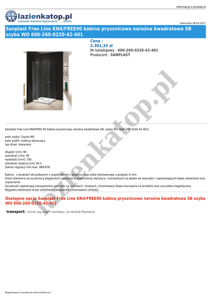 Informacje o produkcie Utworzono 08-03-2017 Sanplast Free Line KN4/FREE90 kabina prysznicowa narożna kwadratowa SB szyba WO 600-260-0220-42-401 Cena : 2.301,33 zł to p. pl Nr katalogowy : 600-260-0220-42-401 Producent : SANPLAST Sanplast Free Line KN4/FREE-90 kabina prysznicowa narożna kwadratowa SB, szyba WO (600-260-0220-42-401) en długość [cm]: 90 szerokość [cm]: 90 wysokość [mm]: 195 szerokość wejścia [cm]: 84.5 Zakres regulacji min-max 868-878 ka wzór szyby: Czysta W0 kolor profili: srebrny błyszczący typ drzwi: otwierane zi Kabina z drzwiami skrzydłowymi z wypełnieniem z bezpiecznego szkła hartowanego o grubości 6 mm. Drzwi otwierane są za pomocą eleganckich zawiasów o nowoczesnej stylistyce, mocowanych na płasko od wewnątrz i zapewniających łatwe otwieranie oraz czyszczenie. Szczelność zapewniają transparentne uszczelki na ściankach i drzwiach, chromowana listwa mocowana na brodziku oraz uszczelka magnetyczna. Wygodne otwieranie drzwi umożliwiają eleganckie chromowane uchwyty. la Dostępne opcje Sanplast Free Line KN4/FREE90 kabina prysznicowa narożna kwadratowa SB szyba WO 600-260-0220-42-401 transport: kurier wg wagi i rozmiaru, na terenie Poznania. Wygenerowano w programie www.oscGold.com
