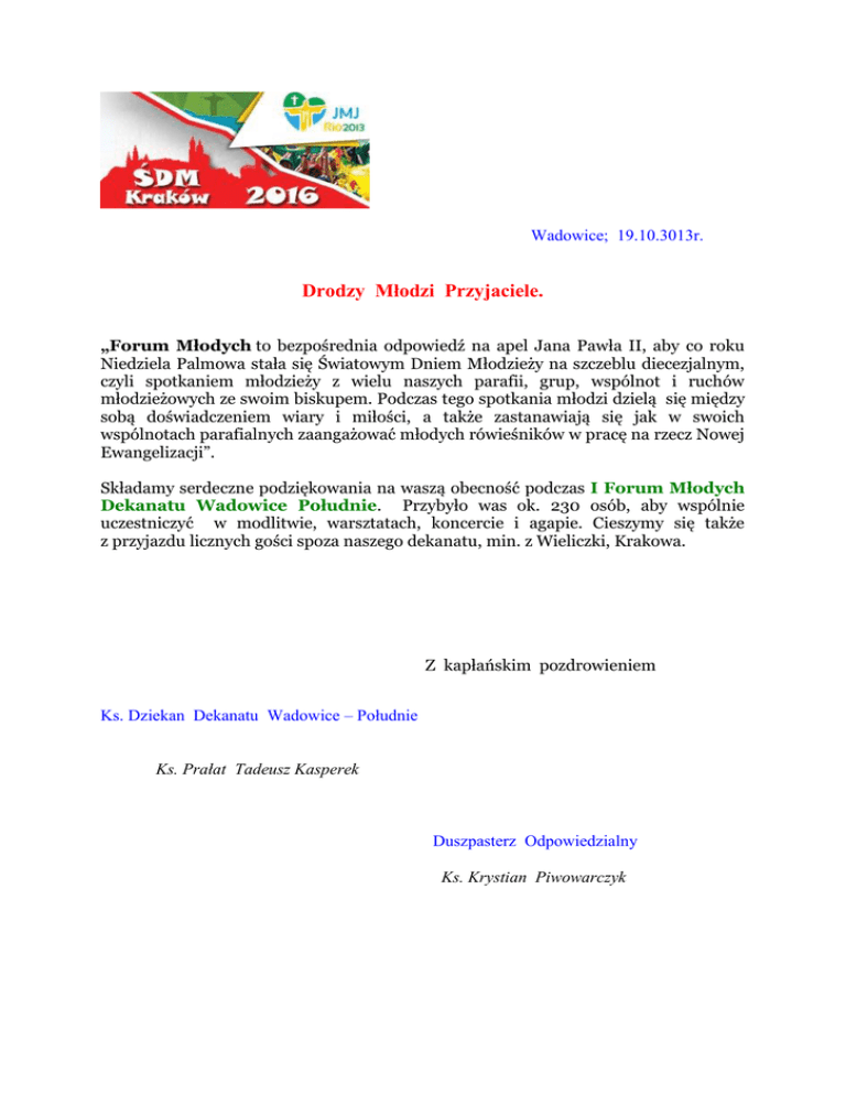 Wadowice; 19.10.3013r. Drodzy Młodzi Przyjaciele. „Forum Młodych to bezpośrednia odpowiedź na apel Jana Pawła II, aby co roku Niedziela Palmowa stała się Światowym Dniem Młodzieży na szczeblu diecezjalnym, czyli spotkaniem młodzieży z wielu naszych parafii, grup, wspólnot i ruchów młodzieżowych ze swoim biskupem. Podczas tego spotkania młodzi dzielą się między sobą doświadczeniem wiary i miłości, a także zastanawiają się jak w swoich wspólnotach parafialnych zaangażować młodych rówieśników w pracę na rzecz Nowej Ewangelizacji”. Składamy serdeczne podziękowania na waszą obecność podczas I Forum Młodych Dekanatu Wadowice Południe. Przybyło was ok. 230 osób, aby wspólnie uczestniczyć w modlitwie, warsztatach, koncercie i agapie. Cieszymy się także z przyjazdu licznych gości spoza naszego dekanatu, min. z Wieliczki, Krakowa. Z kapłańskim pozdrowieniem Ks. Dziekan Dekanatu Wadowice – Południe Ks. Prałat Tadeusz Kasperek Duszpasterz Odpowiedzialny Ks. Krystian Piwowarczyk