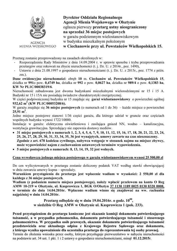 Dyrektor Oddziału Regionalnego Agencji Mienia Wojskowego w Olsztynie ogłasza pierwszy przetarg ustny nieograniczony na sprzedaż 36 miejsc postojowych w garażu podziemnym wielostanowiskowym w budynku mieszkalnym położonym w Ciechanowie przy ul. Powstańców Wielkopolskich 15. Przetarg zostanie przeprowadzony na zasadach określonych w: - Rozporządzeniu Rady Ministrów z dnia 14.09.2004 r. w sprawie sposobu i trybu przeprowadzania przetargów oraz rokowań na zbycie nieruchomości (t. j. Dz. U. z 2014r., poz. 1490), - Ustawie z dnia 21.08.1997 o gospodarce nieruchomościami (t. j. Dz. U. z 2015r., poz. 1774 z późn. zm.). Dane ewidencyjne nieruchomości: obręb 10 m. Ciechanów ul. Powstańców Wielkopolskich 15, działka nr 991o pow. 0,4749 ha, działka nr 992 o pow. 0,0627 ha, działka nr 989/4 o pow. 0,1383 ha, KW Nr PL1C/00038319/6. Nieruchomość zabudowana jest dwoma budynkami mieszkalnymi wielorodzinnymi nr 15 i 15 A. Budynki nr 15 i 15A nie posiadają świadectw charakterystyki energetycznej. W części podpiwniczonej budynku nr 15 znajduje się garaż wielostanowiskowy o powierzchni ogólnej 932,62 m2 (KW PL1C/00053208/6). W garażu znajduje się 36 miejsc postojowych (o numerach od 1 do 36) – każde miejsce o powierzchni 25,91 m2. Jedno miejsce postojowe stanowi 1/36 części garażu, dla którego udział w gruncie oraz częściach wspólnych budynku wynosi 1722/10000. Instalacje w garażu: elektryczna oświetleniowa i zasilająca gniazd NN, wodno – kanalizacyjna, wentylacja grawitacyjna. Sprzedający nie zapewnia dostawy mediów. 31 miejsc postojowych o numerach 1, 2, 3, 4, 5, 6, 7, 9, 10, 11, 12, 15, 16, 17, 18, 20, 21, 22, 23, 24, 25, 26, 27, 28, 29, 30, 31, 33, 34, 35, 36 jest wynajętych, umowy zawarte na czas nieoznaczony. Zgodnie z art. 678 kodeksu cywilnego, nabywca wstępuje w stosunek najmu na miejsce zbywcy, może wypowiedzieć najem z zachowaniem ustawowych terminów wypowiedzenia. 5 miejsc postojowych o numerach: 8, 13, 14, 19, 32 jest wolnych. Cena wywoławcza jednego miejsca postojowego w garażu wielostanowiskowym wynosi 25 500,00 zł Do cen wylicytowanych w przetargu zostanie doliczony podatek VAT według stawki obowiązującej w dniu zawarcia umowy kupna – sprzedaży. Warunkiem przystąpienia do przetargu jest wpłacenie wadium w wysokości: 2 550,00 zł dla każdego z 36 miejsc postojowych. Wadium (z podaniem numeru miejsca postojowego), należy wpłacić przelewem na konto O Reg AMW 10-219 w Olsztynie, ul. Kasprowicza 1, BGK O/Olsztyn 37 1130 1189 0025 0130 8320 0008, w terminie do dnia 14.04.2016r. Wpłacone wadium winno się znajdować na ww. rachunku najpóźniej w dniu 14.04.2016r. Przetarg odbędzie się w dniu 19.04.2016r. o godz. 1000, w siedzibie O Reg AMW w Olsztynie ul. Kasprowicza 1 (pok. 233). Przed przystąpieniem do przetargu konieczne jest okazanie komisji dokumentu potwierdzającego tożsamość, a w przypadku pełnomocnika, dokumentu potwierdzającego tożsamość i stosownego pełnomocnictwa. W przypadku osób prawnych, okazanie dokumentu potwierdzającego tożsamość przedstawiciela oraz aktualnego odpisu z Krajowego Rejestru Sądowego oraz dokumentu, z którego wynika upoważnienie dla uczestnika przetargu do reprezentowania tej osoby prawnej. Termin do złożenia wniosku przez osoby, którym przysługuje pierwszeństwo w nabyciu nieruchomości na podstawie art. 34 ust. 1 pkt. 1 i 2 ustawy o gospodarce nieruchomościami, minął 01.12.2015r. Osoby, którym przysługiwało pierwszeństwo w nabyciu, o których mowa w ustawie z dnia 8 lipca 2005r. o realizacji prawa do rekompensaty z tytułu pozostawienia nieruchomości poza obecnymi granicami RP (Dz. U. z 2014r., poz. 1090) zwalnia się z obowiązku wniesienia wadium, jeżeli w terminie do dnia 14.04.2016r. zgłoszą uczestnictwo w przetargu przedstawiając oryginał zaświadczenia lub decyzji potwierdzającej prawo do rekompensaty z adnotacją wojewody o wybranej formie realizacji prawa do rekompensaty zgodnie z art. 7 i 8 powołanej ustawy oraz złożą pisemne zobowiązanie do uiszczenia kwoty równej wysokości wadium ustalonego w razie uchylenia się od zawarcia umowy. W dniu przetargu (przed jego otwarciem) powinny także okazać komisji, wypisy z rejestrów, o których mowa w art. 19 powołanej ustawy. Wadium wpłacone przez uczestnika, który przetarg wygrał zostanie zaliczone na poczet ceny nabycia. Osobom, które przetarg przegrały, wadium zostanie niezwłocznie zwrócone. Nie podpisanie protokołu z przetargu z przyczyn niezależnych od Agencji oraz nie przystąpienie bez usprawiedliwienia do zawarcia umowy w miejscu i w terminie wskazanym przez Agencję, może spowodować odstąpienie organizatora przetargu od zawarcia umowy i zgodnie z Art. 41 ust 2 ustawy z dnia 21.08.1997r. o gospodarce nieruchomościami (t. j. Dz. U. z 2015r., poz. 1774) wpłacone wadium nie podlega zwrotowi. Wygrywający przetarg będzie zobowiązany do zapłaty ceny ustalonej w drodze przetargu (pomniejszonej o wpłacone wadium) na cztery dni przed zawarciem notarialnej umowy kupna - sprzedaży, pokrycia kosztów związanych z zawarciem aktu notarialnego i opłatą sądową. W przypadku cudzoziemców mają zastosowanie przepisy ustawy z dnia 24.03.1920r. o nabywaniu nieruchomości przez cudzoziemców (t. j. D z. U. z 2014 r., poz. 1380 z późn. zm.). Szczegółowych informacji dotyczących przetargu udzielają pracownicy OON AMW w Olsztynie ul. Kasprowicza 1 pok. 214, tel.: (89) 536-32-37 lub (89) 536-31-31, 693 080 653. Nieruchomość można obejrzeć po uzgodnieniu telefonicznym w dniach od poniedziałku do piątku w godz. 8 00 – 15 00, tel.: (22) 775 29 88. Dyrektor Oddziału Regionalnego AMW Olsztyn może odwołać przetarg podając przyczynę. Olsztyn, 07.03.2016r.