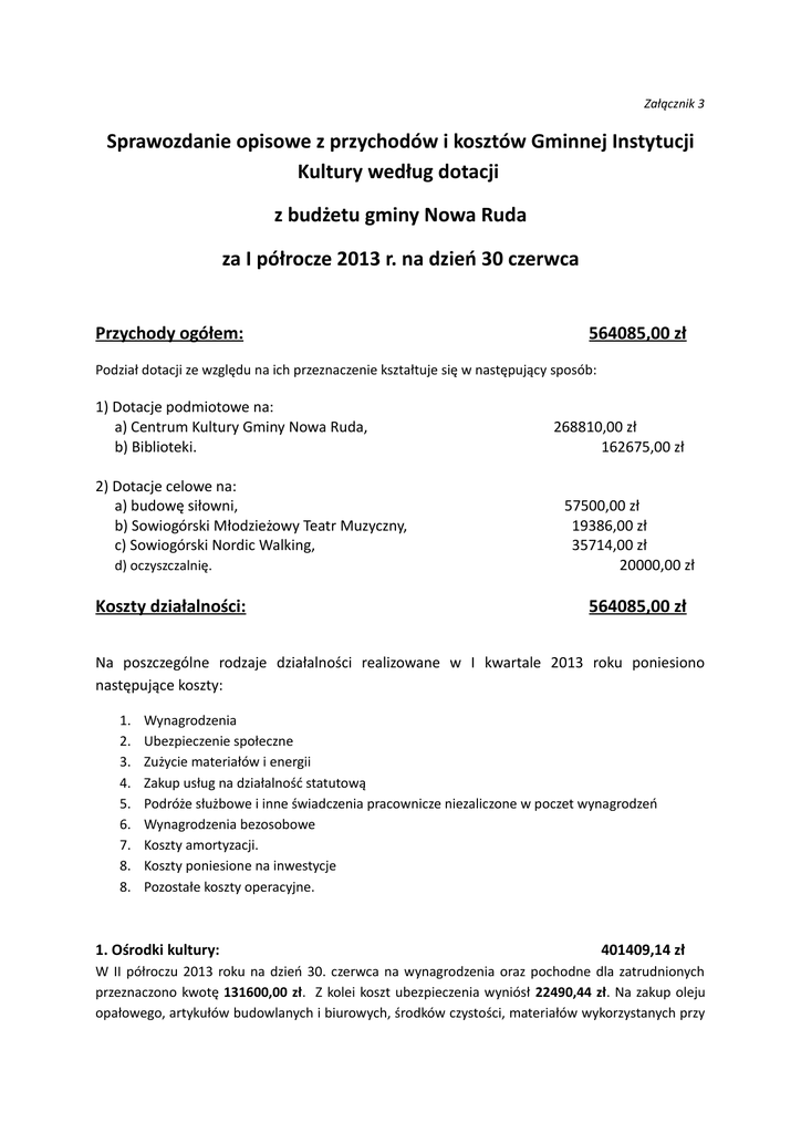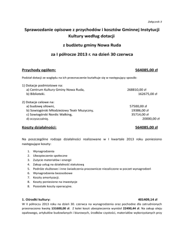 Załącznik 3 Sprawozdanie opisowe z przychodów i kosztów Gminnej Instytucji Kultury według dotacji z budżetu gminy Nowa Ruda za I półrocze 2013 r. na dzień 30 czerwca Przychody ogółem: 564085,00 zł Podział dotacji ze względu na ich przeznaczenie kształtuje się w następujący sposób: 1) Dotacje podmiotowe na: a) Centrum Kultury Gminy Nowa Ruda, b) Biblioteki. 2) Dotacje celowe na: a) budowę siłowni, b) Sowiogórski Młodzieżowy Teatr Muzyczny, c) Sowiogórski Nordic Walking, d) oczyszczalnię. Koszty działalności: 268810,00 zł 162675,00 zł 57500,00 zł 19386,00 zł 35714,00 zł 20000,00 zł 564085,00 zł Na poszczególne rodzaje działalności realizowane w I kwartale 2013 roku poniesiono następujące koszty: 1. 2. 3. 4. 5. 6. 7. 8. 8. Wynagrodzenia Ubezpieczenie społeczne Zużycie materiałów i energii Zakup usług na działalność statutową Podróże służbowe i inne świadczenia pracownicze niezaliczone w poczet wynagrodzeń Wynagrodzenia bezosobowe Koszty amortyzacji. Koszty poniesione na inwestycje Pozostałe koszty operacyjne. 1. Ośrodki kultury: 401409,14 zł W II półroczu 2013 roku na dzień 30. czerwca na wynagrodzenia oraz pochodne dla zatrudnionych przeznaczono kwotę 131600,00 zł. Z kolei koszt ubezpieczenia wyniósł 22490,44 zł. Na zakup oleju opałowego, artykułów budowlanych i biurowych, środków czystości, materiałów wykorzystanych przy aranżacji przedsięwzięć związanych z działalnością statutową oraz nagród rzeczowych dla uczestników różnego rodzaju imprez sportowych organizowanych przez Centrum Kultury Gminy Nowa Ruda przeznaczono 54042,23 zł. Na energię elektryczną i wodę przeznaczono środki w wysokości 5229,59 zł. W zakresie usług, z wyłączeniem zużycia materiałów niezbędnych przy realizacji cyklicznych wydarzeń kulturalnych i sportowych, poniesiono następujące koszty: - na budowę siłowni i Sali fitness przeznaczono 57500,00 zł, - realizacja projektów „Sowiogórski Nordic” oraz „Sowiogórski Teatr Muzyczny” kosztowała 55100,00 zł, Inne koszty poniesione przez naszą Instytucję: - na budowę oczyszczalni ścieków przekazano 20000,00 zł, - pozostałe usługi (bankowe, telekomunikacyjne, komunalne, rzemieślnicze) wyniosły 21402,18 zł, - dokonanie odpisu na ZFŚS w wysokości 5000,00 zł, - podróże służbowe, ryczałty samochodowe i inne świadczenia pracownicze niezaliczone w poczet wynagrodzeń opłacono kwotą 3966,75 zł, - wynagrodzenia bezosobowe dotyczące umów cywilno – prawnych z instruktorami poszczególnych sekcji dały w wyniku kwotę 24898,95 zł. - podatki i opłaty PZU wyniosły 179,00 zł. 2. Biblioteki: 162675,86 zł W ramach działalności Bibliotek w II półroczu 2013 roku na dzień 30. czerwca na płace, premie oraz nagrody dla pracowników przeznaczono 110485,01 zł. Składki na ubezpieczenia społeczne wyniosły 24296,14 zł. Kolejno kwotą 6023,16 zł opłacono zakup książek oraz poniesiono nakłady konsumpcji materiałów i wyposażenia w wysokości 4750,00 zł. Zużycie wody i energii elektrycznej sprowadziły się do sumy 1978,20 zł. Ryczałty samochodowe, podróże służbowe oraz inne świadczenia na rzecz pracowników, niewliczone do kosztów wynagrodzeń wyniosły 3243,35 zł. Prócz tego dokonano odpisu na ZFŚS w kwocie 3300,00 zł oraz poświęcono 8600,00 zł na usługi dodatkowe. Należności oraz zobowiązania wymagalne nie występują Sporządziła dn.23-07-2013r. Główny księgowy Jadwiga Grabowiecka – Jabłońska Zatwierdzam dn. 23-07-2013 r. Z-ca Dyrektora Centrum Kultury Gminy Nowa Ruda Urszula Poźniak Sprawozdanie opisowe z przychodów i kosztów Gminnej Instytucji Kultury według ogólnych przychodów za II kwartał 2013 roku Przychody ogółem: 625394,63 zł. Podział przychodów ze względu na źródła ich pochodzenia kształtuje się w następujący sposób: 1. Dotacje: 575851,43 zł a) z budżetu organizatora, b) celowe na nakłady inwestycyjne. W II kwartale 2013 roku na aktywność bieżącą CKGNR otrzymaliśmy z budżetu gminy 268810,00 zł. Z kolei na działalność Bibliotek przyznano dofinansowanie w wysokości 162675,00 zł. Dotacje celowe wyniosły 144366,43 zł i obejmowały: – – – – – dotację celową na budowę siłowni w kwocie 57500,00 zł dotację calową na realizację programu „ORANGE” wynoszącą 11766,43 zł dotację celową na Sowiogórski Młodzieżowy Teatr Muzyczny w wysokości 19386,00 zł, dotację celową na Sowiogórski Nordic Walking równającą się kwocie 35714,00 zł, 20000 zł w ramach dotacji celowej na oczyszczalnię. 2. Pozostałe przychody: 49543,20 zł W skład pozostałych przychodów operacyjnych weszły przychody z działalności statutowej w wysokości 23217,70 zł oraz planowane przychody z tytułu zasądzenia zwrotu nienależnie pobranych świadczeń w kwocie 15597,43 zł. Ponadto sprzedaż usług pozostałych pozwoliła uzyskać 10728,07 zł. Stan środków na początku roku wynosił 43,39 zł. Koszty ogółem: 616251,30 zł Na poszczególne rodzaje działalności realizowane w I półroczu 2013 roku poniesiono następujące koszty: 1. Wynagrodzenia. 2. Ubezpieczenie społeczne. 3. Zużycie materiałów i energii. 4. Zakup usług na działalność statutową. 5. Podróże służbowe i inne świadczenia pracownicze niezaliczone w poczet wynagrodzeń. 6. Wynagrodzenia bezosobowe. 7. Koszty amortyzacji. 8. Koszty poniesione na inwestycje. 1. Ośrodki kultury: 446009,79 zł Do dnia 30 Czerwca 2013 roku na wynagrodzenia oraz pochodne dla zatrudnionych przeznaczono kwotę 131600,00 zł. Z kolei koszt ubezpieczenia wyniósł 22490,44 zł. Na zakup oleju opałowego, artykułów budowlanych i biurowych, środków czystości przeznaczono kwotę 45551,25 zł a na zakup materiałów wykorzystanych przy aranżacji przedsięwzięć związanych z działalnością statutową oraz nagród rzeczowych dla uczestników różnego rodzaju imprez sportowych organizowanych przez Centrum 