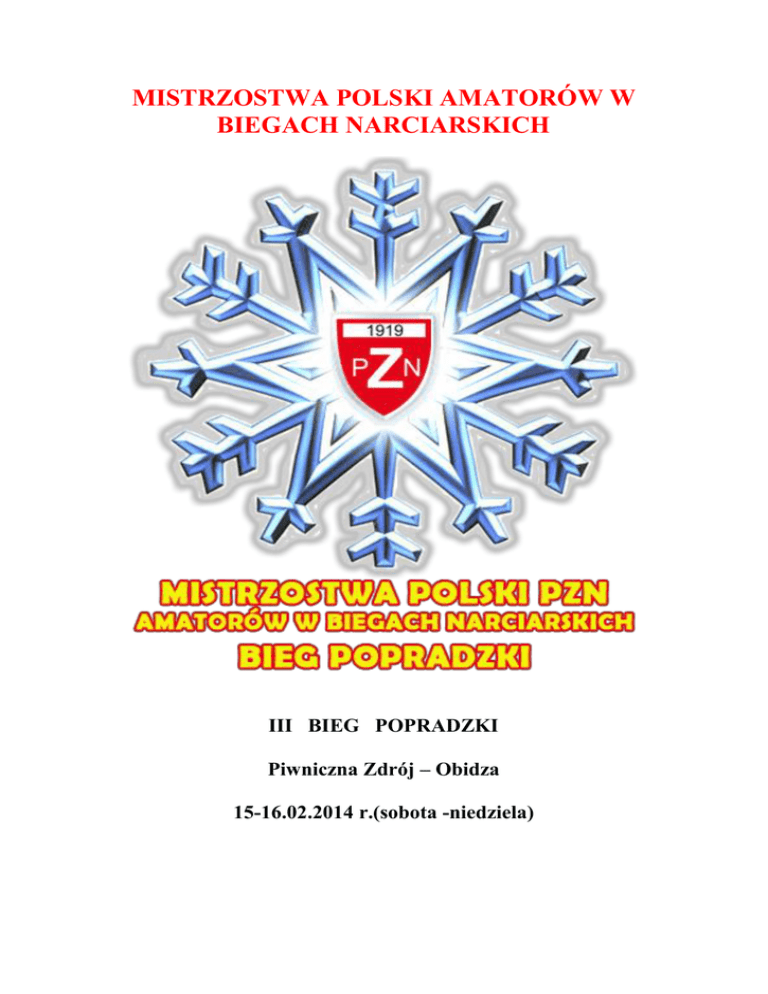 MISTRZOSTWA POLSKI AMATORÓW W BIEGACH NARCIARSKICH III BIEG POPRADZKI Piwniczna Zdrój – Obidza 15-16.02.2014 r.(sobota -niedziela) REGULAMIN 1. Cel : Promocja, uatrakcyjnienie i rozwój biegów narciarskich Upowszechnianie aktywnego wypoczynku na nartach Promocja piwniczańskiego regionu w którym odbywają się Mistrzostwa Polski Amatorów w biegach narciarskich Uzyskanie punktów do klasyfikacji Pucharu Polski w Amatorskich Mistrzostw Polski w biegach narciarskich 2. Organizator Miasto i Gmina Piwniczna – Zdrój Współorganizatorzy: Polski Związek Narciarski Portal www.biegi.pzn.pl Portal www.biegpopradzki.pl Ski Hotel Sucha Dolina Szkoła Podstawowa w Kosarzyskach 3. Patronat medialny: Polski Związek Narciarski www.pzn.pl Marszałek Województwa Małopolskiego Gazeta Krakowska Gazeta ,,Znad Popradu” Portal informacyjny UMiG Piwniczna Zdrój www.piwniczna.pl Portal informacyjny www.piwniczna.info Portal narciarski www.skipol.pl Portal informacyjny www.beskid.tv Portal informacyjny www.sadeczanin.info Portal biegowy www.nsrunners.pl Portal narciarski www.nabiegowkach.pl Stowarzyszenie www.uksryter.pl Stowarzyszenie www.visegardmaraton.pl Portal biegowy www.maratonypolskie.pl Portal biegowy www.biegigorskie.pl Portal informacyjny www.imprezysportowe.pl Portal informacyjny www.skilitmanova.sk Radio i portal informacyjny www.radiostan.fm Portal biegowy www.festiwalbiegowy.pl Radio i portal informacyjny www.rdn.pl Portal informacyjny www.podhale-sport.pl Portal biegowy www.kosciuszkorun.com.au Współpraca: Komisariat Policji w Piwnicznej – Zdroju Odział Karpackiej Straży Granicznej w Nowym Sączu Miejsko – Gminny Związek OSP w Piwnicznej – Zdroju Zakład Leśno-Drzewny w Piwnicznej Zdroju MGOK w Piwnicznej – Zdroju MZGKiM w Piwnicznej – Zdroju Agencja wydawnicza WIT Hotel ,,Perła Południa” Rytro www.motoquad.net.pl 4. Termin i miejsce: Biegi odbędą się 15 lutego 2014 r. (sobota) technika dowolna i 16 lutego (niedziela) technika klasyczna w Piwnicznej - Zdroju na trasach biegowych na Obidzy. 15.02.2013 r.(sobota) Godz.8.00 – 11.00 wydawanie numerów – Polana Obidza Godz.11.45 otwarcie zawodów przez Burmistrza Miasta i Gminy Piwniczna - Zdrój p.Edwarda Bogaczyka Godz.12.00 – Bieg główny (18 km - meżczyźni,12 km – kobiety) - styl dowolny (F) Godz.15.00 – zakończenie zawodów, rozdanie nagród w Ski Hotelu Sucha Dolina 16.02.2013 r.(niedziela) Godz.8.00 – 11.00 wydawanie numerów – Polana Obidza Godz.11.45 otwarcie zawodów przez Burmistrza Miasta i Gminy Piwniczna - Zdrój p.Edwarda Bogaczyka Godz.12.00 – Bieg główny (18 km - meżczyźni,12 km – kobiety) - styl klasyczny (CL) Godz.15.00 – zakończenie zawodów, rozdanie nagród w Ski Hotelu Sucha Dolina 5. Uczestnictwo: - każdy chętny, na własną odpowiedzialność, posiadając aktualne badania lekarskie oraz stosowne ubezpieczenie - limit czasu w biegu głównym 2 godz.15 min. - opłata startowa – do 31 stycznia 2014 r. - 30 zł za jeden bieg od 1 lutego 2014 r. – 60 zł za jeden bieg w dniu zawodów 15 i 16 lutego 80 zł za jeden bieg Weryfikację ostateczną o przyznaniu statusu amatora w Mistrzostwach Polski w biegach narciarskich podejmuje PZN. 6. Zgłoszenia : - Zgłoszenia należy przesłać na link (technika dowolna) – sobota https://online.datasport.pl/zapisy/portal/organizator.php - Zgłoszenia należy przesłać na link (technika klasyczna) – niedziela http://online.datasport.pl/zapisy/portal/zawody.php?zawody=1037 w terminie do 14.02.2014 r .(piątek) do godz.19.00. Limit zgłoszeń – 300 zawodników ! na jeden bieg 7. Grupy wiekowe i dystanse: mężczyźni – bieg główny dystans 18 km kobiety – bieg główny dystans 12 km grupy wiekowe kobiet i mężczyzn zgodnie z regulaminem w ramach Amatorskich Mistrzostw Polski: Kategorie K 16-19 Wiek 16-19 Rocznik 1998-1995 K 20 20-29 1994-1985 K 30 30-39 1984-1975 K 40 40-49 1974-1965 K 50 50-59 1964-1955 K 60 60-69 1954-1945 K 70 > 70 > 1944 > Dystans Mężczyźni 18 km Kobiety 12 km Mężczyźni 18 km Kobiety 12 km Mężczyźni 18 km Kobiety 12 km Mężczyźni 18 km Kobiety 12 km Mężczyźni 18 km Kobiety 12 km Mężczyźni 12 km Kobiety 6 km Mężczyźni 12 km Kobiety 6 km Technika biegu – styl klasyczny (CL) i styl dowolny (F),start wspólny. Uwaga ! w przypadku pogorszenia sie warunków śniegowych dystanse mogą być skrócone. 8. Klasyfikacja zawodów 1m. 2m. 3m. 4m. 5m. 6m. 7m. 8m. 100 pkt. 80 pkt. 60 pkt. 50 pkt. 45 pkt. 40 pkt. 36 pkt. 32 pkt. 9m. 10m. 11m. 12m. 13m. 14m. 15m. 16m. 29 pkt. 26 pkt. 24 pkt. 22 pkt. 20 pkt. 18 pkt. 16 pkt. 15 pkt. 17m. 18m. 19m. 20m. 21m. 22m. 23m. 24m. 14 pkt. 13 pkt. 12 pkt. 11 pkt. 10 pkt. 9 pkt. 8 pkt. 7 pkt. 25m. 26m. 27m. 28m. 29m. 30m. 6 pkt. 5 pkt. 4 pkt. 3 pkt. 2 pkt. 1 pkt. 9. Nagrody Według załącznika do regulaminu Ponadto Pamiątkowe medale dla wszystkich uczestników biegu Medale i dyplomy za I,II,III miejsce w kategoriach wiekowych (złoty srebrny, brązowy) Nagrody specjalne według propozycji sponsorów Losowanie atrakcyjnych nagród Dojazd :Nowy Sącz – Stary Sącz – Rytro –Piwniczna Zdrój – w stronę granicy państwa ze Słowacją następnie w prawo skręt na Kosarzyska -Sucha Dolina – Obidza 9. Noclegi i wyżywienie we własnym zakresie Noclegi: http://www.piwniczna.pl 10. Postanowienia końcowe: Dodatkowe informacje można uzyskać w Biurze Zawodów Tel.18-4464117 oraz na stronie: www.biegpopradzki.pl Organizator zastrzega sobie prawo interpretacji spraw nie ujętych w powyższym regulaminie Uczestnicy startują na własną odpowiedzialność, organizator nie ubezpiecza zawodników. Organizator nie ponosi odpowiedzialności za wypadki na trasie biegowej Dla uczestników organizator zapewnia ciepły posiłek. Start i meta : na Obidzy na wysokości około 930 m.n.p.m. Organizator w dniu zawodów zapewnia dojazd na Obidzę od parkingu pod Suchą Doliną. Na start zawodów najlepiej dojść ze Ski Hotelu na Suchej Dolinie szlakiem Czerwonym 