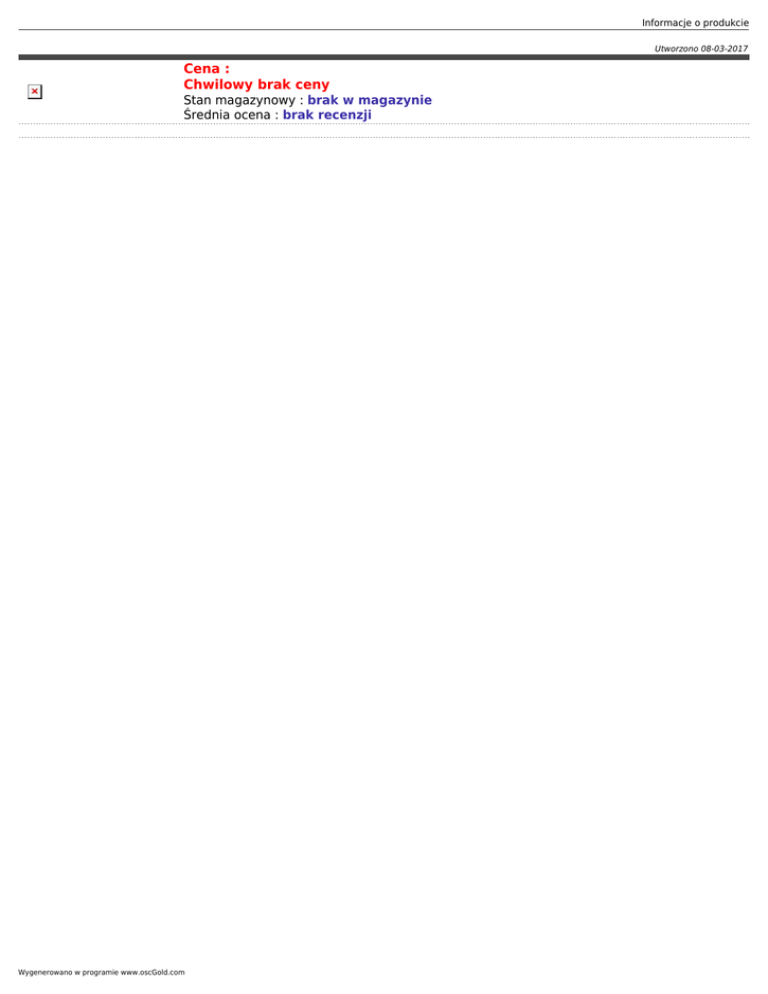 Informacje o produkcie Utworzono 08-03-2017 Cena : Chwilowy brak ceny Stan magazynowy : brak w magazynie Średnia ocena : brak recenzji Wygenerowano w programie www.oscGold.com