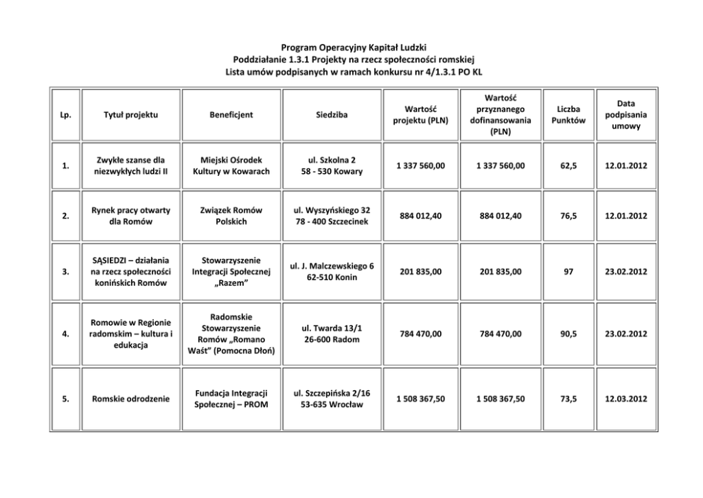 Program Operacyjny Kapitał Ludzki Poddziałanie 1.3.1 Projekty na rzecz społeczności romskiej Lista umów podpisanych w ramach konkursu nr 4/1.3.1 PO KL Wartość przyznanego dofinansowania (PLN) Liczba Punktów Data podpisania umowy Lp. Tytuł projektu Beneficjent Siedziba Wartość projektu (PLN) 1. Zwykłe szanse dla niezwykłych ludzi II Miejski Ośrodek Kultury w Kowarach ul. Szkolna 2 58 - 530 Kowary 1 337 560,00 1 337 560,00 62,5 12.01.2012 2. Rynek pracy otwarty dla Romów Związek Romów Polskich ul. Wyszyńskiego 32 78 - 400 Szczecinek 884 012,40 884 012,40 76,5 12.01.2012 3. SĄSIEDZI – działania na rzecz społeczności konińskich Romów Stowarzyszenie Integracji Społecznej „Razem” ul. J. Malczewskiego 6 62-510 Konin 201 835,00 201 835,00 97 23.02.2012 4. Romowie w Regionie radomskim – kultura i edukacja Radomskie Stowarzyszenie Romów „Romano Waśt” (Pomocna Dłoń) ul. Twarda 13/1 26-600 Radom 784 470,00 784 470,00 90,5 23.02.2012 5. Romskie odrodzenie Fundacja Integracji Społecznej – PROM ul. Szczepińska 2/16 53-635 Wrocław 1 508 367,50 1 508 367,50 73,5 12.03.2012 6. Edukacja – lepsze jutro Centrum Doradztwa i Informacji dla Romów w Polsce 7. TĘCZA – program aktywizacji radomskich Romów oraz promocja kultury romskiej BEST COMPLEX Beata Staniszewska ul. Zagonowa 12 26-600 Radom 448 696,40 448 696,40 74,5 05.04.2012 8. Romowie – pełnoprawni obywatele polscy Oddział Rejonowy Polskiego Czerwonego Krzyża we Włocławku ul. Zduńska 14 87-800 Włocławek 755 173,85 755 173,85 81,5 24.04.2012 9. Czego nie wiemy o Romach Polskie Radio Regionalna Rozgłośnia w Warszawie „Radio dla Ciebie” S.A. ul. Myśliwiecka 3/5/7 00-459 Warszawa 439 052,00 439 052,00 75,5 08.05.2012 10. Czas na zmiany – aktywizacja społecznozawodowa kujawskopomorskich Romów Stowarzyszenie Promocji Zdrowia i Pomocy Rodzinie „Równe Szanse” ul. Legionów 40a/4 87-100 Toruń 677 761,88 677 761,88 102,5 30.05.2012 11. Masz prawo! Fundacja Integracji Społecznej – PROM ul. Szczepińska 2/16 53-635 Wrocław 694 642,00 694 642,00 69,5 19.06.2012 ul. Kopernika 7 95-200 Pabianice 1 379 197,00 1 379 197,00 103 26.03.2012 12. Feder dziwipen Instalterm Nowoczesne Systemy Grzewcze Jarosław Dziwiński 13. Edukacja i praca miarą rozwoju społecznozawodowego Romów Ośrodek Szkolenia BIAŁECKI Sp. z o.o ul. Energetyków 8 44-330 Jastrzębie Zdrój 2 627 877,00 2 627 877,00 102,5 28.06.2012 14. Romska praca filarem awansu społecznoekonomicznego Romów Stowarzyszenie Kulturalno Społeczne Romów „Centrum Kultury Romów w Polsce” ul. Katedralna 2/3 33-100 Tarnów 700 550,00 700 550,00 73,5 13.07.2012 15. Wszyscy razem Powiat kłodzki/ Powiatowe Centrum Pomocy Rodzinie w Kłodzku ul. Kościuszki 2 57-300 Kłodzko 1 226 946,00 1 226 946,00 97 13.07.2012 16. Staże zawodowe dla Romów Związek Romów Polskich ul. Wyszyńskiego 32 78-400 Szczecinek 1 086 196,60 1 086 196,60 72,5 25.07.2012 17. Lepsza droga do przyszłości – działania na rzecz zawierciańskich Romów Gmina Zawiercie/ Miejski Ośrodek Pomocy Społecznej ul. Piłsudskiego 47 42-400 Zawiercie 1 421 269,20 1 421 269,20 71 01.08.2012 Os. WSK 3/4 58-160 Świebodzice 244 500,00 244 500,00 89 22.06.2012 18. Wiedza źródłem tolerancji Miasto Zabrze/ Powiatowy Urząd Pracy w Zabrzu ul. Roosevelta 40a 41-800 Zabrze 509 955,00 509 955,00 71,5 22.08.2012 19. Różni obywatele – jedno miasto Gmina Wrocław pl. Nowy Targ 1-8 50-141 Wrocław 3 086 430,00 3 086 430,00 67,5 23.08.2012 20. Podnoszenie kwalifikacji i zatrudnienie drogą do integracji Stowarzyszenie Romów w Polsce ul. Berka Joselewicza 5 32-600 Oświęcim 1 022 680,02 1 022 680,02 82,5 27.09.2012 21. Romska przedsiębiorczość AGEMA Ewa Zaborowska ul. Kujawska 3/44 00-793 Warszawa 380 003,90 380 003,90 66,5 04.10.2012 22. ROMSKA DROGA KARIERY – kompleksowy program aktywizacji społecznozawodowej Romów z Małopolski i Podkarpacia Wyższa Szkoła Ubezpieczeń w Krakowie ul. Karmelicka 32 31-128 Kraków 1 720 372,60 1 720 372,60 97,5 08.10.2012 23. Nowy zawód, nowe umiejętności – nowa szansa na sukces Stowarzyszenie Romów w Krakowie os. Złotej Jesieni 6/33 31-831 Kraków 169 608,50 169 608,50 106,5 15.10.2012 24. Pindźiar Man. Aktywizacja zawodowa, edukacyjna i integracyjna zabrzańskich Romów Centrum Edukacji i Warunków Rozwoju ul. Szkolna 4 44-178 Przyszowice 1 710 708,03 1 710 708,03 77,5 09.11.2012 25. Dialog szansą na zmianę Stowarzyszenie Romów w Polsce ul. Berka Joselewicza 5 32-600 Oświęcim 999 530,00 999 530,00 88 22.11.2012 26. Szczęśliwa dłoń Bachtało Wast Fundacja Razem ul. Beethovena 1-2 58-300 Wałbrzych 576 406,80 576 406,80 75 27.11.2012 27 PARASOL – program aktywizacji radomskich Romów oraz promocja kultury romskiej BEST COMPLEX Beata Staniszewska ul. Zagonowa 12 26-600 Radom 492 405,20 492 405,20 61 28.02.2013 Anna Siejda Dyrektor WWPE