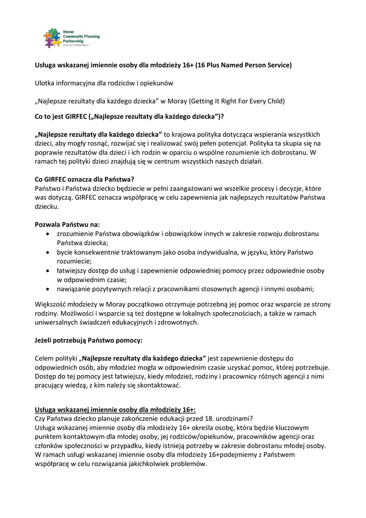 Usługa wskazanej imiennie osoby dla młodzieży 16+ (16 Plus Named Person Service) Ulotka informacyjna dla rodziców i opiekunów „Najlepsze rezultaty dla każdego dziecka” w Moray (Getting It Right For Every Child) Co to jest GIRFEC („Najlepsze rezultaty dla każdego dziecka”)? „Najlepsze rezultaty dla każdego dziecka” to krajowa polityka dotycząca wspierania wszystkich dzieci, aby mogły rosnąć, rozwijać się i realizować swój pełen potencjał. Polityka ta skupia się na poprawie rezultatów dla dzieci i ich rodzin w oparciu o wspólne rozumienie ich dobrostanu. W ramach tej polityki dzieci znajdują się w centrum wszystkich naszych działań. Co GIRFEC oznacza dla Państwa? Państwo i Państwa dziecko będziecie w pełni zaangażowani we wszelkie procesy i decyzje, które was dotyczą. GIRFEC oznacza współpracę w celu zapewnienia jak najlepszych rezultatów Państwa dziecku. Pozwala Państwu na: zrozumienie Państwa obowiązków i obowiązków innych w zakresie rozwoju dobrostanu Państwa dziecka; bycie konsekwentnie traktowanym jako osoba indywidualna, w języku, który Państwo rozumiecie; łatwiejszy dostęp do usług i zapewnienie odpowiedniej pomocy przez odpowiednie osoby w odpowiednim czasie; nawiązanie pozytywnych relacji z pracownikami stosownych agencji i innymi osobami; Większość młodzieży w Moray początkowo otrzymuje potrzebną jej pomoc oraz wsparcie ze strony rodziny. Możliwości i wsparcie są też dostępne w lokalnych społecznościach, a także w ramach uniwersalnych świadczeń edukacyjnych i zdrowotnych. Jeżeli potrzebują Państwo pomocy: Celem polityki „Najlepsze rezultaty dla każdego dziecka” jest zapewnienie dostępu do odpowiednich osób, aby młodzież mogła w odpowiednim czasie uzyskać pomoc, której potrzebuje. Dostęp do tej pomocy jest łatwiejszy, kiedy młodzież, rodziny i pracownicy różnych agencji z nimi pracujący wiedzą, z kim należy się skontaktować. Usługa wskazanej imiennie osoby dla młodzieży 16+: Czy Państwa dziecko planuje zakończenie edukacji przed 18. urodzinami? Usługa wskazanej imiennie osoby dla młodzieży 16+ określa osobę, która będzie kluczowym punktem kontaktowym dla młodej osoby, jej rodziców/opiekunów, pracowników agencji oraz członków społeczności w przypadku, kiedy istnieją potrzeby w zakresie dobrostanu młodej osoby. W ramach usługi wskazanej imiennie osoby dla młodzieży 16+podejmiemy z Państwem współpracę w celu rozwiązania jakichkolwiek problemów. Pracownik koordynujący: W niektórych przypadkach okazuje się, że młoda osoba wymaga bardziej skoordynowanej lub/i specjalistycznej pomocy. W przypadku, kiedy w sprawę Państwa dziecka zaangażowane są co najmniej dwie agencje, zapewniające jemu oraz Państwa rodzinie pomoc, wskazany zostanie pracownik koordynujący, który będzie zarządzał procesem oceny i planowania, aby uzgodnić dalsze postępowanie. Udostępnianie informacji: Kiedy różne agencje współpracują ze sobą, aby zapewnić wsparcie młodej osobie i jej rodzinie/opiekunom, wówczas konieczne jest udostępnianie istotnych informacji, aby pomoc mogła zostać zapewniona jak najszybciej. Dzieci, młodzież i rodzice/opiekunowie zostaną poinformowani zanim udostępnimy informacje na ich temat, z wyjątkiem sytuacji, kiedy dziecku groziłoby w związku z tym ryzyko krzywdy. Rezultaty dotyczące dobrostanu Poniższych osiem przykładów dbania o dobrostan to tylko niektóre sposoby na wspieranie prawidłowego rozwoju młodej osoby. BEZPIECZEŃSTWO Jest w regularnym kontakcie z ważnymi, zapewniającymi jej wsparcie osobami dorosłymi, którym może zaufać. ZDROWIE Nie odczuwa presji ze strony innych, aby robić coś, co może być ryzykowne dla jej zdrowia. AKTYWNOŚĆ Aktywnie angażuje się w zajęcia sportowe i rekreacyjne w swojej społeczności. PIELĘGNACJA Czuje, że okazuje się jej miłość i zaufanie. REALIZOWANIE POTENCJAŁU Uczy się nowych umiejętności i wykorzystuje je w pokonywaniu nowych wyzwań. SZACUNEK Jest traktowana jako odrębna osoba przez rodziców/opiekunów – mająca swoje potrzeby, oczekiwania i aspiracje. ODPOWIEDZIALNOŚĆ Stosuje bezpieczne praktyki i zachowuje się odpowiedzialnie w sytuacjach potencjalnie wysokiego ryzyka. PRZYNALEŻNOŚĆ Wykazuje pewność siebie i posiada umiejętności, aby zmierzyć się z problemami i wyzwaniami codziennego życia. Jeżeli chcieliby Państwo uzyskać dodatkowe informacje: należy zwrócić się do osób, które służą Państwu pomocą, np. zespołu ds. usługi wskazanej imiennie osoby dla młodzieży 16+, nauczyciela, pracownika opieki społecznej, wolontariusza lub pracownika programu rozwoju umiejętności Skills Development Scotland; osoby te powinny być w stanie odpowiedzieć na Państwa pytania lub znaleźć właściwą odpowiedź; www.moray.gov.uk www.scotland.gov.uk/gettingitright Telefon kontaktowy do zespołu ds. usługi wskazanej imiennie osoby dla młodzieży 16+ to: 01343 563 374 (w godzinach urzędowania). E-mail: [email protected] Jeżeli mają Państwo obawy dotyczące ryzyka znacznej krzywdy dla siebie lub innej młodej osoby, należy natychmiast zatelefonować do dyżurnego zespołu opieki społecznej (Social Work Triage Team) pod numer 01343 5630900 (w godzinach urzędowania). POZA GODZINAMI URZĘDOWANIA i w nagłych sytuacjach należy zatelefonować do wydziału opieki społecznej pod numer 03457 565656 i/lub na policję pod numer 101.