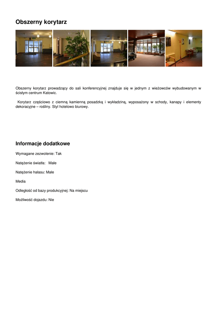 Obszerny korytarz Obszerny korytarz prowadzący do sali konferencyjnej znajduje się w jednym z wieżowców wybudowanym w ścisłym centrum Katowic. Korytarz częściowo z ciemną kamienną posadzką i wykładziną, wyposażony w schody, kanapy i elementy dekoracyjne – rośliny. Styl hotelowo biurowy. Informacje dodatkowe Wymagane zezwolenie: Tak Natężenie światła: Małe Natężenie hałasu: Małe Media Odległość od bazy produkcyjnej: Na miejscu Możliwość dojazdu: Nie Powered by TCPDF (www.tcpdf.org)