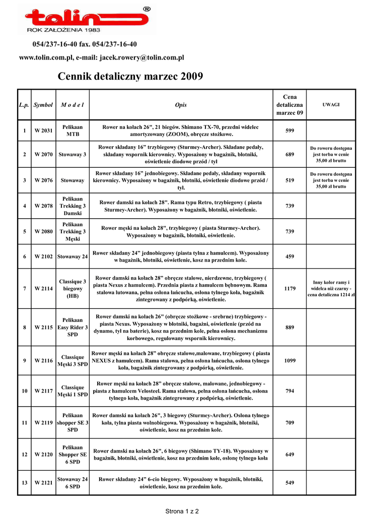 ( 054/237-16-40 fax. 054/237-16-40 www.tolin.com.pl, e-mail: [email protected] Cennik detaliczny marzec 2009 L.p. Symbol Model Opis Cena detaliczna marzec 09 UWAGI 1 W 2031 Pelikaan MTB Rower na kołach 26", 21 biegów. Shimano TX-70, przedni widelec amortyzowany (ZOOM), obręcze stożkowe. 599 2 W 2070 Stowaway 3 Rower składany 16” trzybiegowy (Sturmey-Archer). Składane pedały, składany wspornik kierownicy. Wyposażony w bagażnik, błotniki, oświetlenie diodowe przód / tył 689 Do roweru dostępna jest torba w cenie 35,00 zł brutto 3 W 2076 Stowaway Rower składany 16” jednobiegowy. Składane pedały, składany wspornik kierownicy. Wyposażony w bagażnik, błotniki, oświetlenie diodowe przód / tył. 519 Do roweru dostępna jest torba w cenie 35,00 zł brutto 4 W 2078 Pelikaan Trekking 3 Damski Rower damski na kołach 28". Rama typu Retro, trzybiegowy ( piasta Sturmey-Archer). Wyposażony w bagażnik, błotniki, oświetlenie. 739 5 W 2080 Pelikaan Trekking 3 Męski Rower męski na kołach 28", trzybiegowy ( piasta Sturmey-Archer). Wyposażony w bagażnik, błotniki, oświetlenie. 739 6 W 2102 Stowaway 24 Rower składany 24” jednobiegowy (piasta tylna z hamulcem). Wyposażony w bagażnik, błotniki, oświetlenie, kosz na przednim kole. 459 7 W 2114 Classique 3 biegowy (HB) Rower damski na kołach 28” obręcze stalowe, nierdzewne, trzybiegowy ( piasta Nexus z hamulcem). Przednia piasta z hamulcem bębnowym. Rama stalowa lutowana, pełna osłona łańcucha, osłona tylnego koła, bagażnik zintegrowany z podpórką, oświetlenie. 1179 8 Pelikaan W 2115 Easy Rider 3 SPD Rower damski na kołach 26" (obręcze stożkowe - srebrne) trzybiegowy piasta Nexus. Wyposażony w błotniki, bagażni, oświetlenie (przód na dynamo, tył na baterie), kosz na przednim kole, pełna osłona mechanizmu korbowego, regulowany wspornik kierownicy. 889 9 W 2116 Rower męski na kołach 28” obręcze stalowe,malowane, trzybiegowy ( piasta Classique NEXUS z hamulcem). Rama stalowa, pełna osłona łańcucha, osłona tylnego Męski 3 SPD koła, bagażnik zintegrowany z podpórką, oświetlenie. 1099 10 W 2117 Rower męski na kołach 28” obręcze stalowe, malowane, jednobiegowy Classique piasta z hamulcem Velosteel. Rama stalowa, pełna osłona łańcucha, osłona Męski 1 SPD tylnego koła, bagażnik zintegrowany z podpórką, oświetlenie. 794 11 Pelikaan Rower damski na kołach 26", 3 biegowy (Sturmey-Archer). Osłona tylnego W 2119 shopper SE 3 koła, tylna piasta wolnobiegowa. Wyposażony w bagażnik, błotniki, SPD oświetlenie, kosz na przednim kole. 709 12 W 2120 Pelikaan Shopper SE 6 SPD Rower damski na kołach 26", 6 biegowy (Shimano TY-18). Wyposażony w bagażnik, błotniki, oświetlenie, kosz na przednim kole, osłonę tylnego koła 649 13 W 2121 Stowaway 24 6 SPD Rower składany 24” 6-cio biegowy. Wyposażony w bagażnik, błotniki, oświetlenie, kosz na przednim kole. 549 Strona 1 z 2 Inny kolor ramy i widelca niż czarny cena detaliczna 1214 zł ( 054/237-16-40 fax. 054/237-16-40 www.tolin.com.pl, e-mail: [email protected] Cennik detaliczny marzec 2009 L.p. Symbol Model Opis Cena detaliczna marzec 09 14 W 2123 Pelikaan Shopper 1 SPD Rower damski na kołach 26" opony z paskiem odblaskowym. 1 biegowy (piasta tylna z hamulcem Velosteel). Pełna osłona łańcucha, osłona tylnego koła. Wyposażony w bagażnik, błotniki, oświetlenie, kosz na przednim kole 639 15 W 782 Pelikaan Trekking 6 Męski Rower męski na kołach 28", obrecze stożkowe, 6-cio biegowy (Shimano TX30). Wyposażony w bagażnik, błotniki, oświetlenie. 649 16 W 783 Pelikaan Trekking 6 Damski Rower damski na kołach 28", obręcze stożkowe. Rama typu Retro, 6-cio biegowy (Shimano TX-30). Wyposażony w bagażnik, błotniki, oświetlenie. 649 W 784 Pelikaan Easy Rider Rower damski na kołach 26" (obręcze stożkowe - srebrne), jednobiegowy (piasta z hamulcem), wyposażony w błotniki, bagażni, oświetlenie (przód na dynamo, tył na baterie), kosz na przednim kole, pełna osłona mechanizmu korbowego, regulowany wspornik kierownicy. 699 Classique Rower damski na kołach 28”, jednobiegowy (piasta tylna z hamulcem Velosteel). Rama stalowa lutowana, piast przednia z hamulcem bębnowym, pełna osłona łańcucha, osłona tylnego koła, bagażnik zintegrowany z podpórką, oświetlenie. 889 17 18 W 790 Warunki współpracy Od cen zawartych w cenniku udzielamy następujących upustów: - 20 % przy zakupie na termin do 10 szt. - 25% przy zakupie gotówkowym do 10 szt oraz przy zakupie na termin powyżej 10 szt. - 30% przy zakupie gotówkowym powyżej 10 szt Powyższe upusty nie łączą się Dostawa - do 20 szt. na koszt klienta - powyżej 20 szt na nasz koszt P.P. TOLIN zastrzega sobie zmianę cen zawartych w cenniku. Strona 2 z 2 UWAGI Inny kolor ramy i widelca niż czarny cena detaliczna 924 zł
