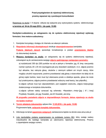Przed przystąpieniem do rejestracji elektronicznej, prosimy zapoznać się z poniższymi komunikatami Rejestracja na studia I i II stopnia odbywa się wyłącznie przy wykorzystaniu systemu elektronicznego w terminie od 04 do 30 maja 2016 r. (do godz. 15:00) Kandydaci-cudzoziemcy po zalogowaniu się do systemu elektronicznej rejestracji wybierają formularz: Inna matura-cudzoziemcy. 1. Kandydaci korzystają z dostępu do Internetu we własnym zakresie. 2. Niepodanie informacji obowiązkowych skutkuje niezarejestrowaniem kandydata. Podanie błędnych danych spowoduje konsekwencje w postaci przeniesienia błędów do dokumentacji studenta. 3. Wszyscy kandydaci na studia, po zalogowaniu się do systemu elektronicznej rejestracji, zobowiązani są do zamieszczenia swojego zdjęcia spełniającego następujące parametry: a) rozdzielczość 300 dpi (300 punktów na cal) w jednym z formatów: jpg, tif, bmp; rzeczywisty rozmiar wydruku 20 x 25 mm (wymagania jak przy dowodach osobistych, m.in. zdjęcie powinno być aktualne, bez nakrycia głowy, okularów z ciemnymi szkłami ani innych rzeczy, które mogłyby utrudnić rozpoznanie, powinno przedstawiać całą głowę z wizerunkiem nie dalej niż do górnej części barków, twarz musi być skierowana prosto w obiektyw aparatu, głowa nie może być przekrzywiona, zdjęcie powinno przedstawiać widoczny owal twarzy, bez półprofilu), b) zdjęcie cyfrowe musi być odpowiednikiem, pod względem wizerunku, zdjęcia tradycyjnego dostarczonego w komplecie dokumentów, c) zdjęcia cyfrowe należy oznaczać wg schematu: <Nazwisko>_<imię>.[jpg | tif | bmp] Przykłady: Kowalski_Jan.jpg; Kowalski_Jan.tif; Kowalski_Jan.bmp. W przypadku posiadania zdjęcia w nieprawidłowym formacie, dalsza rejestracja na studia nie będzie możliwa! 4. Termin składania dokumentów upływa dnia 31.05.2016 r. (do godz. 15:00) Przyjmowane będą wyłącznie komplety dokumentów. 5. Informacja na temat egzaminów wstępnych zamieszczona będzie na stronie www.amuz.edu.pl 6. Listy kandydatów zostaną wygenerowane na podstawie numeru NIU, który zostaje nadany indywidualnie dla każdego kandydata po zakończeniu rejestracji elektronicznej. Prosimy o zapamiętanie swojego numeru. 7. Informacji na temat elektronicznej rejestracji kandydatów na stronie udziela: e-Dydaktyka, pok. 101 tel. 0-61 85-68-978 [email protected] 8. Akademia Muzyczna nie ponosi odpowiedzialności za niemożność rejestracji spowodowaną awariami sieci internetowej lub okresowymi przeciążeniami serwerów. W takich przypadkach kandydat zgłasza się do pok. 101 (e-Dydaktyka); tel. 0-61 85-68-978; [email protected] 9. W przypadku pojawienia się ostrzeżenia przeglądarki internetowej „Wystąpił problem z certyfikatem zabezpieczeń tej witryny sieci Web", prosimy wybrać opcję „Kontynuuj przeglądanie tej witryny sieci Web”. 10. Link do rejestracji: https://e-dziekanat.amuz.edu.pl/e-rekrutacja/?logout=yes