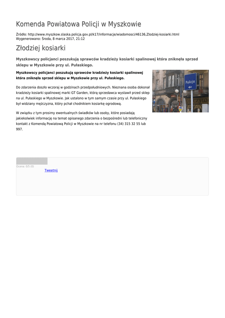 Komenda Powiatowa Policji w Myszkowie Źródło: http://www.myszkow.slaska.policja.gov.pl/k17/informacje/wiadomosci/46136,Zlodziej-kosiarki.html Wygenerowano: Środa, 8 marca 2017, 21:12 Złodziej kosiarki Myszkowscy policjanci poszukują sprawców kradzieży kosiarki spalinowej która zniknęła sprzed sklepu w Myszkowie przy ul. Pułaskiego. Myszkowscy policjanci poszukują sprawców kradzieży kosiarki spalinowej która zniknęła sprzed sklepu w Myszkowie przy ul. Pułaskiego. Do zdarzenia doszło wczoraj w godzinach przedpołudniowych. Nieznana osoba dokonał kradzieży kosiarki spalinowej marki GT Garden, którą sprzedawca wystawił przed sklep na ul. Pułaskiego w Myszkowie. Jak ustalono w tym samym czasie przy ul. Pułaskiego był widziany mężczyzna, który pchał chodnikiem kosiarkę ogrodową. W związku z tym prosimy ewentualnych świadków lub osoby, które posiadają jakiekolwiek informację na temat opisanego zdarzenia o bezpośredni lub telefoniczny kontakt z Komendą Powiatową Policji w Myszkowie na nr telefonu (34) 315 32 55 lub 997. Ocena: 0/5 (0) Tweetnij