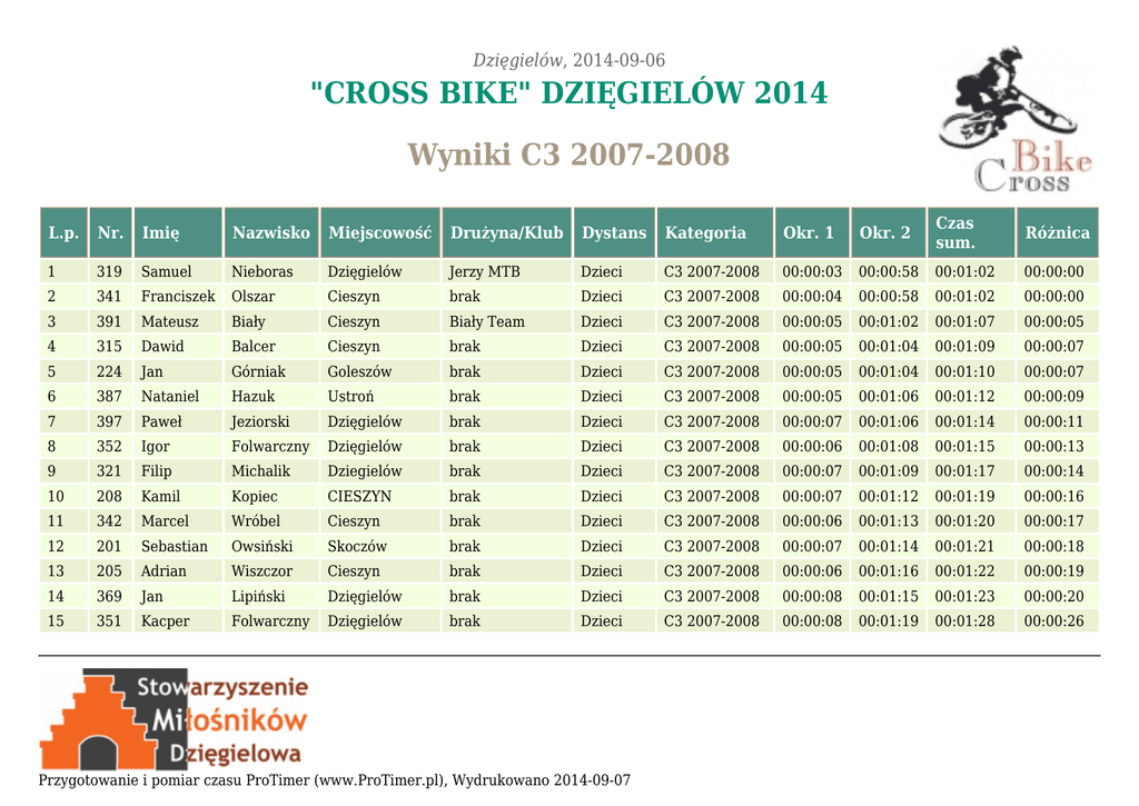 "CROSS BIKE" DZIĘGIELÓW 2014 Wyniki C3 2007-2008