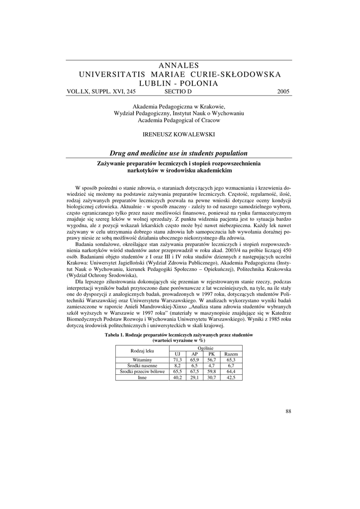 ANNALES UNIVERSITATIS MARIAE CURIE-SKŁODOWSKA LUBLIN - POLONIA VOL.LX, SUPPL. XVI, 245 SECTIO D 2005 Akademia Pedagogiczna w Krakowie, Wydział Pedagogiczny, Instytut Nauk o Wychowaniu Academia Pedagogical of Cracow IRENEUSZ KOWALEWSKI Drug and medicine use in students population Zażywanie preparatów leczniczych i stopień rozpowszechnienia narkotyków w środowisku akademickim W sposób pośredni o stanie zdrowia, o staraniach dotyczących jego wzmacniania i krzewienia dowiedzieć się możemy na podstawie zażywania preparatów leczniczych. Częstość, regularność, ilość, rodzaj zażywanych preparatów leczniczych pozwala na pewne wnioski dotyczące oceny kondycji biologicznej człowieka. Aktualnie - w sposób znaczny - zależy to od naszego samodzielnego wyboru, często ograniczanego tylko przez nasze możliwości finansowe, ponieważ na rynku farmaceutycznym znajduje się szereg leków w wolnej sprzedaży. Z punktu widzenia pacjenta jest to sytuacja bardzo wygodna, ale z pozycji wskazań lekarskich często może być nawet niebezpieczna. Każdy lek nawet zażywany w celu utrzymania dobrego stanu zdrowia lub samopoczucia lub wywołania doraźnej poprawy niesie ze sobą możliwość działania ubocznego niekorzystnego dla zdrowia. Badania sondażowe, określające stan zażywania preparatów leczniczych i stopień rozpowszechnienia narkotyków wśród studentów autor przeprowadził w roku akad. 2003/4 na próbie liczącej 450 osób. Badaniami objęto studentów z I oraz III i IV roku studiów dziennych z następujących uczelni Krakowa: Uniwersytet Jagielloński (Wydział Zdrowia Publicznego), Akademia Pedagogiczna (Instytut Nauk o Wychowaniu, kierunek Pedagogiki Społeczno – Opiekuńczej), Politechnika Krakowska (Wydział Ochrony Środowiska), Dla lepszego zilustrowania dokonujących się przemian w rejestrowanym stanie rzeczy, podczas interpretacji wyników badań przytoczono dane porównawcze z lat wcześniejszych, na tyle, na ile stały one do dyspozycji z analogicznych badań, prowadzonych w 1997 roku, dotyczących studentów Politechniki Warszawskiej oraz Uniwersytetu Warszawskiego. W analizach wykorzystano wyniki badań zamieszczone w raporcie Anieli Mandrowskiej-Xinxo „Analiza stanu zdrowia studentów wybranych szkół wyższych w Warszawie w 1997 roku” (materiały w maszynopisie znajdujące się w Katedrze Biomedycznych Podstaw Rozwoju i Wychowania Uniwersytetu Warszawskiego). Wyniki z 1985 roku dotyczą środowisk politechnicznych i uniwersyteckich w skali krajowej. Tabela 1. Rodzaje preparatów leczniczych zażywanych przez studentów (wartości wyrażone w %) Rodzaj leku Witaminy Środki nasenne Środki przeciw bólowe Inne UJ 71,3 8,2 65,5 40,2 Ogólnie AP PK 65,9 56,7 6,5 4,7 67,5 59,8 29,1 30,7 Razem 65,3 6,7 64,4 42,5 88 Tabela 2. Częstotliwość zażywania witamin (wartości wyrażone w %) Witaminy Codziennie Kilka razy w miesiącu W czasie choroby Nigdy UJ 24,0 21,6 28,1 26,3 Ogólnie AP PK 18,7 12,6 23,6 26,8 24,4 18,1 33,3 42,5 Razem 19,0 23,8 24,0 33,0 Tabela 3. Częstotliwość zażywania środków uspokajających (wartości wyrażone w %) Środki uspokajające Kilka razy na tydzień Kilka razy w miesiącu Kilka razy w roku Nigdy Brak odpowiedzi UJ 6,4 31,6 6,4 17,0 38,6 Ogólnie AP PK 2,4 0,8 8,9 3,9 9,8 14,2 26,0 29,1 52,8 52,0 Razem 3,6 16,6 9,7 23,3 46,8 Tabela 4. Częstotliwość zażywania środków nasennych (wartości wyrażone w %) Ogólnie Środki nasenne Codziennie Kilka razy w miesiącu Kilka razy w roku Nigdy UJ AP PK Razem 2,3 4,1 7,6 86,0 0,8 2,4 4,1 92,7 0,8 1,6 2,4 95,3 1,4 2,9 5,0 90,7 Witaminy syntetyczne Według danych z 1985 roku i 1997 roku odsetek studentów zażywających witaminy nie uległ zmianom i jest podobny wynosząc dla środowiska politechnicznego około 64% a dla uniwersyteckiego około 69%. Aktualnie nieznacznie zwiększyła się ilość studentów Uniwersytetu zażywających witaminy(o 2,3%), ale zmniejszył się odsetek studentów z Politechniki prawie o 3%. Regularnie, codziennie stosuje witaminy niezmiennie około 20% respondentów. Środki uspokajające Według badań poprzednich zażywało środki uspokajające od 13-21% ankietowanych. Obecnie zauważa się bardzo poważną zmianę w regularności ich przyjmowania w środowisku uniwersyteckim. Według badań z 1985 roku i 1997 roku codziennie zażywało leki uspokajające około 1% studentów. Aktualnie obserwuje się 6- krotny wzrost odsetka respondentów z Uniwersytetu Jagiellońskiego i prawie 2,5- krotny z Akademii Pedagogicznej aplikujących sobie środki uspokajające codziennie. Studenci Politechniki Krakowskiej zażywają ten typ leków codziennie tylko w odsetku 0,8%. Środki nasenne W sposób niepokojący zwiększyło się zażywanie leków nasennych. W 1985 roku w środowisku uniwersyteckim środki nasenne zażywało 3,5% studentów a 2% w środowisku politechnicznym. Nikt nie zażywał ich codziennie. Także jeszcze w 1997 roku żaden z ankietowanych nie zgłaszał konieczności regularnego zażywania tych leków, natomiast aktualnie w Uniwersytecie Jagiellońskim aż 2,3% studentów zażywa codziennie środki nasenne. Obecnie rozpowszechnienie zażywania środków nasennych w środowisku studenckim jest duże i obserwuje się podwojenie odsetka respondentów zażywających je. Środki przeciwbólowe Obserwuje się wysokie odsetki studentów zażywających regularnie środki przeciwbólowe. Stan taki występuje od wielu lat, obecnie ma tendencję wzrostową. Bardzo niebezpieczne jest również łączenie leków przeciwbólowych z lekami nasennymi i uspokajającymi, które może mieć miejsce w przypadku populacji uniwersyteckich, w których spotykamy najczęstsze odsetki używania tych dwóch grup leków. W 1995 roku i 1997 roku zażywało środki przeciwbólowe od 36% do 51% studentów. 89 Aktualnie w środowisku uniwersyteckim używa tych środków blisko 70% respondentów, a w politechnicznym prawie 60%. Szybkość działania przeciwbólowego 
