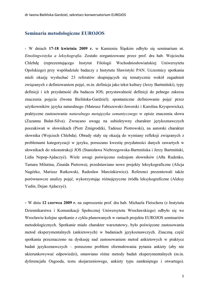 dr Iwona Bielińska-Gardziel, sekretarz konwersatorium EUROJOS Seminaria metodologiczne EUROJOS - W dniach 17-18 kwietnia 2009 r. w Kamieniu Śląskim odbyło się seminarium nt. Etnolingwistyka a leksykografia. Zostało zorganizowane przez prof. dra hab. Wojciecha Chlebdę (reprezentującego Instytut Filologii Wschodniosłowiańskiej Uniwersytetu Opolskiego) przy współudziale badaczy z Instytutu Slawistyki PAN. Uczestnicy spotkania mieli okazję wysłuchać 23 referatów skupiających się tematycznie wokół zagadnień związanych z definiowaniem pojęć, m.in. definicja jako tekst kultury (Jerzy Bartmiński), typy definicji i ich przydatność dla badacza JOS; przystawalność definicji do pełnego zakresu znaczenia pojęcia (Iwona Bielińska-Gardziel); spontaniczne definiowanie pojęć przez użytkowników języka naturalnego (Mateusz Fabiszewski-Jaworski i Karolina Kryspowicka); praktyczne zastosowanie naturalnego metajęzyka semantycznego w opisie znaczenia słowa (Zuzanna Bułat-Silva). Zwracano uwagę na subiektywny charakter językoznawczych poszukiwań w słownikach (Piotr Żmigrodzki, Tadeusz Piotrowski), na autorski charakter słownika (Wojciech Chlebda). Obrady stały się okazją do wymiany refleksji związanych z problemami kategoryzacji w języku, poruszano kwestię przydatności danych zawartych w słownikach do rekonstrukcji JOS (Stanisława Niebrzegowska-Bartmińska i Jerzy Bartmiński, Lidia Nepop-Ajdaczyć). Wiele uwagi poświęcono rodzajom słowników (Ałła Rudenko, Tamara Milutina, Zinaida Pietrowa), przedstawiano nowe projekty leksykograficzne (Alicja Nagórko, Mariusz Rutkowski, Radosław Marcinkiewicz). Referenci prezentowali także porównawcze analizy pojęć, wykorzystując różnojęzyczne źródła leksykograficzne (Aleksy Yudin, Dejan Ajdaczyć). - W dniu 12 czerwca 2009 r. na zaproszenie prof. dra hab. Michaela Fleischera (z Instytutu Dziennikarstwa i Komunikacji Społecznej Uniwersytetu Wrocławskiego) odbyło się we Wrocławiu kolejne spotkanie z cyklu planowanych w ramach projektu EUROJOS seminariów metodologicznych. Spotkanie miało charakter warsztatowy, było poświęcone zastosowaniu metod eksperymentalnych (ankietowych) w badaniach językoznawczych. Znaczną część spotkania przeznaczono na dyskusję nad zastosowaniem metod ankietowych w praktyce badań językoznawczych – poruszono problem sformułowania pytania ankiety (aby nie ukierunkowywać odpowiedzi), omawiano różne metody badań eksperymentalnych (m.in. dyferencjału Osgooda, testu skojarzeniowego, ankiety typu zamkniętego i otwartego). 1 dr Iwona Bielińska-Gardziel, sekretarz konwersatorium EUROJOS Rozmowa koncentrowała się również wokół sposobu przeprowadzenia badań ankietowych oraz porównywania uzyskanych wyników. Zebrani nawiązywali również do kwestii wyboru metodologii oraz sposobu postępowania przy wykorzystywaniu różnych danych (systemowych, ankietowych, tekstowych) do opisu pojęć – pojawiła się wątpliwość, czy każdy z trzech typów danych miałaby opracowywać jedna osoba, czy też specjaliści od ankiet powinni podsumować wyniki badania eksperymentalnego. Prof. Michael Fleischer (wraz ze współpracownikami, dr Anetą Siemens i drem Markiem Grechem) zadeklarował przygotowanie kwestionariusza do badań ankietowych wybranych pojęć (DOM, EUROPA, WOLNOŚĆ, PRACA, HONOR). Kilka osób spośród obecnych zadeklarowało gotowość opracowania konkretnych pojęć (DOM, WOLNOŚĆ, EUROPA). 2