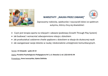 WARSZTATY „NAUKA PRZEZ ZABAWĘ” Zapraszamy rodziców, opiekunów i nauczycieli dzieci ze spektrum autyzmu, którzy chcą się dowiedzieć: Czym jest terapia oparta na relacjach i zabawie (podstawy Growth Through Play System) Jak budować i wzmacniać odwzajemnione relacje z dzieckiem Jak przekształcać codzienne chwile spędzone z dzieckiem w okazje do skutecznej nauki Jak zaangażować swoje dziecko w naukę i doskonalenie umiejętności komunikacyjnych. Termin: 21 listopada – godz.10-13 Zapisy: Poradnia Psychologiczno-Pedagogiczna Nr 5, ul. Otwocka 3, tel. (22) 619 01 94 Prowadzący: Anna Leszczyńska, Sylwia Zielińska