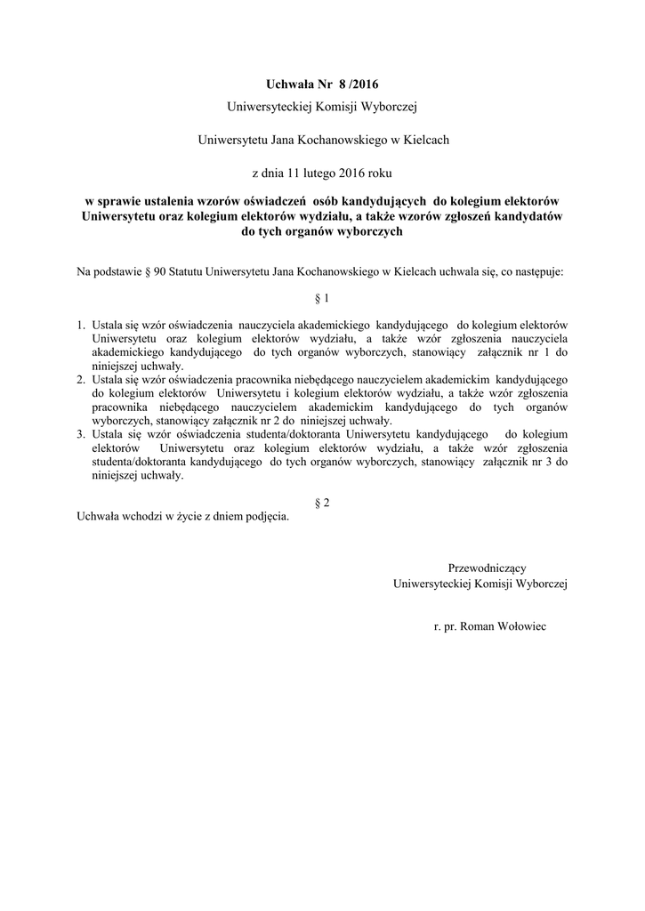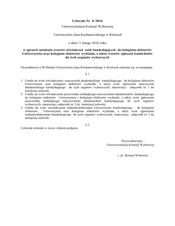 Uchwała Nr 8 /2016 Uniwersyteckiej Komisji Wyborczej Uniwersytetu Jana Kochanowskiego w Kielcach z dnia 11 lutego 2016 roku w sprawie ustalenia wzorów oświadczeń osób kandydujących do kolegium elektorów Uniwersytetu oraz kolegium elektorów wydziału, a także wzorów zgłoszeń kandydatów do tych organów wyborczych Na podstawie § 90 Statutu Uniwersytetu Jana Kochanowskiego w Kielcach uchwala się, co następuje: §1 1. Ustala się wzór oświadczenia nauczyciela akademickiego kandydującego do kolegium elektorów Uniwersytetu oraz kolegium elektorów wydziału, a także wzór zgłoszenia nauczyciela akademickiego kandydującego do tych organów wyborczych, stanowiący załącznik nr 1 do niniejszej uchwały. 2. Ustala się wzór oświadczenia pracownika niebędącego nauczycielem akademickim kandydującego do kolegium elektorów Uniwersytetu i kolegium elektorów wydziału, a także wzór zgłoszenia pracownika niebędącego nauczycielem akademickim kandydującego do tych organów wyborczych, stanowiący załącznik nr 2 do niniejszej uchwały. 3. Ustala się wzór oświadczenia studenta/doktoranta Uniwersytetu kandydującego do kolegium elektorów Uniwersytetu oraz kolegium elektorów wydziału, a także wzór zgłoszenia studenta/doktoranta kandydującego do tych organów wyborczych, stanowiący załącznik nr 3 do niniejszej uchwały. §2 Uchwała wchodzi w życie z dniem podjęcia. Przewodniczący Uniwersyteckiej Komisji Wyborczej r. pr. Roman Wołowiec Załącznik nr 1 Kielce, dnia …………………………………. Oświadczenie nauczyciela akademickiego Ja niżej podpisana/y ……………………………………………….. niniejszym wyrażam zgodę na (imię i nazwisko) kandydowanie do kolegium elektorów Uniwersytetu/Wydziału*. Jednocześnie oświadczam, posiadam bierne prawo wyborcze w Uniwersytecie, tj.: że 1) nie przekroczyłam/em wieku emerytalnego; 2) jestem zatrudniony/a w Uniwersytecie jako podstawowym miejscu pracy. ……………………………………. podpis kandydatki/a * właściwe podkreślić Bierne prawo wyborcze (prawo wybieralności) przysługuje nauczycielom akademickim zatrudnionym w Uczelni jako podstawowym miejscu pracy, którzy nie ukończyli sześćdziesiątego siódmego roku życia, a w przypadku osób posiadających tytuł profesora – siedemdziesiątego roku życia. str. 1 Zgłoszenie kandydatury do kolegium elektorów Uniwersytetu/Wydziału*………………………………………… Popieram kandydaturę ………………………………………………………………………….… do (imię i nazwisko) kolegium elektorów Uniwersytetu /Wydziału*: Lp. Imię i nazwisko Podpis osoby zgłaszającej Wskazanie kurii akademickiej, do której należy osoba posiadająca czynne prawo wyborcze** *właściwe podkreślić ** wpisać przynależność do właściwej kurii akademickiej: nauczyciel akademicki, pracownik niebędący nauczycielem akademickim, student lub doktorant Zgłoszenie wypełniają wyłącznie osoby mające czynne prawo wyborcze w Uniwersytecie, tj.: 1) nauczyciele akademiccy zatrudnieni w Uniwersytecie jako podstawowym miejscu pracy, 2) pracownicy Uniwersytetu niebędący nauczycielami akademickimi zatrudnieni w pełnym wymiarze czasu pracy, 3) studenci Uniwersytetu, 4) doktoranci Uniwersytetu. Każdemu wyborcy przysługuje prawo zgłoszenia takiej liczby kandydatów, jaka ma być wybrana w danej grupie do danego kolegium elektorów. str. 2 Załącznik nr 2 Kielce, dnia …………………………………. Oświadczenie pracownika niebędącego nauczycielem akademickim Ja niżej podpisana/y ……………………………………………….. niniejszym wyrażam zgodę na (imię i nazwisko) kandydowanie do kolegium elektorów Uniwersytetu/Wydziału*. Jednocześnie oświadczam, że posiadam bierne prawo wyborcze w Uniwersytecie, zatrudniony/a w Uniwersytecie w pełnym wymiarze czasu pracy. tj. jestem ……………………………………. podpis kandydatki/a * właściwe podkreślić Bierne prawo wyborcze (prawo wybieralności) przysługuje pracownikom niebędącym nauczycielami akademickimi zatrudnionym w pełnym wymiarze czasu pracy str. 1 Zgłoszenie kandydatury do kolegium elektorów Uniwersytetu/Wydziału*………………………………………… Popieram kandydaturę ………………………………………………………………………….… do (imię i nazwisko) kolegium elektorów Uniwersytetu /Wydziału*: Lp. Imię i nazwisko Podpis osoby zgłaszającej Wskazanie kurii akademickiej, do której należy osoba posiadająca czynne prawo wyborcze** *właściwe podkreślić **wpisać: nauczyciel akademicki, pracownik niebędący nauczycielem akademickim, student lub doktorant Zgłoszenie wypełniają wyłącznie osoby mające czynne prawo wyborcze w Uniwersytecie, tj.: 1) nauczyciele akademiccy zatrudnieni w Uniwersytecie jako podstawowym miejscu pracy, 2) pracownicy Uniwersytetu niebędący nauczycielami akademickimi zatrudnionymi w pełnym wymiarze czasu pracy, 3) studenci Uniwersytetu, 4) doktoranci Uniwersytetu. Każdemu wyborcy przysługuje prawo zgłoszenia takiej liczby kandydatów, jaka ma być wybrana w danej grupie do danego kolegium elektorów. str. 2 Załącznik nr 3 Kielce, dnia …………………………………. Oświadczenie studenta/doktoranta* Ja niżej podpisana/y ……………………………………………….. niniejszym wyrażam zgodę na (imię i nazwisko) kandydowanie do kolegium elektorów Uniwersytetu/Wydziału*. Jednocześnie oświadczam, że posiadam bierne prawo wyborcze w Uniwersytecie, studentem/doktorantem* w Uniwersytecie. tj. jestem ……………………………………. podpis kandydatki/a * właściwe podkreślić Bierne prawo wyborcze (prawo wybieralności) przysługuje studentom oraz doktorantom. str. 1 Zgłoszenie kandydatury do kolegium elektorów Uniwersytetu/Wydziału*……………………………