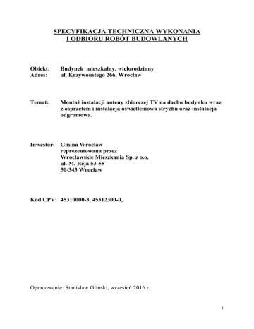 SPECYFIKACJA TECHNICZNA WYKONANIA I ODBIORU ROBÓT BUDOWLANYCH Obiekt: Adres: Budynek mieszkalny, wielorodzinny ul. Krzywoustego 266, Wrocław Temat: Montaż instalacji anteny zbiorczej TV na dachu budynku wraz z osprzętem i instalacja oświetleniowa strychu oraz instalacja odgromowa. Inwestor: Gmina Wrocław reprezentowana przez Wrocławskie Mieszkania Sp. z o.o. ul. M. Reja 53-55 50-343 Wrocław Kod CPV: 45310000-3, 45312300-0, Opracowanie: Stanisław Gliński, wrzesień 2016 r. 1 Spis treści : 1. Część ogólna 1.1. Przedmiot szczegółowej specyfikacji technicznej 1.2. Zakres stosowania szczegółowej specyfikacji technicznej 1.3. Przedmiot z zakresu robót objętych specyfikacją techniczną 2. Materiały 2.1. Ogólne wymagania dotyczące właściwości materiałów 3. Wymagania dotyczące wykonania robót 3.1. Układanie kabli 3.2. Sposób wykonania instalacji TV 3.3. Sposób wykonania instalacji oświetlenia strychu 3.4. Sposób wykonania instalacji odgromowej 4. Przepisy związane 2 1. Część ogólna 1.1. Przedmiot szczegółowej specyfikacji technicznej Przedmiotem niniejszej specyfikacji technicznej są wymagania dotyczące wykonania i odbioru robót związanych z układaniem i montażem, a następnie uruchomieniem elementów instalacji antenowej wraz z instalacją oświetlenia strychu i instalacją odgromową w budynku mieszkalnym położonym przy ul. Krzywoustego 266 we Wrocławiu. 1.2. Zakres stosowania szczegółowej specyfikacji technicznej Szczegółowa specyfikacja techniczna jest stosowana, jako dokument przetargowy przy zlecaniu i realizacji robót wymienionych w pkt. 1.1. Odstępstwa od wymagań podanych w niniejszej specyfikacji mogą mieć miejsce tylko w przypadkach prostych robót o niewielkim znaczeniu, dla których istnieje pewność, że podstawowe wymagania bądź spełnione przy zastosowaniu metod wykonania wynikających z doświadczenia oraz uznanych reguł i zasad sztuki budowlanej. 1.3. Przedmiot z zakresu robót objętych specyfikacją techniczną Zakres robót instalacji antenowej obejmuje: − prowadzenie tras kablowych do anten RTV, − montaż masztów i wzmacniaczy antenowych, − prowadzenie tras kablowych do gniazd RTV do i w lokalu mieszkalnym użytkownika, − prowadzenie tras kablowych zasilających wzmacniacze antenowe, − prowadzenie tras kablowych zasilających oświetlenie strychu, − montaż łączników i opraw oświetleniowych, − montaż gniazd RTV w lokalu mieszkalnym użytkownika, − prowadzenie tras instalacji odgromowej wraz z robotami towarzyszącymi, − uruchomienie urządzeń, − pomiary elektryczne, − prace wykończeniowe i towarzyszące. 2. Materiały 2.1. Ogólne wymagania dotyczące właściwości materiałów Do wykonania i montażu instalacji, urządzeń elektrycznych i odbiorników energii elektrycznej w obiektach budowlanych należy stosować przewody, kable, osprzęt oraz aparaturę i urządzenia elektryczne posiadające dopuszczenie do stosowania w budownictwie. Za dopuszczone do obrotu i stosowania uznaje się wyroby, dla których producent lub jego upoważniony przedstawiciel: − dokonał oceny zgodności z wymaganiami dokumentu odniesienia według określonego systemu oceny zgodności, − wydał deklarację zgodności z dokumentami odniesienia, takimi jak: zharmonizowane specyfikacje techniczne, normy opracowane przez Międzynarodową Komisję Elektrotechniczną (IEC) i wprowadzone do zbioru Polskich Norm, normy krajowe opracowane z uwzględnieniem przepisów bezpieczeństwa Międzynarodowej Komisji ds. Przepisów Dotyczących Zatwierdzenia Sprzętu Elektrycznego (CEE), aprobaty techniczne, − oznakował wyroby znakiem CE lub znakiem budowlanym B zgodnie z obowiązującymi przepisami, − wydał deklarację zgodności z uznanymi regułami sztuki budowlanej, dla wyrobu umieszczonego w określonym przez Komisję Europejską wykazie wyrobów mających niewielkie znaczenie dla zdrowia i bezpieczeństwa, − wydał oświadczenie, że zapewniono zgodność wyrobu budowlanego, dopuszczonego do jednostkowego zastosowania w obiekcie budowlanym, z indywidualną dokumentacją projektową, sporządzoną przez projektanta obiektu lub z nim uzgodnioną. Zastosowanie innych wyrobów, wyżej niewymienionych, jest możliwe pod warunkiem posiadania przez nie dopuszczenia do stosowania w budownictwie i uwzględnienia ich w zatwierdzonym projekcie dotyczącym montażu urządzeń elektroenergetycznych w obiekcie. 3 3. Wymagania dotyczące wykonania robót 3.1. Układanie kabli Przy układaniu kabli należy stosować się do odpowiednich zaleceń producenta (tj. promienia gięcia, siły i sposobu wciągania, itp.). W szczególności należy wystrzegać się nadmiernego ściskania kabli, deptania po kablach ułożonych na podłodze oraz załamywania kabli na elementach konstrukcji kanałów kablowych. Przy odwijaniu kabla z bębna bądź wyciąganiu kabla z pudełka nie należy przekraczać maksymalnej siły ciągnięcia oraz zwracać uwagę na to, by na kablu nie tworzyły się węzły ani supły. 3.2. Sposób wykonania instalacji TV Trasa instalacji antenowej powinna przebiegać bezkolizyjnie z innymi instalacjami i urządzeniami. Montaż instalacji zasilającej 230V wykonać zgodnie z PN-IEC60364-1. Należy zamontować wzmacniacz antenowy o wzmocnieniu 25-40 db (VHF/UHE) umieszczając go na poddaszu budynku. Po zdemontowaniu anten na dachu istniejące kable poprowadzić przez wykonane przepusty na dachu i wprowadzić do skrzynek ze wzmacniaczami, aby podłączyć indywidualnie każdy przewód antenowy. Przewody antenowe – przewód koncentryczny o oporności 75 Ω układać jako instalację podtynkową od wzmacniacza antenowego (rozdziału sygnału) w rurach instalacyjnych wprowadzając je do każdego lokalu mieszkalnego i zakończając je gniazdem RTV. Maszt antenowy należy uziemić, zgodnie z normą PN-EN 62305-2. Zasilanie wzmacniacza poprowadzić z rozdzielnicy administracyjnej budynku przewodem YDYp 3x1,5mm2 pod t