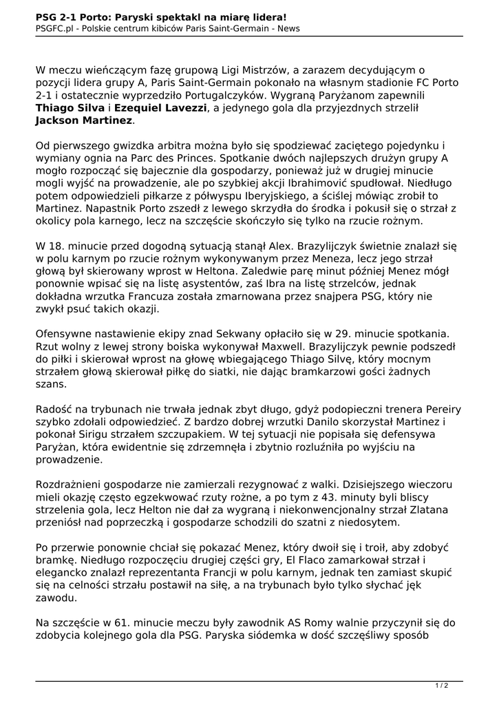 PSG 2-1 Porto: Paryski spektakl na miarę lidera! PSGFC.pl - Polskie centrum kibiców Paris Saint-Germain - News W meczu wieńczącym fazę grupową Ligi Mistrzów, a zarazem decydującym o pozycji lidera grupy A, Paris Saint-Germain pokonało na własnym stadionie FC Porto 2-1 i ostatecznie wyprzedziło Portugalczyków. Wygraną Paryżanom zapewnili Thiago Silva i Ezequiel Lavezzi, a jedynego gola dla przyjezdnych strzelił Jackson Martinez. Od pierwszego gwizdka arbitra można było się spodziewać zaciętego pojedynku i wymiany ognia na Parc des Princes. Spotkanie dwóch najlepszych drużyn grupy A mogło rozpocząć się bajecznie dla gospodarzy, ponieważ już w drugiej minucie mogli wyjść na prowadzenie, ale po szybkiej akcji Ibrahimović spudłował. Niedługo potem odpowiedzieli piłkarze z półwyspu Iberyjskiego, a ściślej mówiąc zrobił to Martinez. Napastnik Porto zszedł z lewego skrzydła do środka i pokusił się o strzał z okolicy pola karnego, lecz na szczęście skończyło się tylko na rzucie rożnym. W 18. minucie przed dogodną sytuacją stanął Alex. Brazylijczyk świetnie znalazł się w polu karnym po rzucie rożnym wykonywanym przez Meneza, lecz jego strzał głową był skierowany wprost w Heltona. Zaledwie parę minut później Menez mógł ponownie wpisać się na listę asystentów, zaś Ibra na listę strzelców, jednak dokładna wrzutka Francuza została zmarnowana przez snajpera PSG, który nie zwykł psuć takich okazji. Ofensywne nastawienie ekipy znad Sekwany opłaciło się w 29. minucie spotkania. Rzut wolny z lewej strony boiska wykonywał Maxwell. Brazylijczyk pewnie podszedł do piłki i skierował wprost na głowę wbiegającego Thiago Silvę, który mocnym strzałem głową skierował piłkę do siatki, nie dając bramkarzowi gości żadnych szans. Radość na trybunach nie trwała jednak zbyt długo, gdyż podopieczni trenera Pereiry szybko zdołali odpowiedzieć. Z bardzo dobrej wrzutki Danilo skorzystał Martinez i pokonał Sirigu strzałem szczupakiem. W tej sytuacji nie popisała się defensywa Paryżan, która ewidentnie się zdrzemnęła i zbytnio rozluźniła po wyjściu na prowadzenie. Rozdrażnieni gospodarze nie zamierzali rezygnować z walki. Dzisiejszego wieczoru mieli okazję często egzekwować rzuty rożne, a po tym z 43. minuty byli bliscy strzelenia gola, lecz Helton nie dał za wygraną i niekonwencjonalny strzał Zlatana przeniósł nad poprzeczką i gospodarze schodzili do szatni z niedosytem. Po przerwie ponownie chciał się pokazać Menez, który dwoił się i troił, aby zdobyć bramkę. Niedługo rozpoczęciu drugiej części gry, El Flaco zamarkował strzał i elegancko znalazł reprezentanta Francji w polu karnym, jednak ten zamiast skupić się na celności strzału postawił na siłę, a na trybunach było tylko słychać jęk zawodu. Na szczęście w 61. minucie meczu były zawodnik AS Romy walnie przyczynił się do zdobycia kolejnego gola dla PSG. Paryska siódemka w dość szczęśliwy sposób 1/2 PSG 2-1 Porto: Paryski spektakl na miarę lidera! PSGFC.pl - Polskie centrum kibiców Paris Saint-Germain - News asystowała Lavezziemu, który oddał strzał z ostrego kąta. Uderzenie Lavezziego nie było wybitnie trudne, lecz w tej sytuacji fatalnie pomylił się Helton i sprezentował gospodarzom bramkę. W odpowiedzi ruszyli Portugalczycy, którzy jeszcze przed meczem zapowiadali, że przyjadą do Paryża po komplet punktów i niespełna 10 minut później zapachniało remisem. Martinez znalazł się sam na sam z Sirigu, ale z tego pojedynku zwycięsko wyszedł Włoch, wybijając piłkę przed pole karne. Tam czyhał na nią Lucho, lecz jego strzał powędrował nad poprzeczką i gospodarze odetchnęli z ulgą. W końcówce Paryżanie szukali szansy na dobicie rywala i spokojne doprowadzenie wygranej do końca. Najpierw strzał wolejem Pastore obronił Hilton, a później El Flaco minimalnie się pomylił uderzając futbolówkę głową. Doliczony czas gry należał zaś do Porto. Przyjezdni mieli ostatnią okazję na zmianę wyniku w doliczonym czasie gry, jednak Otamendi główkował niecelnie wcześniej urywając się defensorom i to PSG zakończyło grupę A na pierwszym miejscu! To był niezwykle emocjonujący wieczór. Spotkanie trzymało w napięciu do ostatnich chwil, ale ostatecznie to podopieczni Carlo Ancelottiego wyszli z tego pojedynku zwycięsko. Ponadto, Paryżanie zagrali o niebo lepiej niż ostatnimi czasy. Sprawiali wrażenie przebudzonych z letargu i zasłużenie wygrali z mocną ekipą z Portugalii. Może to kwestia zmiany taktyki jaką zaserwował nam włoski szkoleniowiec? Paryżanie przez dłuższą część spotkania grali klasycznym ustawieniem 4-4-2 i często dochodzili do sytuacji bramkowych. Wielu zawodników zasługuje na wyróżnienie, zaś na gorzkie słowa Zlatan, który był cieniem samego siebie. Mimo wszystko można na to patrzeć z optymizmem, ponieważ dziś grała drużyna, a nie jedenastu obcych sobie bogatych facetów. Cóż, teraz można już tylko czekać na losowanie fazy pucharowej, które odbędzie się 20 grudnia, a za ten wieczór należy podziękować paryskiej drużynie za wolę walki! Autor: Don Matteo 2/2 Powered by TCPDF (www.tcpdf.org)