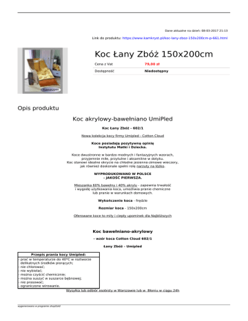 Dane aktualne na dzień: 08-03-2017 21:13 Link do produktu: https://www.kamkryst.pl/koc-lany-zboz-150x200cm-p-661.html Koc Łany Zbóż 150x200cm Cena z Vat 79,00 zł Dostępność Niedostępny Opis produktu Koc akrylowy-bawełniano UmiPled Koc Łany Zbóż - 602/1 Nowa kolekcja kocy firmy Umipled - Cotton Cloud Koce posiadają pozytywną opinię Instytutu Matki i Dziecka. Koce dwustronne w bardzo modnych i fantazyjnych wzorach, przyjemnie miłe, przytulne i aksamitne w dotyku. Koc stanowi idealne okrycie na chłodne jesienno-zimowe wieczory, jak również doskonale spełni rolę narzuty na łóżko. WYPRODUKOWANO W POLSCE - JAKOŚĆ PIERWSZA. Mieszanka 60% bawełny i 40% akrylu - zapewnia trwałość i wygodę użytkowania koca, umożliwia pranie chemiczne lub pranie w warunkach domowych. Wykończenie koca - frędzle Rozmiar koca - 150x200cm Oferowane koce to miły i ciepły upominek dla Najbliższych Koc bawełniano-akrylowy - wzór koca Cotton Cloud 602/1 Łany Zbóż - Umipled Przepis prania kocy Umipled: - prać w temperaturze do 40*C w roztworze delikatnych środków piorących; - nie chlorować; - nie wybielać; - można czyścić chemicznie; - można suszyć w suszarce bębnowej; - nie prasować; - ograniczone wirowanie. Wysyłka lub odbiór osobisty w Warszawie lub w Błoniu w ciągu 24h wygenerowano w programie shopGold wygenerowano w programie shopGold Powered by TCPDF (www.tcpdf.org)
