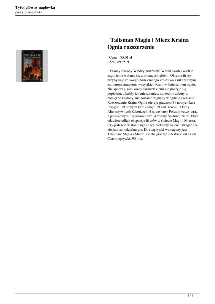 Tytuł główny nagłówka podtytuł nagłówka Talisman Magia i Miecz Kraina Ognia rozszerzenie Cena: 85.01 zł (-5%) 89.95 zł Twórcy Korony Władzy powrócili! Wielki skarb i wielkie zagrożenie wyłania się z płonących głębin. Okrutne ifryty przybywają ze swego podziemnego królestwa z nikczemnym zamiarem strawienia wszystkich Krain w śmiertelnym ogniu. Nie spoczną, nim każdy skrawek ziemi nie pokryje się popiołem, a każdy ich mieszkaniec, uprzednio zakuty w mosiężne kajdany, nie zostanie zagnany w ogniste czeluście. Rozszerzenie Kraina Ognia oferuje graczom 81 nowych kart Przygód, 19 nowych kart Zaklęć, 19 kart Terenu, 3 karty Alternatywnych Zakończeń, 4 nowe karty Poszukiwaczy wraz z plastikowymi figurkami oraz 34 żetony Spalonej ziemi, które odzwierciedlają ekspansję ifrytów w świecie Magii i Miecza. Czy jesteście w stanie ugasić ich piekielny ogień? Uwaga! To nie jest samodzielna gra. Do rozgrywki wymagany jest Talisman: Magia i Miecz. Liczba graczy: 2-6 Wiek: od 14 lat Czas rozgrywki: 90 min. 1/1 Powered by TCPDF (www.tcpdf.org)