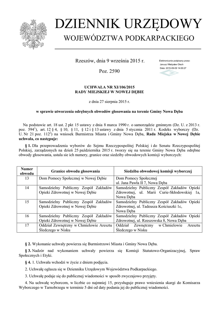DZIENNIK URZĘDOWY WOJEWÓDZTWA PODKARPACKIEGO Rzeszów, dnia 9 września 2015 r. Elektronicznie podpisany przez: Janusz Władysław Olech Data: 2015-09-09 14:00:27 Poz. 2590 UCHWAŁA NR XI/106/2015 RADY MIEJSKIEJ W NOWEJ DĘBIE z dnia 27 sierpnia 2015 r. w sprawie utworzenia odrębnych obwodów głosowania na terenie Gminy Nowa Dęba Na podstawie art. 18 ust. 2 pkt 15 ustawy z dnia 8 marca 1990 r. o samorządzie gminnym (Dz. U. z 2013 r. poz. 5941), art. 12 § 4, § 10, § 11, § 12 i § 13 ustawy z dnia 5 stycznia 2011 r. Kodeks wyborczy (Dz. U. Nr 21 poz. 1122) na wniosek Burmistrza Miasta i Gminy Nowa Dęba, Rada Miejska w Nowej Dębie uchwala, co następuje: § 1. Dla przeprowadzenia wyborów do Sejmu Rzeczypospolitej Polskiej i do Senatu Rzeczypospolitej Polskiej, zarządzonych na dzień 25 października 2015 r. tworzy się na terenie Gminy Nowa Dęba odrębne obwody głosowania, ustala sie ich numery, granice oraz siedziby obwodowych komisji wyborczych: Numer obwodu 13 Granice obwodu głosowania Dom Pomocy Społecznej w Nowej Dębie 14 Samodzielny Publiczny Zespół Zakładów Opieki Zdrowotnej w Nowej Dębie 15 Samodzielny Publiczny Zespół Zakładów Opieki Zdrowotnej w Nowej Dębie 16 Samodzielny Publiczny Zespół Zakładów Opieki Zdrowotnej w Nowej Dębie Oddział Zewnętrzny w Chmielowie Aresztu Śledczego w Nisku 17 Siedziba obwodowej komisji wyborczej Dom Pomocy Społecznej ul. Jana Pawła II 7, Nowa Dęba Samodzielny Publiczny Zespół Zakładów Opieki Zdrowotnej, ul. Marii Curie-Skłodowskiej 1a, Nowa Dęba Samodzielny Publiczny Zespół Zakładów Opieki Zdrowotnej, ul. Tadeusza Kościuszki 1c, Nowa Dęba Samodzielny Publiczny Zespół Zakładów Opieki Zdrowotnej, ul. Rzeszowska 8, Nowa Dęba Oddział Zewnętrzny w Chmielowie Aresztu Śledczego w Nisku § 2. Wykonanie uchwały powierza się Burmistrzowi Miasta i Gminy Nowa Dęba. § 3. Nadzór nad wykonaniem uchwały powierza się Komisji Statutowo-Organizacyjnej, Spraw Społecznych i Etyki. § 4. 1. Uchwała wchodzi w życie z dniem podjęcia. 2. Uchwałę ogłasza się w Dzienniku Urzędowym Województwa Podkarpackiego. 3. Uchwałę podaje się do publicznej wiadomości w sposób zwyczajowo przyjęty. 4. Na uchwałę wyborcom, w liczbie co najmniej 15, przysługuje prawo wniesienia skargi do Komisarza Wyborczego w Tarnobrzegu w terminie 5 dni od daty podania jej do publicznej wiadomości. Dziennik Urzędowy Województwa Podkarpackiego –2– Poz. 2590 5. Po jednym egzemplarzu uchwały przekazuje się niezwłocznie Wojewodzie Podkarpackiemu i Komisarzowi Wyborczemu w Tarnobrzegu. Przewodniczący Rady Wojciech Serafin 1] Zmiany tekstu jednolitego wymienionej ustawy zostały ogłoszone w Dz. U. z 2013 r. poz. 645 i poz. 1318 oraz z 2014 r. poz. 379 i poz. 1072 2] Zmiany tekstu wymienionej ustawy zostały ogłoszone w Dz. U. z 2011 r. Nr 26 poz. 134, Nr 94 poz. 550, Nr 102 poz. 588, Nr 134 poz. 777, Nr 147 poz. 881, Nr 149 po. 889, Nr 171 poz. 1016 i Nr 217 poz. 1281, z 2012 r. poz. 849, poz. 951 i poz. 1529, z 2014 r. poz. 179, poz. 180 i poz. 1072 oraz z 2015 r. poz. 1043, poz. 1044 i poz. 1045