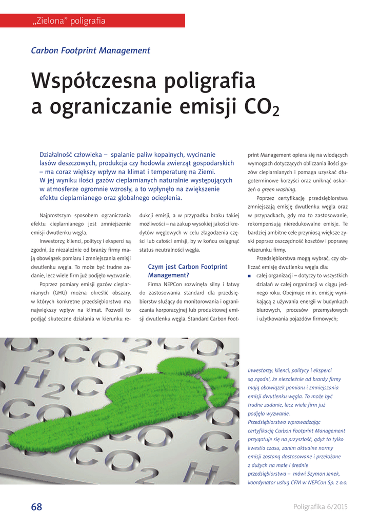 „Zielona” poligrafia Carbon Footprint Management Współczesna poligrafia a ograniczanie emisji CO2 Działalność człowieka – spalanie paliw kopalnych, wycinanie lasów deszczowych, produkcja czy hodowla zwierząt gospodarskich – ma coraz większy wpływ na klimat i temperaturę na Ziemi. W jej wyniku ilości gazów cieplarnianych naturalnie występujących w atmosferze ogromnie wzrosły, a to wpłynęło na zwiększenie efektu cieplarnianego oraz globalnego ocieplenia. print Management opiera się na wiodących wymogach dotyczących obliczania ilości gazów cieplarnianych i pomaga uzyskać długoterminowe korzyści oraz uniknąć oskarżeń o green washing. Poprzez certyfikację przedsiębiorstwa zmniejszają emisję dwutlenku węgla oraz Najprostszym sposobem ograniczania dukcji emisji, a w przypadku braku takiej w przypadkach, gdy ma to zastosowanie, efektu cieplarnianego jest zmniejszenie możliwości – na zakup wysokiej jakości kre- rekompensują nieredukowalne emisje. Te emisji dwutlenku węgla. dytów węglowych w celu złagodzenia czę- bardziej ambitne cele przyniosą większe zy- ści lub całości emisji, by w końcu osiągnąć ski poprzez oszczędność kosztów i poprawę status neutralności węgla. wizerunku firmy. Inwestorzy, klienci, politycy i eksperci są zgodni, że niezależnie od branży firmy mają obowiązek pomiaru i zmniejszania emisji dwutlenku węgla. To może być trudne zadanie, lecz wiele firm już podjęło wyzwanie. Przedsiębiorstwa mogą wybrać, czy ob- Czym jest Carbon Footprint Management? liczać emisję dwutlenku węgla dla: I całej organizacji – dotyczy to wszystkich Poprzez pomiary emisji gazów cieplar- Firma NEPCon rozwinęła silny i łatwy działań w całej organizacji w ciągu jed- nianych (GHG) można określić obszary, do zastosowania standard dla przedsię- nego roku. Obejmuje m.in. emisję wyni- w których konkretne przedsiębiorstwo ma biorstw służący do monitorowania i ograni- kającą z używania energii w budynkach największy wpływ na klimat. Pozwoli to czania korporacyjnej lub produktowej emi- biurowych, procesów przemysłowych podjąć skuteczne działania w kierunku re- sji dwutlenku węgla. Standard Carbon Foot- i użytkowania pojazdów firmowych; Inwestorzy, klienci, politycy i eksperci są zgodni, że niezależnie od branży firmy mają obowiązek pomiaru i zmniejszania emisji dwutlenku węgla. To może być trudne zadanie, lecz wiele firm już podjęło wyzwanie. Przedsiębiorstwo wprowadzając certyfikację Carbon Footprint Management przygotuje się na przyszłość, gdyż to tylko kwestia czasu, zanim aktualne normy emisji zostaną dostosowane i przełożone z dużych na małe i średnie przedsiębiorstwa – mówi Szymon Jenek, koordynator usług CFM w NEPCon Sp. z o.o. 68 Poligrafika 6/2015 „Zielona” poligrafia I poszczególnego produktu – obejmuje emisję podczas cyklu życia danego pro- Korzyści płynące z Carbon Footprint Management Wyznaczamy kierunek zrównoważonego rozwoju duktu, tj. od wydobycia surowca, po- Posiadając certyfikat Carbon Footprint Jeśli dążą Państwo do poszerzenia kom- przez obróbkę materiałów, produkcję, Management przedsiębiorstwo wyróżnia petencji i wyrażają swoje zaangażowanie dystrybucję, eksploatację, konserwację, się na bezkompromisowym rynku przez ko- w praktyki, które stoją na straży wartości utylizację aż po recykling. rzystne oddziaływanie na środowisko. Jest społecznych i środowiskowych, to możemy to coraz częściej postrzegane jako kluczowy Państwu pomóc trwale pozostać na drodze Firma NEPCon może pomóc zidentyfiko- wskaźnik wydajności. Ocena i monitoro- do zrównoważonego rozwoju. wać luki w systemie zarządzania CO2 czy- wanie emisji mogą ujawnić, w jaki sposób NEPCon oferuje usługi certyfikacyjne niąc firma może poprawić swoją efektywność oraz szkoleniowe w ramach dobrze znanych GHG prostszym, systematycznym i bardziej opłacalnym. energetyczną i obniżyć koszty produkcji. programów certyfikacyjnych oraz skupia Bazując na 15 latach doświadczenia Idąc dalej, przedsiębiorstwo wprowadzając się na zapewnieniu wysokiej jakości usług w profesjonalnych usługach certyfikacyj- certyfikację Carbon Footprint Management i wsparcia dla firm. nych dla liderów branży łańcucha dostaw, przygotuje się na przyszłość, gdyż to tylko Główna działalność firmy jest skoncen- NEPCon oferuje następujące usługi w za- kwestia czasu, zanim aktualne normy emi- trowana na profesjonalnych usługach zwią- kresie CFM: sji zostaną dostosowane i przełożone z du- zanych z procesami certyfikacji FSC i PEFC. I żych na małe i średnie przedsiębiorstwa. Specjalizujemy się w certyfikacji w branżach I I Dni informacyjne: Szkolenia z zakresu zarządzania emisją dwutlenku węgla Ponadto zmniejszenie emisji dwutlenku papierniczej i drukarskiej. W naszej ofercie dla przedstawicieli obsługi klienta, ka- węgla jest ważnym elementem każdej poli- mamy także usługi w zakresie LegalSource, dry zarządzającej oraz zainteresowa- tyki środowiskowej, co czyni daną firmę które dotyczą weryfikacji legalności surowca nych stron. bardziej atrakcyjną, gdyż ludzie coraz bar- zgodnie z wymaganiami rozporządzenia Usługa certyfikacji: Wstępna ocena, dziej cenią wkład firm w społeczne i środo- EUTR oraz certyfikację Sustainable Agricul- certyfikacja produktu lub organizacji wiskowe wartości. Walka z jednym z naj- ture Network (SAN) produktów pochodzą- z zakresu Carbon Footprint Manage- większych zagrożeń dla ludzi i różnorodno- cych z farm tropikalnych takich jak kawa, ment, w tym celów związanych z reduk- ści biologicznej z pewnością znajduje się herbata, kakao. Obecnie ubiegamy się cją oraz równoważeniem emisji. wysoko na tej liście, dlatego też warto już o akredytację systemu certyfikacji biomasy Wsparcie w komunikacji celów: Wspar- dziś zadbać o zmniejszenie emisji dwutlen- 
