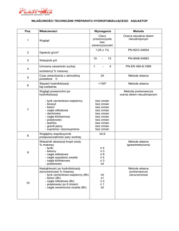 WŁAŚCIWOŚCI TECHNICZNE PREPARATU HYDROFOBIZUJĄCEGO AQUASTOP Poz. Właściwości 1 Wygląd 2 Gęstość g/cm³ 3 Wskaźnik pH 4 Umowna zawartość suchej Wymagania Metoda Ciecz przezroczysta bez zanieczyszczeń Ocena wizualna okiem nieuzbrojonym 1,05 ± 1% PN-92/C-04504 10 - 13 PN-89/B-04963 1 - 4 PN-EN 480-8;1999 substancji % masowy 5 Czas utwardzania z atmosferą powietrza h 6 Stopień hydrofobizacji kąt zwilżania 24 Metoda własna <130º Metoda własna Wygląd powierzchni po hydrofobizacji 7 - tynk cementowo-wapienny - terazyt - beton - cegła silikatowa - dachówka - cegła klinkierowa - piaskowiec - lastriko - granit jasny - suprema i styrosuprema 8 Względny współczynnik przepuszczalności pary wodnej 9 Wskaźnik absorpcji kropli wody % masowy - tynki - betony - cegła silikatowa - cegła wypalana zwykła - cegła klinkierowa - piaskowiec 10 Nasiąkliwość po hydrofobizacji zanurzeniowej % masowy - tynk cementowo-wapienny (8h) - beton (8h) - cegła silikatowa (8h) - piaskowiec po 6 dniach - cegła ceramiczna zwykła (8h) Metoda porównawcza ocena okiem nieuzbrojonym bez zmian bez zmian bez zmian bez zmian bez zmian bez zmian bez zmian bez zmian bez zmian bez zmian ≥0,9 Metoda własna (grawimetryczna) ≤4 ≤3 ≤9 ≤4 ≤3 ≤4 ≤4 ≤1 ≤3 ≤1 ≤2 Metoda własna porównawcza zanurzeniowa