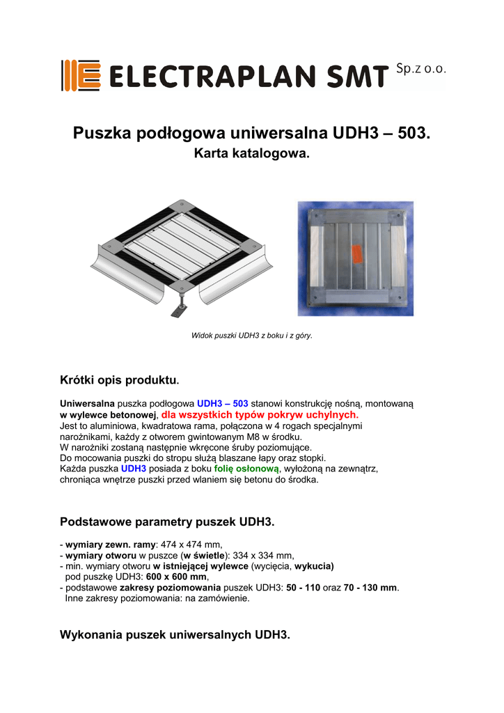 Puszka podłogowa uniwersalna UDH3 – 503. Karta katalogowa. Widok puszki UDH3 z boku i z góry. Krótki opis produktu. Uniwersalna puszka podłogowa UDH3 – 503 stanowi konstrukcję nośną, montowaną w wylewce betonowej, dla wszystkich typów pokryw uchylnych. Jest to aluminiowa, kwadratowa rama, połączona w 4 rogach specjalnymi narożnikami, każdy z otworem gwintowanym M8 w środku. W narożniki zostaną następnie wkręcone śruby poziomujące. Do mocowania puszki do stropu służą blaszane łapy oraz stopki. Każda puszka UDH3 posiada z boku folię osłonową, wyłożoną na zewnątrz, chroniąca wnętrze puszki przed wlaniem się betonu do środka. Podstawowe parametry puszek UDH3. - wymiary zewn. ramy: 474 x 474 mm, - wymiary otworu w puszce (w świetle): 334 x 334 mm, - min. wymiary otworu w istniejącej wylewce (wycięcia, wykucia) pod puszkę UDH3: 600 x 600 mm, - podstawowe zakresy poziomowania puszek UDH3: 50 - 110 oraz 70 - 130 mm. Inne zakresy poziomowania: na zamówienie. Wykonania puszek uniwersalnych UDH3. Do dyspozycji mamy nast. wykonania puszek UDH3: UDH3 50 – 110, 50 – 110 mm), nr katalog.253 214 920, UDH3 70 – 130, 70 – 130 mm, nr katalog 253 314 920, UDH3 100 - 160, 100 - 160 mm, nr katalog 253 514 920. Inne wykonania: na zamówienie. Kanały podłogowe do puszek UDH3. Puszka UDH3 przystosowana jest do doprowadzenia do niej wszystkich typów kanałów podłogowych (szer. 175, 190, 240 i 340 mm). Uwaga: bez problemu, zamiast kanałów podłogowych, można do puszki UDH3 wprowadzać (otwory w bocznej folii) rury instalacyjne. Ramy montażowe UDM3. Szkic ramy montażowej UDM3 (różne otwory pod pokrywy). W celu osadzenia pokryw uchylnych w puszce uniwersalnej UDH3, niezbędne jest zamontowanie w niej ramy montażowej (dopasowującej) typ UDM3, wykonanej z grubej (4 mm) blachy stalowej. Rama montażowa UDM3 dopasowuje puszkę UDH3 do konkretnej pokrywy uchylnej. Zestawienie ram montażowych UDM3. Dane techniczne ram montażowych UDM3. Ramy wykonane z grubej (4 mm) blachy stalowej, ocynkowanej. Wymiary zewn. ram: 360 x 360 mm. Ramy UDM3 z otworami pod wkręty (6 szt.), mocujące ramę w puszce podłogowej UDH3. 1.rama montażowa UDM3 BL – ślepa (pełna), nr katalog. 253 920 610, 2.rama montażowa UDM3 GBZ, otwór pod puszki napodłogowe GBZ; wymiary otworu w ramie: ø 50, nr katalog. 253 927 610, 3.rama montażowa UDM3 E2, z otworem pod pokrywę uchylną KD1 E2 – 522; wymiary otworu w ramie: 147 x 247 mm, nr katalog. 253 922 610, 4.rama montażowa UDM3 R2, otwór pod okrągłą pokrywę KD1 R2 – 560; wymiary otworu w ramie: ø 242, nr katalog. 253 923 610, 5.rama montażowa UDM3 Q2, otwór pod 2 pokrywy: KD1 Q2 – 562 i KD1 Q2S – 568, wymiary otworu w ramie: 228 x 228 mm, nr katalog. 253 924 610, 6.rama montażowa UDM3 E4, z otworem pod pokrywę uchylną KD1 E4S – 538 oraz KD1 E3S - 539, wymiary otworu w ramie: 247 x 291 mm, nr katalog. 253 928 610, 7.rama montażowa UDM3 R3, otwór pod pokrywy: KDR1 R3 - 590 wymiary otworu w ramie: Φ 306, nr katalog. 253 925 610, 8.rama montażowa UDM3 Q3/Q4, otwór pod pokrywy uchylne: KD1 Q4 – 594 i KDR1 Q3 – 593; wymiary otworu w ramie: 294 x 294 mm, nr katalog. 253 926 610, 9.rama montażowa UDM3 ESDB 133 pod przepusty LAFK (LARK), wymiary otworu w ramie: Φ 110, nr katalog. 253 921 610.