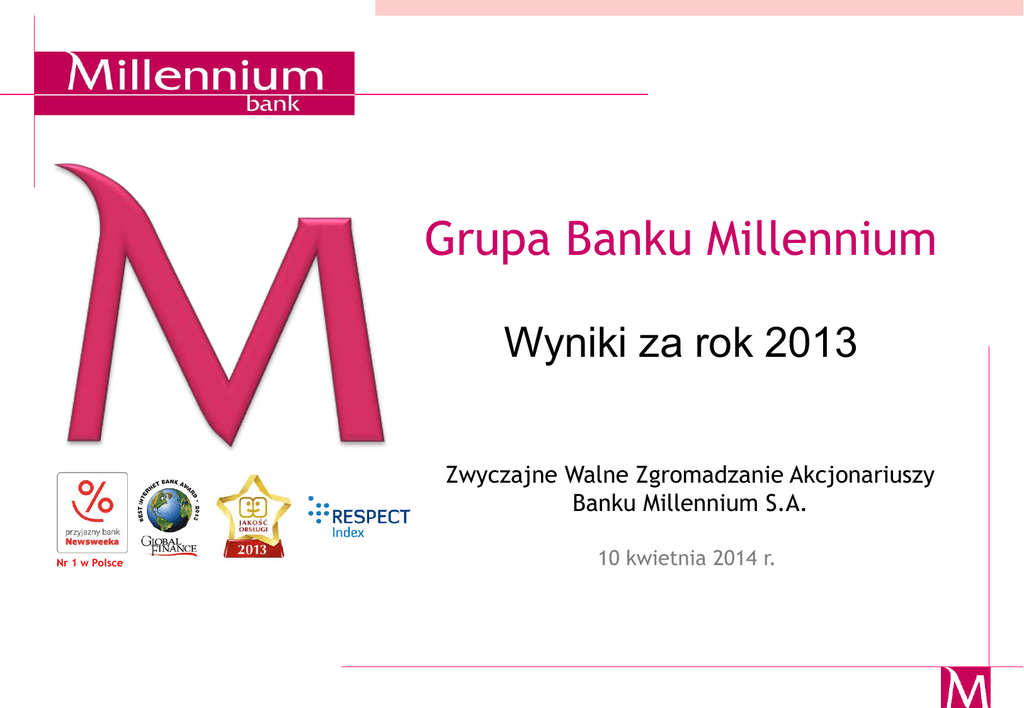 Bank Millennium – 1 Half 2011 results Grupa Banku Millennium Wyniki za rok 2013 Zwyczajne Walne Zgromadzanie Akcjonariuszy Banku Millennium S.A. Nr 1 w Polsce 10 kwietnia 2014 r. Walne Zgromadzenie Banku Millennium – kwiecień 2014r. Zastrzeżenie Niniejsza prezentacja („Prezentacja”) została przygotowana przez Bank Millennium S.A. („Bank”) i w żadnym przypadku nie może być traktowana jako proponowanie nabycia papierów wartościowych, oferta, zaproszenie czy zachęta do złożenia oferty nabycia, dokonania inwestycji lub przeprowadzenia transakcji dotyczących takich papierów wartościowych lub rekomendacja do zawierania jakichkolwiek transakcji, w szczególności dotyczących papierów wartościowych Banku. Publikowanie przez Bank danych zawartych w Prezentacji nie stanowi naruszenia przepisów prawa obowiązujących spółki, których akcje są notowane na rynku regulowanym, w szczególności na rynku regulowanym prowadzonym przez Giełdę Papierów Wartościowych w Warszawie S.A. Informacje w niej zawarte zostały przekazane do publicznej wiadomości przez Bank w ramach raportów bieżących lub okresowych, albo stanowią ich uzupełnienie, nie dając jednocześnie podstawy do przekazywania ich w ramach wypełniania przez Bank jako spółkę publiczną obowiązków informacyjnych. W żadnym wypadku nie należy uznawać informacji znajdujących się w niniejszej Prezentacji za wyraźne lub dorozumiane oświadczenie czy zapewnienie jakiegokolwiek rodzaju składane przez Bank lub osoby działające w imieniu Banku. Ponadto, ani Bank, ani osoby działające w imieniu Banku nie ponoszą pod żadnym względem odpowiedzialności za jakiekolwiek szkody, jakie mogą powstać, wskutek niedbalstwa czy z innej przyczyny, w związku z wykorzystaniem niniejszej Prezentacji lub jakichkolwiek informacji w niej zawartych, ani za szkody, które mogą powstać w inny sposób w związku z informacjami stanowiącymi część niniejszej Prezentacji. Wszystkie dane prezentowane w tym dokumencie bazują na audytowanych, skonsolidowanych danych finansowych Grupy Kapitałowej Banku Millennium (z wyjątkiem zysku netto do podziału, który prezentowany jest w układzie jednostkowym dla samego Banku). Dane te są zawarte w Sprawozdaniach Finansowych Grupy Kapitałowej i Banku Millennium opublikowanych dnia 28 lutego 2013 r. Poczynając od 1 stycznia 2006 roku Bank rozpoczął stosowanie zasad rachunkowości zabezpieczeń do połączenia walutowych kredytów hipotecznych o zmiennej stopie procentowej, depozytów złotowych o zmiennej stopie procentowej oraz powiązanych swapów walutowoprocentowych. Z dniem 1 kwietnia 2009 r. zasadami rachunkowości zabezpieczeń Bank objął swapy walutowe. Zgodnie z zasadami rachunkowości marża z tych operacji jest odzwierciedlona wyniku z odsetek. Ponieważ jednak rachunkowość zabezpieczeń nie obejmuje całego portfela denominowanego w walucie obcej, Bank przedstawia dane pro-forma. Dane pro-forma prezentują wszelkie odsetki od produktów pochodnych włączone do wyniku z odsetek. W opinii Banku umożliwia to lepsze zrozumienie rzeczywistej ewolucji tej pozycji z ekonomicznego punktu widzenia. Niniejsza prezentacja zawiera stwierdzenia odnoszące się do przyszłości. Te odnoszące się do przyszłości stwierdzenia opierają się na obecnych przewidywaniach Zarządu i zależą od wielu czynników oraz obarczone są niepewnością, co może skutkować tym, że faktyczne dane mogą znacząco odbiegać od tych przedstawionych w stwierdzeniach odnoszących się do przyszłości. Co do zasady, Bank nie ma obowiązku przekazywania do publicznej wiadomości aktualizacji i zmian informacji, danych oraz oświadczeń znajdujących się w niniejszej Prezentacji na wypadek zmiany strategii albo zamiarów Banku lub wystąpienia nieprzewidzianych faktów lub okoliczności, które będą miały wpływ na tę strategię lub zamiary Banku, chyba że obowiązek taki wynika z przepisów prawa 2 Walne Zgromadzenie Banku Millennium – kwiecień 2014r. Podsumowanie osiągnięć w latach 2010-2013 Zysk netto Wynik odsetkowy netto Wynik z prowizji netto (mln PLN) (mln PLN) CAGR* 466 CAGR* +18,0% 536 472 (mln PLN) +8,0% 1227 1191 1271 1010 CAGR* 565 +1,4% 562 589 546 326 +3,5% +13,5% 2010 2011 2012 2013 2011 (mln PLN) 63,0% CAGR* 1 889 2012 2013 Koszty operac. i wsk. koszty/ dochody Przychody operacyjne 1 716 2010 wsk. koszty/dochody 59,5% 57,4% (mln PLN) +5,3% 2 006 1 082 2010 5,8% 2010 2011 2012 1 090 -2,8% 2013 2010 * Średnioroczne tempo wzrostu 2011 2012 ... 4,9% 5,1% 2,3% 2,8% (mln PLN) 227 +2,8% 2012 2013 Odpisy na ryzyko i wsk. kredytów zagroż. 2,9% +0,2% 1 124 1 121 2011 4,4% 54,3% CAGR * 1 953 +7,8% 2013 2,9% +1,1% CAGR* 174 65 45 2010 2011 238 Wsk. kred. zagr. Przeterm. > 90 d. odpisy 234 58 56 2012 2013 Koszt ryzyka (w pb. w stosunku do śr. portfela kredytowego netto ) 3 Walne Zgromadzenie Banku Millennium – kwiecień 2014r. Podsumowanie osiągnięć w latach 2010-2013 Depozyty i płynność 99,5% 106,8% (mln PLN) 35 780 41 847 (mln PLN) (mln PLN) 91,5% CAGR* 45 654 37 823 CAGR* 2010 wsk. kredyty/depozyty 95,4% 2011 Depozyty firm Depozyty klientów indywidualnych 2012 2013 2010 Kredyty dla firm 27 399 26 431 23 408 21 313 +8,5% +8,7% 2011 2012 2013 CAGR* 14 467 14 415 15 416 2010 2011 2012 14,4% 10 264 8 854 +8,3% 10 006 11 254 12,3% (mln PLN) (mln PLN) CAGR* 3 001 +12,5% +7,3% 2 785 2 991 3 709 4 091 13,2% 2011 2012 2013 2010 2011 * Średnioroczne tempo wzrostu 2012 2013 2013 14,5% 14,5% 12,9% 13,4% CAR CT 1 11,4% CAGR* 4 586 +9,4% 4 824 5 363 +11,2% +24% 2010 18 254 kapitały własne i wsk. kapitałowe Kredyty konsumenckie (mln PLN) CAGR* +8,1% 2010 2011 2012 2013 4 Walne Zgromadzenie Banku Millennium – kwiecień 2014r. Zysk, przychody i marża odsetkowa Zysk netto 10,2% 10,6% Wynik z tytułu odsetek*** ROE 2,4% (mln zł) +13,5% 472,2 marża odsetkowa netto (mln PLN) 535,8 +3,5% +3,2% 2012 2,3% 2013 120,0 134,2 138,5 143,0 1kw. 13 2kw. 13 3kw. 13 4kw. 13