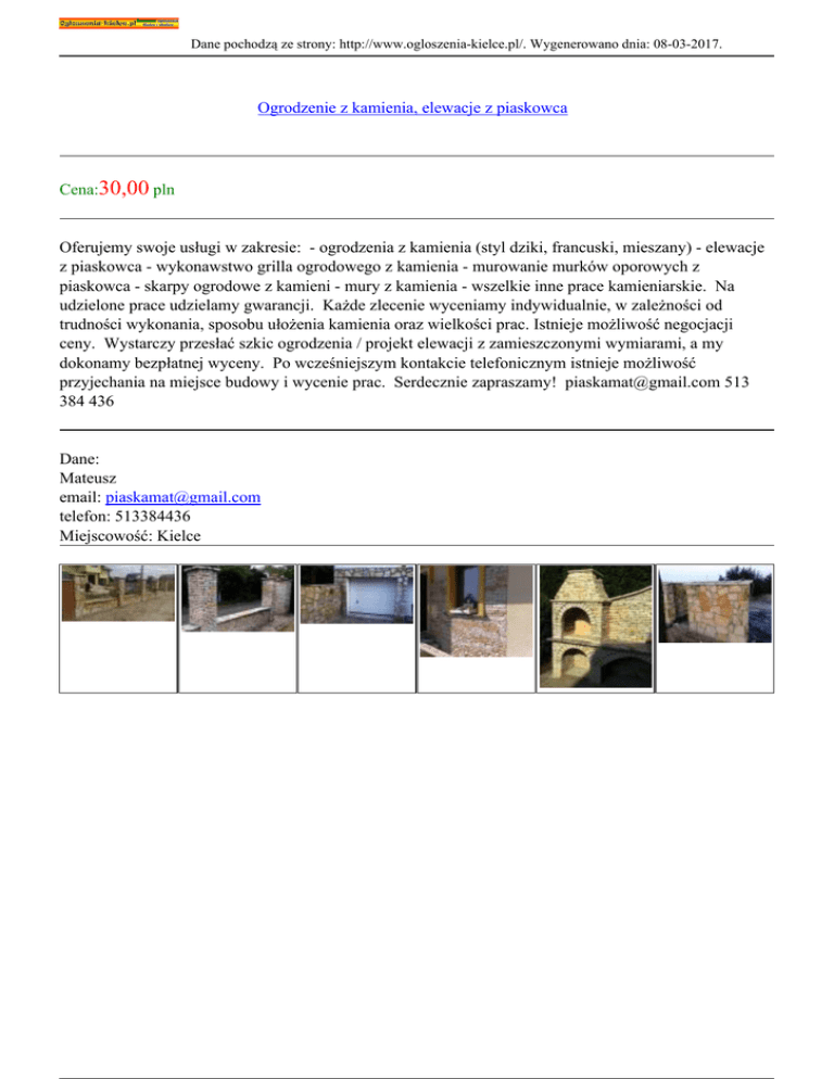 Dane pochodzą ze strony: http://www.ogloszenia-kielce.pl/. Wygenerowano dnia: 08-03-2017. Ogrodzenie z kamienia, elewacje z piaskowca Cena:30,00 pln Oferujemy swoje usługi w zakresie: - ogrodzenia z kamienia (styl dziki, francuski, mieszany) - elewacje z piaskowca - wykonawstwo grilla ogrodowego z kamienia - murowanie murków oporowych z piaskowca - skarpy ogrodowe z kamieni - mury z kamienia - wszelkie inne prace kamieniarskie. Na udzielone prace udzielamy gwarancji. Każde zlecenie wyceniamy indywidualnie, w zależności od trudności wykonania, sposobu ułożenia kamienia oraz wielkości prac. Istnieje możliwość negocjacji ceny. Wystarczy przesłać szkic ogrodzenia / projekt elewacji z zamieszczonymi wymiarami, a my dokonamy bezpłatnej wyceny. Po wcześniejszym kontakcie telefonicznym istnieje możliwość przyjechania na miejsce budowy i wycenie prac. Serdecznie zapraszamy! [email protected] 513 384 436 Dane: Mateusz email: [email protected] telefon: 513384436 Miejscowość: Kielce