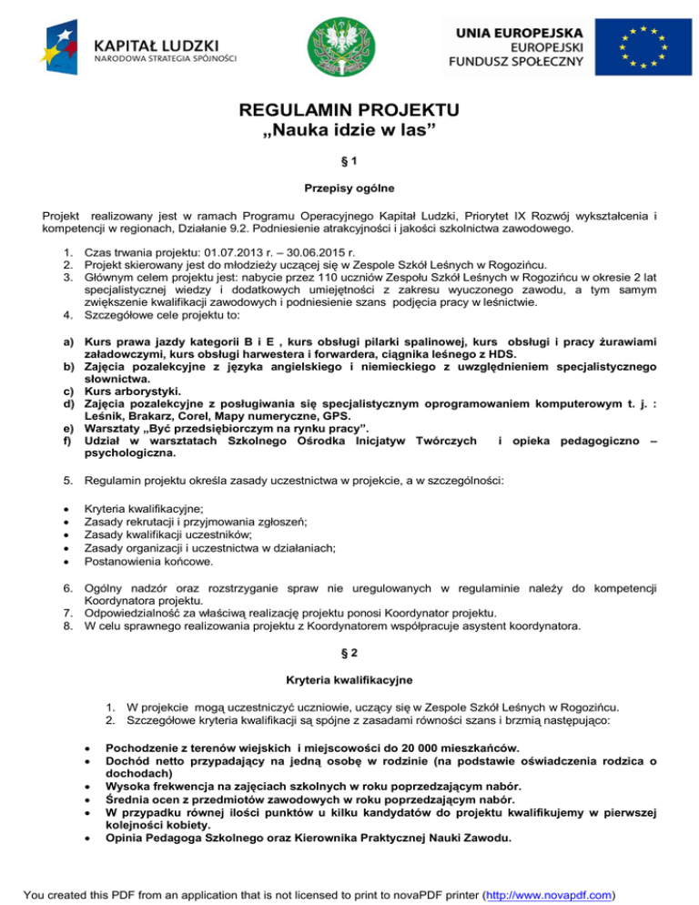 REGULAMIN PROJEKTU „Nauka idzie w las” §1 Przepisy ogólne Projekt realizowany jest w ramach Programu Operacyjnego Kapitał Ludzki, Priorytet IX Rozwój wykształcenia i kompetencji w regionach, Działanie 9.2. Podniesienie atrakcyjności i jakości szkolnictwa zawodowego. 1. Czas trwania projektu: 01.07.2013 r. – 30.06.2015 r. 2. Projekt skierowany jest do młodzieży uczącej się w Zespole Szkół Leśnych w Rogozińcu. 3. Głównym celem projektu jest: nabycie przez 110 uczniów Zespołu Szkół Leśnych w Rogozińcu w okresie 2 lat specjalistycznej wiedzy i dodatkowych umiejętności z zakresu wyuczonego zawodu, a tym samym zwiększenie kwalifikacji zawodowych i podniesienie szans podjęcia pracy w leśnictwie. 4. Szczegółowe cele projektu to: a) Kurs prawa jazdy kategorii B i E , kurs obsługi pilarki spalinowej, kurs obsługi i pracy żurawiami załadowczymi, kurs obsługi harwestera i forwardera, ciągnika leśnego z HDS. b) Zajęcia pozalekcyjne z języka angielskiego i niemieckiego z uwzględnieniem specjalistycznego słownictwa. c) Kurs arborystyki. d) Zajęcia pozalekcyjne z posługiwania się specjalistycznym oprogramowaniem komputerowym t. j. : Leśnik, Brakarz, Corel, Mapy numeryczne, GPS. e) Warsztaty „Być przedsiębiorczym na rynku pracy”. f) Udział w warsztatach Szkolnego Ośrodka Inicjatyw Twórczych i opieka pedagogiczno – psychologiczna. 5. Regulamin projektu określa zasady uczestnictwa w projekcie, a w szczególności: Kryteria kwalifikacyjne; Zasady rekrutacji i przyjmowania zgłoszeń; Zasady kwalifikacji uczestników; Zasady organizacji i uczestnictwa w działaniach; Postanowienia końcowe. 6. Ogólny nadzór oraz rozstrzyganie spraw nie uregulowanych w regulaminie należy do kompetencji Koordynatora projektu. 7. Odpowiedzialność za właściwą realizację projektu ponosi Koordynator projektu. 8. W celu sprawnego realizowania projektu z Koordynatorem współpracuje asystent koordynatora. §2 Kryteria kwalifikacyjne 1. W projekcie mogą uczestniczyć uczniowie, uczący się w Zespole Szkół Leśnych w Rogozińcu. 2. Szczegółowe kryteria kwalifikacji są spójne z zasadami równości szans i brzmią następująco: Pochodzenie z terenów wiejskich i miejscowości do 20 000 mieszkańców. Dochód netto przypadający na jedną osobę w rodzinie (na podstawie oświadczenia rodzica o dochodach) Wysoka frekwencja na zajęciach szkolnych w roku poprzedzającym nabór. Średnia ocen z przedmiotów zawodowych w roku poprzedzającym nabór. W przypadku równej ilości punktów u kilku kandydatów do projektu kwalifikujemy w pierwszej kolejności kobiety. Opinia Pedagoga Szkolnego oraz Kierownika Praktycznej Nauki Zawodu. You created this PDF from an application that is not licensed to print to novaPDF printer (http://www.novapdf.com) §3 Rekrutacja i przyjmowanie zgłoszeń 1. Rekrutację prowadzi specjalista do spraw promocji projektu 2. Informacja o terminie rozpoczęcia rekrutacji będzie umieszczona na stronie internetowej projektu , stronie szkoły oraz na tablicy ogłoszeń. 3. Dokumenty rekrutacyjne osób niepełnoletnich muszą być podpisane przez rodzica lub opiekuna prawnego. 4. Osoby zainteresowane uczestnictwem w projekcie składają prawidłowo wypełniony formularz rekrutacyjny. 5. Wzór formularza rekrutacyjnego dostępny jest w sekretariacie szkoły, na stronie internetowej szkoły oraz stronie internetowej projektu. §4 Kwalifikacja uczestników na szkolenia 1. Kwalifikacji kandydatów do udziału w szkoleniach/ warsztatach dokonuje Komisja Rekrutacyjna powołana przez Koordynatora Projektu. 2. Kwalifikacja kandydatów odbywa się w dwóch turach. 3. O przyjęciu kandydata do uczestnictwa w szkoleniu/ warsztacie decydują kryteria kwalifikacyjne (§ 2). 4. Dla pięciu uczniów zostanie stworzona lista rezerwowa. Będą to osoby, które spełniły wymagane kryteria, ale nie dostały się do projektu z powodu braku miejsc. Te osoby będą mogły uczestniczyć w projekcie gdy z przyczyn nagłych ktoś zrezygnuje. §5 Organizacja i uczestnictwo w działaniach 1. Nadzór organizacyjny nad realizacją działań sprawuje Koordynator projektu. 2. Odpowiedzialność za właściwą realizację poszczególnych działań ponosi Koordynator projektu. 3. Poszczególne szkolenia i warsztaty mają wyznaczoną maksymalną liczbę osób, która jest konieczna do ich realizacji. 4. Uczestnik jest zobowiązany do wypełnienia formularza rekrutacyjnego, podpisania oświadczenia o zgodzie na przechowywanie i przetwarzanie danych osobowych, wypełnienia ankiety oraz podpisania się na liście obecności. 5. Uczestnik zobowiązany jest do punktualnego i aktywnego uczestniczenia w wszystkich zaplanowanych zajęciach. 6. Uczestnik może opuścić 20 % zajęć. 7. W przypadku kursu prawa jazdy kat B i E rodzice lub prawni opiekunowie zobowiązują się do pokrycia ewentualnych kosztów egzaminów poprawkowych: t.j : teoretycznego i praktycznego w przypadku egzaminu na prawo jazdy kat B, oraz praktycznego w przypadku kursu prawa jazdy kat. B+E , w terminie możliwie jak najkrótszym wyznaczonym przez Wojewódzki Ośrodek Ruchu Drogowego, w którym odbędzie się egzamin. 8. Uczniowie dostaną materiały do nauki (podręczniki. 9. Na wniosek Uczestnika Organizator może wystawić zaświadczenie o uczestnictwie w szkoleniu/ warsztacie projektu. §6 Postanowienia końcowe 1. Regulamin wchodzi w życie z dniem 1. 07.2013 roku. 2. Regulamin jest dostępny w Biurze Projektu, Sekretariacie Szkoły oraz na stronie internetowej projektu i szkoły. 3. Organizator zastrzega sobie prawo do zmiany regulaminu. Zmiany będą obowiązywały z chwilą ich ogłoszenia. 4. Załącznikiem do regulaminu jest wzór ankiety rekrutacyjnej. You created this PDF from an application that is not licensed to print to novaPDF printer (http://www.novapdf.com)