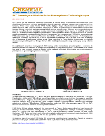 PCC inwestuje w Płockim Parku Przemysłowo-Technologicznym 2006-03-01 17:50:35 PCC Rokita stał się pierwszym powaŜnym inwestorem w Płockim Parku Przemysłowo-Technologicznym. Dziś oficjalnie poinformowano o tym na specjalnej konferencji prasowej z udziałem prezesów zainteresowanych firm, koncernu Orlen oraz władz Płocka. PCC Rokita, będący stałym długoterminowym odbiorcą surowców chemicznych od PKN ORLEN prowadził negocjacje na temat długoterminowych dostaw tlenku etylenu oraz budowy zakładu etoksylacji, wykorzystującego tlenek etylenu jako surowiec. Owocem tych rozmów jest umowa zawarta w grudniu ub. roku ustalająca zasady dostarczania rurociągiem tlenku etylenu do instalacji etoksylacji, którą PCC Rokita uruchomi w Płocku w bezpośrednim sąsiedztwie PKN ORLEN. W dniu 30 stycznia br. zawarte zostało porozumienie pomiędzy Płockim Parkiem Przemysłowo-Technologicznym a PCC Rokita, na mocy którego PCC zobowiązało się do ulokowania Wytwórni Etoksylatów w Płockim Parku Przemysłowo - Technologicznym. Inwestycja, o wartości nie niŜszej niŜ 40 mln zł, rozpocznie się najpóźniej do 31 grudnia 2006 roku. Przewiduje się, Ŝe powstaną 32 stałe nowe miejsca pracy. Nowa wytwórnia w Płocku będzie zintegrowana z wytwórnią siarczanowanych etoksylatów w Brzegu Dolnym. Obie instalacje tworzą jeden ciąg produkcyjny oparty o tlenek etylenu. Do najbliŜszych projektów inwestycyjnych PCC naleŜy takŜe intensyfikacja produkcji polioli - surowców do produkcji poliuretanów. Obecnie w Brzegu Dolnym powstaje III ciąg produkcji polioli. Zamierzeniem PCC Rokita jest, aby IV ciąg produkcji powstał w Płocku, obok instalacji etoksylacji. PCC Rokita rozpoczęła procedurę przetargową na generalnego wykonawcę inwestycji. Mirosław Krutin Prezes Zarządu PCC Rokita S.A. Krzysztof Lewandowski Prezes Zarządu PPP-T S.A. PCC Rokita Strategicznym akcjonariuszem PCC Rokita SA (90% akcji) jest niemiecka firma PCC AG z siedzibą Duisburgu. Przedmiotem działalności PCC AG jest handel i produkcja chemikaliów oraz logistyka (zarządzanie logistyką, transport kolejowy i drogowy). Grupa Kapitałowa PCC AG obejmuje swoim zasięgiem spółki i przedstawicielstwa w Polsce, Finlandii, Rosji, Czechach, na Litwie, Ukrainie, a takŜe w Chinach i Stanach Zjednoczonych. Aktualne zatrudnienie w Grupie PCC AG sięga 2 900 pracowników a obroty w 2005 roku szacowane są na 775 mln EUR. PCC AG zainwestowała w Polsce znacznie ponad 200 mln zł. PCC Rokita SA jest jedną z większych firm chemicznych w Polsce. Spółka zaopatruje wiele branŜ przemysłu takich jak tworzywa sztuczne, przemysł kosmetyczny i chemia gospodarcza, przemysł chemiczny, budowlany. Obroty PCC Rokita SA w 2005 roku wyniosły 621 mln zł, zysk brutto 34 mln zł. Spółka zatrudnia 700 osób. Grupa Kapitałowa PCC Rokita, do której naleŜy kilkanaście spółek produkcyjnych i usługowych, zatrudnia łącznie 1800 osób i jej obroty w 2005 roku wyniosły 769 mln zł a zysk brutto 42 mln zł. Strategiczne kierunki rozwoju PCC Rokita SA wyznaczają przedsięwzięcia inwestycyjne. Zgodnie z przyjętym planem inwestycyjnym w latach 2005-2009 PCC Rokita wyda na inwestycje około 400 mln zł. Źródło: http://www.chemical.pl/article869.html