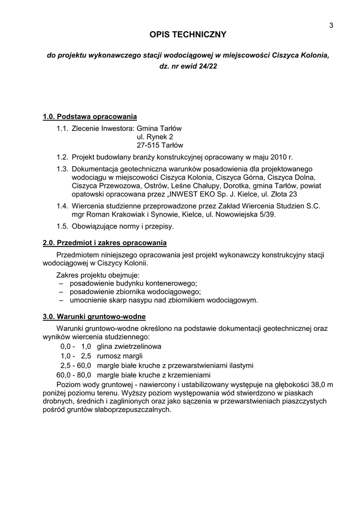 3 OPIS TECHNICZNY do projektu wykonawczego stacji wodociągowej w miejscowości Ciszyca Kolonia, dz. nr ewid 24/22 1.0. Podstawa opracowania 1.1. Zlecenie Inwestora: Gmina Tarłów ul. Rynek 2 27-515 Tarłów 1.2. Projekt budowlany branŜy konstrukcyjnej opracowany w maju 2010 r. 1.3. Dokumentacja geotechniczna warunków posadowienia dla projektowanego wodociągu w miejscowości Ciszyca Kolonia, Ciszyca Górna, Ciszyca Dolna, Ciszyca Przewozowa, Ostrów, Leśne Chałupy, Dorotka, gmina Tarłów, powiat opatowski opracowana przez „INWEST EKO Sp. J. Kielce, ul. Złota 23 1.4. Wiercenia studzienne przeprowadzone przez Zakład Wiercenia Studzien S.C. mgr Roman Krakowiak i Synowie, Kielce, ul. Nowowiejska 5/39. 1.5. Obowiązujące normy i przepisy. 2.0. Przedmiot i zakres opracowania Przedmiotem niniejszego opracowania jest projekt wykonawczy konstrukcyjny stacji wodociągowej w Ciszycy Kolonii. Zakres projektu obejmuje: – posadowienie budynku kontenerowego; – posadowienie zbiornika wodociągowego; – umocnienie skarp nasypu nad zbiornikiem wodociągowym. 3.0. Warunki gruntowo-wodne Warunki gruntowo-wodne określono na podstawie dokumentacji geotechnicznej oraz wyników wiercenia studziennego: 0,0 - 1,0 glina zwietrzelinowa 1,0 - 2,5 rumosz margli 2,5 - 60,0 margle białe kruche z przewarstwieniami ilastymi 60,0 - 80,0 margle białe kruche z krzemieniami Poziom wody gruntowej - nawiercony i ustabilizowany występuje na głębokości 38,0 m poniŜej poziomu terenu. WyŜszy poziom występowania wód stwierdzono w piaskach drobnych, średnich i zaglinionych oraz jako sączenia w przewarstwieniach piaszczystych pośród gruntów słaboprzepuszczalnych. 4 4.0. Opis konstrukcji 4.1. Posadowienie budynku kontenerowego Budynek kontenerowy - typowy, dostarczony będzie w całości na budowę i ustawiony na płytowym fundamencie Ŝelbetowym. PodłoŜe pod fundamentem wykonać z zagęszczonego piasku grubości 25 cm oraz warstwy chudego betonu B10 grubości 10 cm. Płyta fundamentowa Ŝelbetowa wylewana grubości 30 cm i wymiarach w rzucie B×L = 5,30×6,30 m. Zbrojenie górą i dołem #10 co 15 cm krzyŜowo. Dla przeprowadzenia rurociągów w płycie przewidziano otwory technologiczne 40×40 cm oraz 20×20 cm. Lokalizacje otworów pokazano na rysunku konstrukcyjnym. Uwaga: w przypadku wystąpienia w podłoŜu nasypów niekontrolowanych lub innych gruntów nienośnych, naleŜy je w całości usunąć i zastąpić zagęszczonym piaskiem. Wewnątrz obrysu budynku występuje posadzka betonowa ze spadkiem w kierunku kratek odwadniających. Posadzkę tę naleŜy wykonać po montaŜu rur wodociągowych i kanalizacyjnych wychodzących do urządzeń. Materiały konstrukcyjne: – beton fundamentu B25 – beton podkładowy B10 – stal zbrojeniowa kl. A-IIIN, gat. B500SP 4.2. Posadowienie zbiornika wodociągowego Zbiornik na wodę pitną - poziomy jednokomorowy o pojemności 50 m3 wykonany jest z blachy stalowej, ukształtowanej w walczak cylindryczny, zamknięty z obu stron płaskimi dnami o średnicy φ 2800 mm. Wewnątrz znajdują się pierścienie usztywniające. Całość spawana - nierozbieralna. Długość zbiornika wynosi 8 500 mm. Posadowienie zbiornika na płytowym fundamencie Ŝelbetowym. PodłoŜe pod fundamentem wykonać z zagęszczonego piasku grubości 25 cm oraz warstwy chudego betonu B10 grubości 30 cm. Płyta fundamentowa Ŝelbetowa wylewana grubości 25 cm i wymiarach w rzucie B×L = 4,00×9,50 m. Zbrojenie dołem #12 co 15 oraz #12 co 20 cm. Przed zabetonowaniem fundamentu osadzić przewód spustu wody ze zbiornika. Po ustawieniu i ustabilizowaniu zbiornika naleŜy obetonować go tworząc kolebę obejmującą minimum 1/3 jego obwodu. Do wykonania koleby stosować beton o konsystencji plastycznej. Uwaga: w przypadku wystąpienia w podłoŜu nasypów niekontrolowanych lub innych gruntów nienośnych, naleŜy je w całości usunąć i zastąpić zagęszczonym piaskiem. Materiały konstrukcyjne: – beton fundamentu B25 – beton koleby B25 – beton podkładowy B10 – stal zbrojeniowa kl. A-IIIN, gat. B500SP Izolacja powłokowa: – gruntowanie środkiem Eurolan 3 K – 2× Superflex 10 5 4.3. Nasyp nad zbiornikiem Jako materiał zasypowy wykopu naleŜy zastosować grunt niespoisty. Rodzimy grunt spoisty moŜe stanowić materiał uzupełniający przy wykonaniu nasypu. W trakcie wykonywania obsypki ziemnej niedopuszczalny jest najazd cięŜkiego sprzętu na ścianki obsypywanego zbiornika. Nasyp nad zbiornikiem naleŜy wykonać tak, aby warstwa piasku przewyŜszała o co najmniej 15 cm górną krawędź zbiornika. Z uwagi na brak miejsca na działce nachylenie skarp nasypu 1:0,5. Umocnienie skarp za pomocą prefabrykowanych płyt betonowych aŜurowych. PodłoŜe, na którym układane będą prefabrykowane płyty aŜurowe, powinno być zagęszczone do wskaźnika Is ≥ 0,97. Po uformowaniu i zagęszczeniu nasypu umocnić skarpy geowłókniną a następnie obłoŜyć betonowymi płytami aŜurowymi. Dolne płyty oprzeć na bloku betonowym opasującym spód skarpy. Spoiny pomiędzy płytami naleŜy wypełnić zaprawą cementowopiaskową o stosunku 1:2. Otwory w płytach wypełnić humusem wymieszanym z nasionami traw. Materiały konstrukcyjne: – prefabrykowane płyty betonowe aŜurowe – beton bloku oporowego B30 5.0. Wykonawstwo i odbiory robót Wszystkie roboty budowlane i ich odbiory naleŜy wykonać zgodnie z projektem, sztuką budowlaną oraz aktualnie obowiązującymi normami i przepisami technicznobudowlanymi. Projekt naleŜy rozpatrywać wraz z projektami innych branŜ. W trakcie wykonywania robót budowlanych zachować przepisy BHP i p.poŜ. opracowali: mgr inŜ. Małgorzata Skalska upr. KL 39/2002 Kielce, sierpień 2010 r. mgr inŜ. Nai Van Hoang upr. KL 199/86