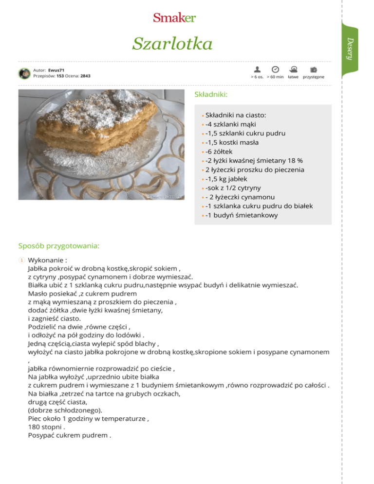 Szarlotka Autor: Ewus71 Przepisów: 153 Ocena: 2843 > 6 os. > 60 min łatwe przystępne Składniki: Składniki na ciasto: -4 szklanki mąki -1,5 szklanki cukru pudru -1,5 kostki masła -6 żółtek -2 łyżki kwaśnej śmietany 18 % 2 łyżeczki proszku do pieczenia -1,5 kg jabłek -sok z 1/2 cytryny - 2 łyżeczki cynamonu -1 szklanka cukru pudru do białek -1 budyń śmietankowy Sposób przygotowania: 1 Wykonanie : Jabłka pokroić w drobną kostkę,skropić sokiem , z cytryny ,posypać cynamonem i dobrze wymieszać. Białka ubić z 1 szklanką cukru pudru,następnie wsypać budyń i delikatnie wymieszać. Masło posiekać ,z cukrem pudrem z mąką wymieszaną z proszkiem do pieczenia , dodać żółtka ,dwie łyżki kwaśnej śmietany, i zagnieść ciasto. Podzielić na dwie ,równe części , i odłożyć na pół godziny do lodówki . Jedną częścią,ciasta wylepić spód blachy , wyłożyć na ciasto jabłka pokrojone w drobną kostkę,skropione sokiem i posypane cynamonem , jabłka równomiernie rozprowadzić po cieście , Na jabłka wyłożyć ,uprzednio ubite białka z cukrem pudrem i wymieszane z 1 budyniem śmietankowym ,równo rozprowadzić po całości . Na białka ,zetrzeć na tartce na grubych oczkach, drugą część ciasta, (dobrze schłodzonego). Piec około 1 godziny w temperaturze , 180 stopni . Posypać cukrem pudrem . 2 Smacznego !!! Twoje notatki do przepisu: