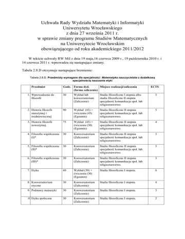 Uchwała Rady Wydziału Matematyki i Informatyki Uniwersytetu Wrocławskiego z dnia 27 września 2011 r. w sprawie zmiany programu Studiów Matematycznych na Uniwersytecie Wrocławskim obowiązującego od roku akademickiego 2011/2012 W tekście uchwały RW MiI z dnia 19 maja,16 czerwca 2009 r., 19 października 2010 r. i 14 czerwca 2011 r. wprowadza się następujące zmiany. Tabela 2.8.D otrzymuje następujące brzmienie: Tabela 2.8.D. Przedmioty wymagane dla specjalności Matematyka nauczycielska z dodatkową specjalnością nauczanie etyki Przedmiot Godz. Forma dyd. Miejsce realizacji/zaliczenia (forma zaliczenia) ECTS 1. Wprowadzenie do filozofii 30 Wykład lub konwersatorium (Zaliczenie) Studia filozoficzne I stopnia albo studia filozoficzne II stopnia specjalność komunikacja społ. lub religioznawstwo. 3 2. Historia filozofii starożytnej i średniowiecznej 90 Wykład (45) + ćwiczenia (45) (Egzamin) Studia filozoficzne II stopnia specjalność komunikacja społ. lub religioznawstwo. 5 3. Historia filozofii nowożytnej. 75 Wykład (45) + ćwiczenia (30) (Egzamin) Studia filozoficzne II stopnia specjalność komunikacja społ. lub religioznawstwo. 4 4. Filozofia współczesna (I)* 30 Konwersatorium (Zaliczenie) Studia filozoficzne II stopnia specjalność komunikacja społ. lub religioznawstwo. 3 5. Filozofia współczesna (II)* 30 Konwersatorium (Zaliczenie) Studia filozoficzne II stopnia specjalność komunikacja społ. lub religioznawstwo. 3 6. Filozofia współczesna (III)* 30 Konwersatorium (Zaliczenie) Studia filozoficzne II stopnia specjalność komunikacja społ. lub religioznawstwo. 3 7. Etyka 60 Wykład (30) + ćwiczenia (30) (Egzamin) Studia filozoficzne I stopnia. 6 8. Konwersatorium etyczne 30 Konwersatorium (Zaliczenie) Studia filozoficzne I stopnia. 4 9. Podstawy metaetyki 30 Konwersatorium (Zaliczenie) Studia filozoficzne I stopnia. 3 10.Etyka społeczna 30 Konwersatorium (Zaliczenie) Studia filozoficzne I stopnia. 2 11.Propedeutyka dydaktyki przedmiotów filozoficznych 30 Konwersatorium (Zaliczenie) Studia filozoficzne I stopnia. 3 12.Filozoficzne i moralne problemy w literaturze (konwers. dydaktyczne) 30 Konwersatorium (Zaliczenie) Studia filozoficzne I stopnia. 3 13.Dydaktyka etyki 30 Konwersatorium (Zaliczenie) Studia filozoficzne I stopnia. 2 14.Przedmiot dodatkowy (Estetyka lub Antropologia filozoficzna) do 15.Praktyka ciągła w szkole podstawowej 30 Wykład lub konwersatorium (Egzamin) Studia filozoficzne I stopnia (Estetyka) Studia filozoficzne II stopnia (Antropologia) 4 16.Praktyka ciągła w gimnazjum 20 Ćwiczenia (Zaliczenie) 20 Ćwiczenia (Zaliczenie) 5 0 0 Przedmioty oznaczone gwiazdką można zaliczać poprzez zdanie egzaminu na studiach filozoficznych I stopnia (w wymiarze 30 godzin ćwiczeń i 30 godzin wykładu każdy). W tym przypadku otrzymuje się 5 punktów ECTS za każdy taki przedmiot. Do czasu końca II roku należy zaliczyć przedmioty pojawiające się w wierszach: 1, 2, 3, 7, 8,11, 12. Przedmiot 13 powinien być realizowany najpóźniej równolegle z I semestrem praktyk pedagogicznych.