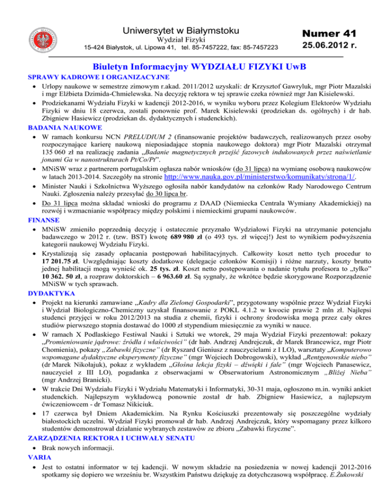41 - Wydział Fizyki - Uniwersytet w Białymstoku