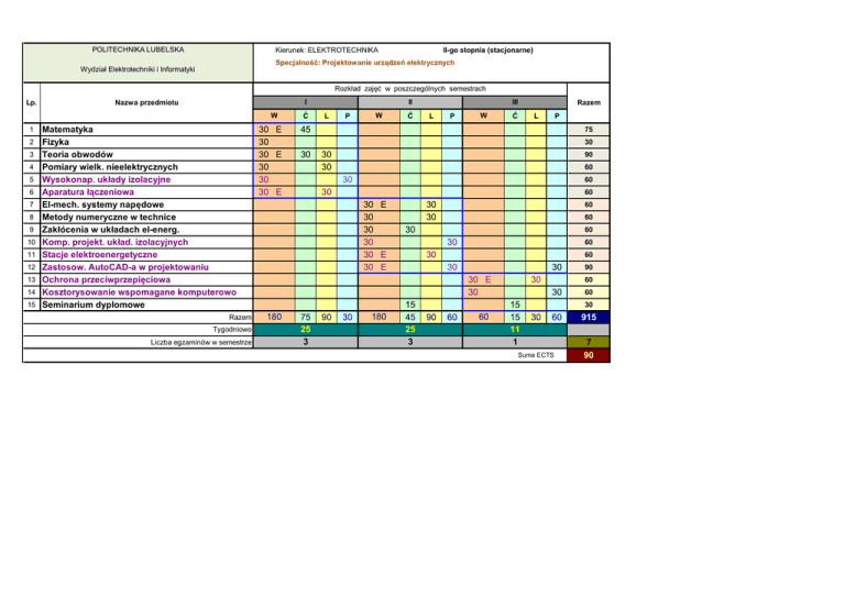 POLITECHNIKA LUBELSKA Kierunek: ELEKTROTECHNIKA II-go stopnia (stacjonarne) Specjalność: Projektowanie urządzeń elektrycznych Wydział Elektrotechniki i Informatyki Rozkład zajęć w poszczególnych semestrach Lp. I Nazwa przedmiotu W 1 2 3 4 5 6 7 8 9 10 11 12 13 14 15 Matematyka Fizyka Teoria obwodów Pomiary wielk. nieelektrycznych Wysokonap. układy izolacyjne Aparatura łączeniowa El-mech. systemy napędowe Metody numeryczne w technice Zakłócenia w układach el-energ. Komp. projekt. układ. izolacyjnych Stacje elektroenergetyczne Zastosow. AutoCAD-a w projektowaniu Ochrona przeciwprzepięciowa Kosztorysowanie wspomagane komputerowo Seminarium dyplomowe Razem Tygodniowo Liczba egzaminów w semestrze 30 E 30 30 E 30 30 30 E Ć II L P W Ć III L P W Ć P 45 75 30 30 30 30 90 60 30 60 30 60 30 E 30 30 30 30 E 30 E 30 30 60 60 30 60 30 60 30 60 30 30 30 E 30 180 Razem L 75 25 3 90 30 180 15 45 25 3 90 60 60 30 15 15 11 1 90 60 30 60 60 915 30 30 Suma ECTS 7 90
