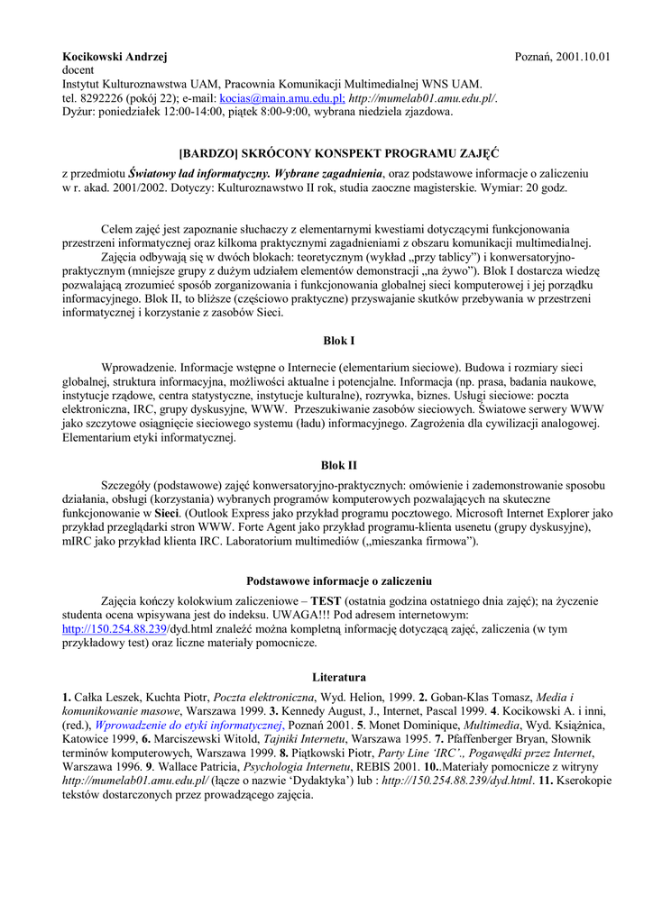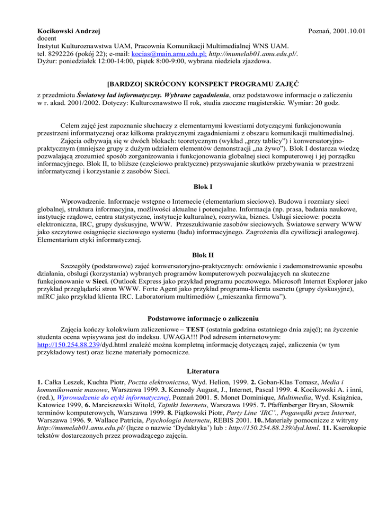 Kocikowski Andrzej docent Instytut Kulturoznawstwa UAM, Pracownia Komunikacji Multimedialnej WNS UAM. tel. 8292226 (pokój 22); e-mail: [email protected]; http://mumelab01.amu.edu.pl/. Dyżur: poniedziałek 12:00-14:00, piątek 8:00-9:00, wybrana niedziela zjazdowa. Poznań, 2001.10.01 [BARDZO] SKRÓCONY KONSPEKT PROGRAMU ZAJĘĆ z przedmiotu Światowy ład informatyczny. Wybrane zagadnienia, oraz podstawowe informacje o zaliczeniu w r. akad. 2001/2002. Dotyczy: Kulturoznawstwo II rok, studia zaoczne magisterskie. Wymiar: 20 godz. Celem zajęć jest zapoznanie słuchaczy z elementarnymi kwestiami dotyczącymi funkcjonowania przestrzeni informatycznej oraz kilkoma praktycznymi zagadnieniami z obszaru komunikacji multimedialnej. Zajęcia odbywają się w dwóch blokach: teoretycznym (wykład „przy tablicy”) i konwersatoryjnopraktycznym (mniejsze grupy z dużym udziałem elementów demonstracji „na żywo”). Blok I dostarcza wiedzę pozwalającą zrozumieć sposób zorganizowania i funkcjonowania globalnej sieci komputerowej i jej porządku informacyjnego. Blok II, to bliższe (częściowo praktyczne) przyswajanie skutków przebywania w przestrzeni informatycznej i korzystanie z zasobów Sieci. Blok I Wprowadzenie. Informacje wstępne o Internecie (elementarium sieciowe). Budowa i rozmiary sieci globalnej, struktura informacyjna, możliwości aktualne i potencjalne. Informacja (np. prasa, badania naukowe, instytucje rządowe, centra statystyczne, instytucje kulturalne), rozrywka, biznes. Usługi sieciowe: poczta elektroniczna, IRC, grupy dyskusyjne, WWW. Przeszukiwanie zasobów sieciowych. Światowe serwery WWW jako szczytowe osiągnięcie sieciowego systemu (ładu) informacyjnego. Zagrożenia dla cywilizacji analogowej. Elementarium etyki informatycznej. Blok II Szczegóły (podstawowe) zajęć konwersatoryjno-praktycznych: omówienie i zademonstrowanie sposobu działania, obsługi (korzystania) wybranych programów komputerowych pozwalających na skuteczne funkcjonowanie w Sieci. (Outlook Express jako przykład programu pocztowego. Microsoft Internet Explorer jako przykład przeglądarki stron WWW. Forte Agent jako przykład programu-klienta usenetu (grupy dyskusyjne), mIRC jako przykład klienta IRC. Laboratorium multimediów („mieszanka firmowa”). Podstawowe informacje o zaliczeniu Zajęcia kończy kolokwium zaliczeniowe – TEST (ostatnia godzina ostatniego dnia zajęć); na życzenie studenta ocena wpisywana jest do indeksu. UWAGA!!! Pod adresem internetowym: http://150.254.88.239/dyd.html znaleźć można kompletną informację dotyczącą zajęć, zaliczenia (w tym przykładowy test) oraz liczne materiały pomocnicze. Literatura 1. Całka Leszek, Kuchta Piotr, Poczta elektroniczna, Wyd. Helion, 1999. 2. Goban-Klas Tomasz, Media i komunikowanie masowe, Warszawa 1999. 3. Kennedy August, J., Internet, Pascal 1999. 4. Kocikowski A. i inni, (red.), Wprowadzenie do etyki informatycznej, Pozna ń 2001. 5. Monet Dominique, Multimedia, Wyd. Książnica, Katowice 1999, 6. Marciszewski Witold, Tajniki Internetu, Warszawa 1995. 7. Pfaffenberger Bryan, Słownik terminów komputerowych, Warszawa 1999. 8. Piątkowski Piotr, Party Line ‘IRC’., Pogawędki przez Internet, Warszawa 1996. 9. Wallace Patricia, Psychologia Internetu, REBIS 2001. 10..Materiały pomocnicze z witryny http://mumelab01.amu.edu.pl/ (łącze o nazwie ‘Dydaktyka’) lub : http://150.254.88.239/dyd.html. 11. Kserokopie tekstów dostarczonych przez prowadzącego zajęcia.