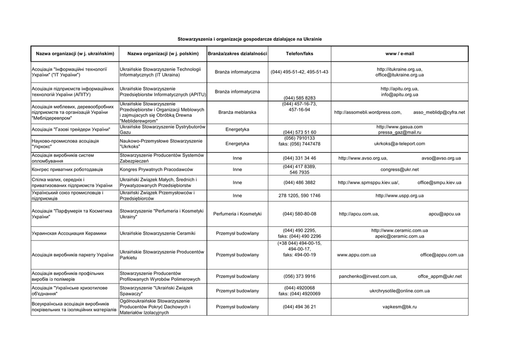Stowarzyszenia i organizacje gospodarcze działające na Ukrainie Nazwa organizacji (w j. ukraińskim) Nazwa organizacji (w j. polskim) BranŜa/zakres działalności Telefon/faks www / e-mail (044) 495-51-42, 495-51-43 http://itukraine.org.ua, [email protected] Асоціація "Інформаційні технології України" ("ІТ України") Ukraińskie Stowarzyszenie Technologii Informatycznych (IT Ukraina) BranŜa informatyczna Асоціація підприємств інформаційних технологій України (АПІТУ) Ukraińskie Stowarzyszenie Przedsiębiorstw Informatycznych (APITU) BranŜa informatyczna Асоціація меблевих, деревообробних підприємств та організацій України "Меблідеревпром" Асоціація "Газові трейдери України" Ukraińskie Stowarzyszenie Przedsiębiorstw i Organizacji Meblowych i zajmujacych się Obróbką Drewna "Mebliderewprom" Ukraińske Stowarzyszenie Dystrybutorów Gazu BranŜa meblarska Energetyka (044) 585 8283 (044) 457-16-73, 457-16-94 (044) 573 51 60 (056) 7910133 faks: (056) 7447478 Науково-промислова асоціація "Укркокс" Naukowo-Przemysłowe Stowarzyszenie "Ukrkoks" Energetyka Асоціація виробників систем опломбування Stowarzyszenie Producentów Systemów Zabezpieczeń Inne (044) 331 34 46 http://apitu.org.ua, [email protected] http://assomebli.wordpress.com, [email protected] http://www.gasua.com [email protected] [email protected] http://www.avso.org.ua, [email protected] Конгрес приватних роботодавців Kongres Prywatnych Pracodawców Inne (044) 417 8389, 546 7935 Спілка малих, середніх і приватизованих підприємств України Ukraiński Związek Małych, Średnich i Prywatyzowanych Przedsiębiorstw Inne (044) 486 3882 Український союз промисловців і підприємців Ukraiński Związek Przemysłowców i Przedsiębiorców Inne 278 1205, 590 1746 Асоціація "Парфумерія та Косметика України" Stowarzyszenie "Perfumeria i Kosmetyki Ukrainy" Perfumeria i Kosmetyki (044) 580-80-08 Украинская Ассоциация Керамики Ukraińskie Stowarzyszenie Ceramiki Przemysł budowlany Асоціація виробників паркету України Ukraińskie Stowarzyszenie Producentów Parkietu Przemysł budowlany (044) 490 2295, faks: (044) 490 2296 (+38 044) 494-00-15, 494-00-17, faks: 494-00-19 Асоціація виробників профільних виробів із полімерів Stowarzyszenie Producentów Profilowanych Wyrobów Polimerowych Przemysł budowlany (056) 373 9916 Асоціація "Українське хризотилове об'єднання" Stowarzyszenie "Ukraiński Związek Spawaczy" Przemysł budowlany (044) 4920068 faks: (044) 4920069 [email protected] Przemysł budowlany (044) 494 36 21 [email protected] Ogólnoukraińskie Stowarzyszenie Всеукраїнська асоціація виробників Producentów Pokryć Dachowych i покрівельних та ізоляційних матеріалів Materiałów Izolacyjnych [email protected] http://www.spmsppu.kiev.ua/, [email protected] http://www.uspp.org.ua http://apcu.com.ua, [email protected] http://www.ceramic.com.ua [email protected] www.appu.com.ua [email protected] [email protected], [email protected] Українська асоціація підприємств і організацій цементної промисловості "Укрцемент" Ukraińskie Stowarzyszenie Przedsiebiorstw i Organizacji Przemysłu Cementowego Przemysł budowlany (044) 391-47-13 Українська Будівельна Асоціація Ukraińskie Stowarzyszenie Budowlane Przemysł budowlany (044) 200-04-52 Конфедерація будівельників України Konfederacja Budowniczych Ukrainy Przemysł budowlany (044) 200-04-52 Всеукраїнський союз виробників будівельних матеріалів та виробів Ассоциация «Региональное строительство» Ogólnoukraiński Związek Producentów Materiałów i Urządzeń Budowlanych Stowarzyszenie „Regionalne Budownictwo” Асоціація "Будівельники залізниць України" Przemysł budowlany 044 425-61-73 http://ukrcement.com.ua, [email protected] http://u-b-a.com.ua, [email protected] http://kbu.org.ua [email protected] www.avbmv.com.ua, [email protected] Przemysł budowlany (057) 758-11-23, 751-87-45 Stowarzyszenie „Budowniczowie Kolei Ukrainy” Przemysł budowlany (062) 210 21 47 http://railwaybuild.org, Асоціація "Виробники Пінопласту" Stowarzyszenie „Producenci Styropianu" Przemysł budowlany (044) 239-96-31, (067) 443-26-16 http://aspp.com.ua, Украинская Ассоциация производителей сухих строительных смесей Stowarzyszenie Producentów Suchych Mieszanek Budowlanych Przemysł budowlany (044) 501 60 00 Національная спілка архітекторів України Narodowy Związek Architektów Ukrainy Przemysł budowlany (044) 279-9808 Stowarzyszenie Ukraińskich Асоціація українських підприємств Przedsiębiorstw Sektora Celulozowoцелюлозно-паперової галузі "Укрпапір" Papierniczego "Ukrpapir" Przemysł celulozowopapierniczy tel: (044) 517-82-90, 517-89-79 tel/faks: (044) 517-64-10 [email protected] Українська асоціація виробників гофрокартону Ukraińskie Stowarzyszenie Producentów Kartonów Karbowanych Przemysł celulozowopapierniczy (044) 286 6251, (067) 409 5417 [email protected] Ukraińskie Stowarzyszenie Pro