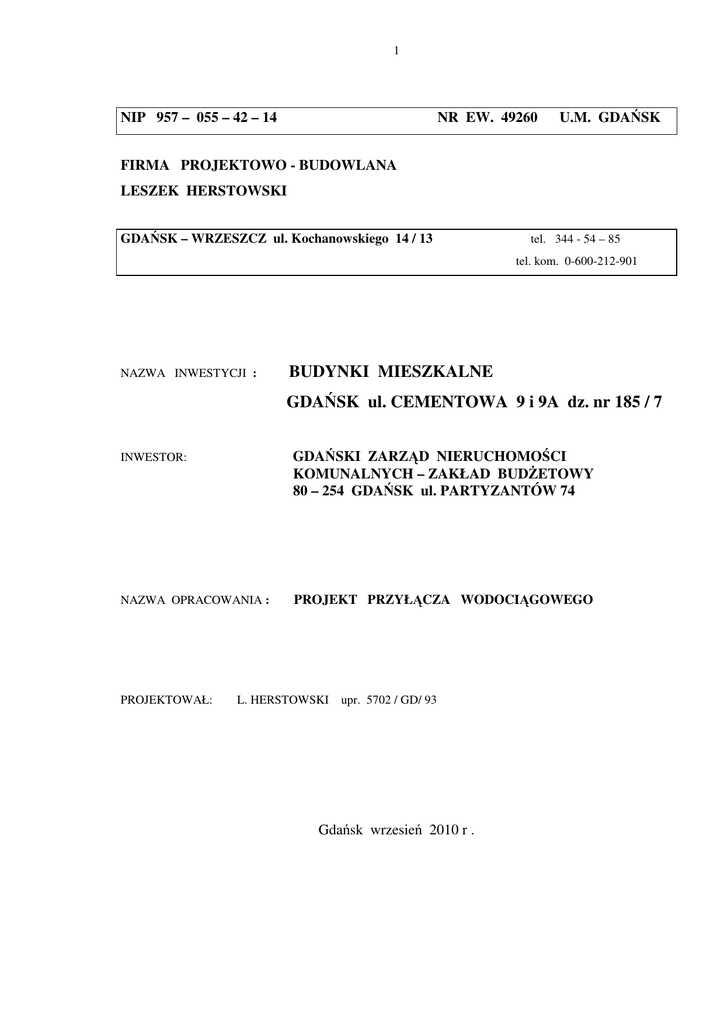 1 NIP 957 – 055 – 42 – 14 NR EW. 49260 U.M. GDAŃSK FIRMA PROJEKTOWO - BUDOWLANA LESZEK HERSTOWSKI GDAŃSK – WRZESZCZ ul. Kochanowskiego 14 / 13 tel. 344 - 54 – 85 tel. kom. 0-600-212-901 NAZWA INWESTYCJI : BUDYNKI MIESZKALNE GDAŃSK ul. CEMENTOWA 9 i 9A dz. nr 185 / 7 INWESTOR: GDAŃSKI ZARZĄD NIERUCHOMOŚCI KOMUNALNYCH – ZAKŁAD BUDśETOWY 80 – 254 GDAŃSK ul. PARTYZANTÓW 74 NAZWA OPRACOWANIA : PROJEKT PRZYŁĄCZA WODOCIĄGOWEGO PROJEKTOWAŁ: L. HERSTOWSKI upr. 5702 / GD/ 93 Gdańsk wrzesień 2010 r . 2 ZAWARTOŚĆ TECZKI 1.0. Strona tytułowa 2.0. Strona zawartości teczki 3.0. Opis techniczny 4.0. Rysunki Rys. nr 1 Plan sytuacyjny. skala 1 : 500 Rys. nr 2 Profil przyłącza wodociągowego skala 1 : 50 / 100 3 OPIS TECHNICZNY - do projektu przyłącza wodociągowego do budynków mieszkalnych Gdańsku przy ul. Cementowej 9 i 9A dz. nr 185 / 7 1.0. Podstawa opracowania: 1.1. Zlecenie umowa 1.2. Warunki techniczne podłączenia do sieci wod. – kan budynków mieszkalnych przy ul. Cementowej nr 5-9 w Gdańsku. EWI – WT / 195 A / 2009 / AKP wydane przez Saur Neptun Gdańsk S.A. dn. 05.06.2009 r. 1.3. Plan sytuacyjny z naniesionym uzbrojeniem. 1.4. Obowiązujące normy i przepisy. 2.0. Zakres opracowania : Projekt zakresem swym obejmuje przyłącze wodociągowe do budynków mieszkalnych w Gdańsku przy ul. Cementowej 9 – 9A , działka nr 185 / 7 3.0. Opis szczegółowy : 3.1. Przyłącze wodociągowe. Włączenie do sieci wodociągowej wykonać do istniejącego przewodu wodociągowego PCW 110 biegnącego w pobliŜu posesji. Włączenie wykonać przy pomocy opaski do nawierceń 110 / 2’’ dla rur PCW. Projektowane przyłącze wykonać naleŜy z rur PE 63 x 4,6 ( PN 10 ) łączonych za pośrednictwem złączek skręcanych , zaleca się wykonanie przyłącza z jednego kawałka rury PE. 4 Na przyłączu montować zasuwę do nawiercania DN 50 gwintowaną z miękkim doszczelnieniem. Nad rurociągiem ułoŜyć taśmę lokalizacyjno - ostrzegawczą koloru biało - niebieskiego o szerokości 200 mm z zatopioną wkładką metalową z zamocowaniem jej do zasuwy. Taśmę naleŜy prowadzić na wysokości 20 cm nad grzbietem rur. Przy zabudowie zestawu wodomierzowego stosować naleŜy zawory kulowe oraz zawór zwrotny kl. EA za zestawem wodomierzowym od strony instalacji wewnętrznej. MontaŜ wodomierza wykonać zgodnie z PN – ISO 4064-2+Ad1 oraz Warunkami Technicznymi Saur Neptun Gdańsk. Dla pomiaru ilości pobranej wody przyjęto wodomierz WS 3,5 Dn 25 . Zestaw wodomierzowy z zaworami odcinającymi oraz zaworem zwrotnym antyskaŜeniowym zainstalowany zostanie w prefabrykowanej studni wodomierzowej DN 1200 mm. Studnię wykonać z prefabrykowanych elementów betonowych z betonu wibroprasowanego B45 , wodoszczelnego W8 , mrozoodpornego F – 50 zgodnie z normą DIN 4034. Elementy prefabrykowane naleŜy zamawiać z osadzonymi fabrycznie stopniami złazowymi z monolitycznym dnem połączonym z kręgiem podstawy studni. Przykrycie studni z włazem Ŝeliwnym typu lekkiego. Układanie przewodu wodociągowego z PE wykonać na podsypce, zgodnie z instrukcją montaŜu producenta rur. KaŜdy zastosowany materiał uŜyty do budowy przyłącza oraz instalacji wewnętrznej , w tym środek dezynfekcyjny winien uzyskać zgodę właściwego państwowego powiatowego inspektora sanitarnego wydaną na podstawie atestu higienicznego Państwowego Zakładu Higieny. 3.1.1. Obliczenie zapotrzebowania w.z. Wyznaczenie przepływu obliczeniowego ( wg. PN - 92/B - 01706 ) RODZAJ PUNKTU CZERPALNEGO NORMATYWNY ILOŚĆ Σ qn WYPŁYW Umywalki 0,14 8 1,12 Zlewozmywaki 0,14 8 1,12 Wanny 0,30 8 2,40 Płuczki 0,13 8 1.04 5 Pralki 0,25 8 2,00 ΣQn = 7,68 Stąd q obliczeniowe wg. tablicy 2 q = 1,56 dm3 / sek. Przepływ obliczeniowy dla wodomierza : qw = 2 q qw = 2 x 1,56 dm3 / sek. qw = 3,12 dm3 / sek. = 11,2 m3 / h Dla powyŜszych danych dobrano wodomierz WS 3,5 DN 25 - lub inny o określonych danych technicznych Dane techniczne wodomierza : - nominalny strumień objętości qp = 3,5 m3 / h - średnica nominalna DN 32 - maksymalny strumień objętości qs = 7,0 m3 / h 3.2.2. Roboty ziemne. Roboty ziemne z uwagi na niewielki zakres wykonać naleŜy ręcznie z zachowaniem szczególnej ostroŜności. Wszelkie napotkane uzbrojenie traktować naleŜy jako czynne. Ściany wykopu umocnić wypraskami lub deskowaniem poziomym. Wszystkie roboty ziemne naleŜy realizować z zachowaniem szczególnej ostroŜności i przepisów BHP oraz zgodnie z normami BN-83/8836-02 i PN-68/B-06050. W miejscach skrzyŜowania z istniejącym uzbrojeniem podziemnym oraz w miejscach włączeń do istniejącej sieci naleŜy wykonać przekopy próbne, kontrolne celem ustalenia rzeczywistych rzędnych posadowienia. 6 Wszystkie napotkane na trasie wykonywanego wykopu przewody podziemne , krzyŜujące się lub biegnące równolegle z wykopem – powinny być zabezpieczone przed uszkodzeniem , a w razie potrzeby podwieszone lub podparte w sposób zapewniający ich eksploatację. Zachować bezpieczne odległości od przeszkód terenowych , a zwłaszcza od czynnych napowietrznych i podziemnych linii energetycznych. W miejscach skrzyŜowań z kablami energetycznymi na kable nałoŜyć rury ochronne dwudzielne typu AROT φ 110 – NN. Prace w rejonach skrzyŜowań wykonywać ręcznie z zachowaniem szczególnej ostroŜności a wszelkie napotkane uzbrojenie traktować jako czynne. Zasypka winna być wykonana warstwami kolejno zagęszczonymi, szczególnie starannie naleŜy zagęścić grunt wokół przewodu i na wysokości 0,5 m ponad rurę. Materiałem zasypu w obrębi e strefy niebezpiecznej powinien być grunt bez grud i kamieni ,mineralny, sypki , drobno lub średnioziarnisty wg PN-86/B-02480. 3.2.3. Uwagi dla wykonawcy. - przed przystąpieniem do robót wykonawca winien wejść w kontakt z poszczególnymi uŜytkownikami uzbrojenia podziemnego; - trasa kanalizacji sanitarnej winna być wytyczona przez geodetę z uprawnieniami, w oparciu o lokalizację stu