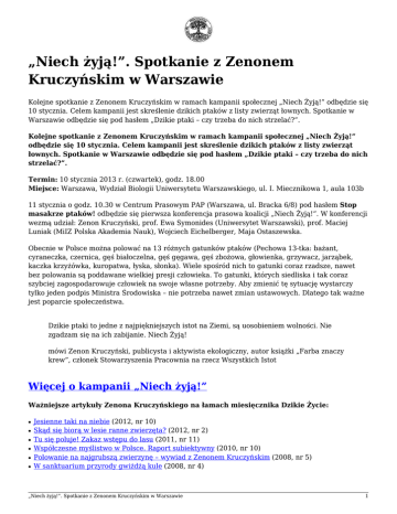 „Niech żyją!”. Spotkanie z Zenonem Kruczyńskim w Warszawie Kolejne spotkanie z Zenonem Kruczyńskim w ramach kampanii społecznej „Niech Żyją!” odbędzie się 10 stycznia. Celem kampanii jest skreślenie dzikich ptaków z listy zwierząt łownych. Spotkanie w Warszawie odbędzie się pod hasłem „Dzikie ptaki – czy trzeba do nich strzelać?”. Kolejne spotkanie z Zenonem Kruczyńskim w ramach kampanii społecznej „Niech Żyją!” odbędzie się 10 stycznia. Celem kampanii jest skreślenie dzikich ptaków z listy zwierząt łownych. Spotkanie w Warszawie odbędzie się pod hasłem „Dzikie ptaki – czy trzeba do nich strzelać?”. Termin: 10 stycznia 2013 r. (czwartek), godz. 18.00 Miejsce: Warszawa, Wydział Biologii Uniwersytetu Warszawskiego, ul. I. Miecznikowa 1, aula 103b 11 stycznia o godz. 10.30 w Centrum Prasowym PAP (Warszawa, ul. Bracka 6/8) pod hasłem Stop masakrze ptaków! odbędzie się pierwsza konferencja prasowa koalicji „Niech Żyją!”. W konferencji wezmą udział: Zenon Kruczyński, prof. Ewa Symonides (Uniwersytet Warszawski), prof. Maciej Luniak (MiIZ Polska Akademia Nauk), Wojciech Eichelberger, Maja Ostaszewska. Obecnie w Polsce można polować na 13 różnych gatunków ptaków (Pechowa 13-tka: bażant, cyraneczka, czernica, gęś białoczelna, gęś gęgawa, gęś zbożowa, głowienka, grzywacz, jarząbek, kaczka krzyżówka, kuropatwa, łyska, słonka). Wiele spośród nich to gatunki coraz rzadsze, nawet bez polowania są poddawane wielkiej presji człowieka. To gatunki, których siedliska i tak coraz szybciej zagospodarowuje człowiek na swoje własne potrzeby. Aby zmienić tę sytuację wystarczy tylko jeden podpis Ministra Środowiska – nie potrzeba nawet zmian ustawowych. Dlatego tak ważne jest poparcie społeczeństwa. Dzikie ptaki to jedne z najpiękniejszych istot na Ziemi, są uosobieniem wolności. Nie zgadzam się na ich zabijanie. Niech Żyją! mówi Zenon Kruczyński, publicysta i aktywista ekologiczny, autor książki „Farba znaczy krew”, członek Stowarzyszenia Pracownia na rzecz Wszystkich Istot Więcej o kampanii „Niech żyją!” Ważniejsze artykuły Zenona Kruczyńskiego na łamach miesięcznika Dzikie Życie: ● ● ● ● ● ● Jesienne taki na niebie (2012, nr 10) Skąd się biorą w lesie ranne zwierzęta? (2012, nr 2) Tu się poluje! Zakaz wstępu do lasu (2011, nr 11) Współczesne myślistwo w Polsce. Raport subiektywny (2010, nr 10) Polowanie na najgrubszą zwierzynę – wywiad z Zenonem Kruczyńskim (2008, nr 5) W sanktuarium przyrody gwiżdżą kule (2008, nr 4) „Niech żyją!”. Spotkanie z Zenonem Kruczyńskim w Warszawie 1 O książce „Farba znaczy krew”: ● ● Być ze spokojem w sercu (Dzikie Życie, 2008, nr 5) Fragment książki na stronie wydawnictwa słowo/obraz terytoria Czytaj również: ● ● Niech żyją ptaki! Ich zabijanie to fanaberia (wyborcza.pl, 14.01.2013) „Niech żyją” ptaki! (polskieradio.pl, 11.01.2013) „Niech żyją!”. Spotkanie z Zenonem Kruczyńskim w Warszawie 2