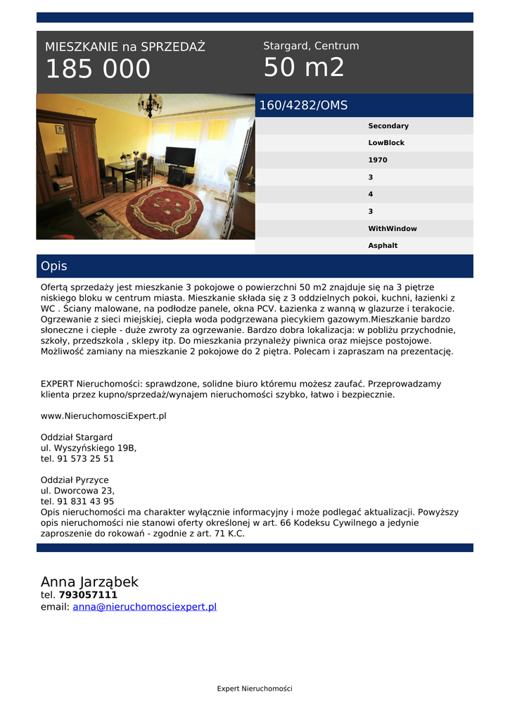 Stargard, Centrum MIESZKANIE na SPRZEDAŻ 50 m2 185 000 160/4282/OMS Secondary LowBlock 1970 3 4 3 WithWindow Asphalt Opis Ofertą sprzedaży jest mieszkanie 3 pokojowe o powierzchni 50 m2 znajduje się na 3 piętrze niskiego bloku w centrum miasta. Mieszkanie składa się z 3 oddzielnych pokoi, kuchni, łazienki z WC . Ściany malowane, na podłodze panele, okna PCV. Łazienka z wanną w glazurze i terakocie. Ogrzewanie z sieci miejskiej, ciepła woda podgrzewana piecykiem gazowym.Mieszkanie bardzo słoneczne i ciepłe - duże zwroty za ogrzewanie. Bardzo dobra lokalizacja: w pobliżu przychodnie, szkoły, przedszkola , sklepy itp. Do mieszkania przynależy piwnica oraz miejsce postojowe. Możliwość zamiany na mieszkanie 2 pokojowe do 2 piętra. Polecam i zapraszam na prezentację. EXPERT Nieruchomości: sprawdzone, solidne biuro któremu możesz zaufać. Przeprowadzamy klienta przez kupno/sprzedaż/wynajem nieruchomości szybko, łatwo i bezpiecznie. www.NieruchomosciExpert.pl Oddział Stargard ul. Wyszyńskiego 19B, tel. 91 573 25 51 Oddział Pyrzyce ul. Dworcowa 23, tel. 91 831 43 95 Opis nieruchomości ma charakter wyłącznie informacyjny i może podlegać aktualizacji. Powyższy opis nieruchomości nie stanowi oferty określonej w art. 66 Kodeksu Cywilnego a jedynie zaproszenie do rokowań - zgodnie z art. 71 K.C. Anna Jarząbek tel. 793057111 email: [email protected] Expert Nieruchomości Powered by TCPDF (www.tcpdf.org)