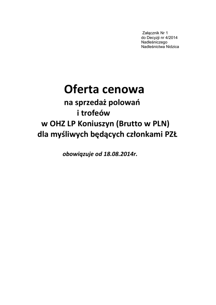 Załącznik Nr 1 do Decyzji nr 4/2014 Nadleśniczego Nadleśnictwa Nidzica Oferta cenowa na sprzedaż polowań i trofeów w OHZ LP Koniuszyn (Brutto w PLN) dla myśliwych będących członkami PZŁ obowiązuje od 18.08.2014r. I. Świadczenia pobytowe (PKWiU 55) - VAT 8 % Wynajęcie kwatery myśliwskiej i pokoi gościnnych dla : a) Pracowników LP - 1 doba - co najmniej 2 doby i powyżej za każdą dobę b) Pozostałych wynajmujących - 1 doba - co najmniej 2 doby i powyżej za każdą dobę - 40,00 zł. - 30,00 zł. - 50,00 zł. - 40,00 zł. II. Organizacja polowania (PKWiU 01.70.10.0) – VAT 23% 1) Polowanie indywidualne - 150,00 zł/dzień (obejmuje: przygotowanie łowiska, sporządzenie dokumentacji, podprowadzanie) 2) Polowanie zbiorowe (metoda wielkoobszarowa) – od 800,00 zł./dzień/myśliwego 3) Polowanie zbiorowe – 300zł./dzień/myśliwego III. Opłata za trofeum (PKWiU 10.11.60.0) – VAT 23% JELENIE Postrzelenie jelenia1 byka - 300,00 zł. postrzelenie jelenia łani lub cielaka - 100,00zł. 1Przy postrzeleniu zwierzyny grubej stosuje się podatek VAT w wysokości takiej jak przy organizacji polowania (23%) Opłata za trofeum (PKWiU 10.11.60.0) – VAT 23% Trofea jeleni byków – wieniec i grandle. Opłata za trofeum wg masy wieńca z czaszką, kością nosową i potyliczną oraz górną szczęką: Byki. trofeum o masie do 2kg (w tym byk-szpicak ) - 472,00 zł trofeum o masie od 2,01 – 2,49 kg - 708,00 zł trofeum o masie od 2,50 – 2,99 kg - 944,00 zł trofeum o masie od 3,00 – 3,49 kg - 1416,00 zł trofeum o masie od 3,50 – 3,99 kg - 1888,00 zł trofeum o masie od 4,00 – 4,49 kg - 2360,00 zł trofeum o masie od 4,50 – 4,99 kg - 2832,00 zł trofeum o masie od 5,00 – 5,99 kg - 3304,00 zł + 4,70 zł za każde 0,01 kg pow. 5 kg trofeum o masie od 6,00 – 6,99 kg - 3776,00 zł + 4,70 zł za każde 0,01 kg pow. 6 kg trofeum o masie od 7,00 – 7,99 kg - 4248,00 zł + 9,40 zł za każde 0,01 kg pow. 7 kg trofeum o masie 8,00 kg i powyżej - 5129,00 zł + 23,50 zł za każde 0,01 kg pow. 8 kg Łanie i cielęta - trofeum grandle, - 40,00 zł SARNY Postrzelenie sarny – kozła - 101,00 zł postrzelenie sarny kozy lub koźlęcia - 26,00 zł Kozły Opłata za trofeum (PKWiU 10.11.60.0) – VAT 23% Opłata za trofeum wg masy parostków wraz z czaszką, kością nosową i potyliczną oraz górną szczęką po odjęciu 90 g. trofeum o masie do 149g ( w tym rogacz guzikarz i szpicak) - 118,00 zł. trofeum o masie od 150 – 199 g - 236,00 zł. trofeum o masie od 200 – 299 g - 354,00 zł + 1,10 zł za każdy 1 g pow. 200 g trofeum o masie od 300 – 349 g - 472,00 zł + 7,10 zł za każdy 1 g pow. 300 g trofeum o masie od 350 – 399 g - 826,00 zł + 9,40 zł za każdy 1 g pow. 350 g trofeum o masie od 400 – 499 g - 1416,00 zł + 10,00 zł za każdy 1g pow. 400 g trofeum o masie pow. 500g - 2410,00 zł + 23,00zł za każdy 1g pow. 500 g trofeum kozła perukarza o wadze powyżej 550 g - 4720,00 zł Kozy, koźlęta - 31,00 zł DZIKI Postrzelenie dzika - 51,00 zł Opłata za trofeum (PKWiU 10.11.60.0) – VAT 23% Trofeum (szable) o długości do 13,99 cm: a) osobników o wadze do 29,99 kg - 37,00 zł b) osobników o wadze od 30,00 – 49,99 kg - 60,00 zł c) osobników o wadze od 50,00 – 79,99 kg - 241,00 zł d) osobników o wadze powyżej 80 kg - 360,00 zł trofeum (szable) o długości od 14,00 –15,99 cm - 482,00 zł trofeum (szable) o długości od 16,00 – 20,00 cm - 602,00 zł + 7,00 zł za każdy 1 mm pow. 16 cm trofeum (szable) o długości powyżej 20 cm - 882,00 zł +12,00 zł za każdy 1 mm pow. 20 cm Zwierzyna drobna Opłata za trofeum (PKWiU 10.12.50.0) – VAT 23% trofeum z lisa (czaszka) - bez opłaty trofeum z jenota (czaszka) - bez opłaty trofeum z borsuka (czaszka) - 60,00 zł trofeum z kuny (czaszka) - 30 zł trofeum z tchórza (czaszka) - 30 zł trofeum z dzikiej kaczki (pióra) - 6 zł IV. Świadczenia i usługi dodatkowe Wynajęcie transportu – 3 zł./km. Nocna zasiadka na dzika z osoba podprowadzającą 100 zł/dzień Preparacja trofeów: Jeleń byk - 150 zł/szt. rogacz - 120 zł/szt. dzik - 100 zł/szt. drapieżnika - 120 zł/szt. Ściągania skóry i jej zabezpieczenie: jeleń, sarna, dzik - 120 zł/szt. drapieżnika - 100 zł/szt. Za tuszę w skórze cena zgodnie z obowiązującym cennikiem wg pierwszej klasy jakości tuszy. Skóra jelenia, dzika: - 15 zł/kg, sarny: 20 zł/kg Wynajęcie psów do poszukiwań: efektywne - 200 zł nieefektywne – 100 zł. Nadleśniczy Ryszard Schuetz