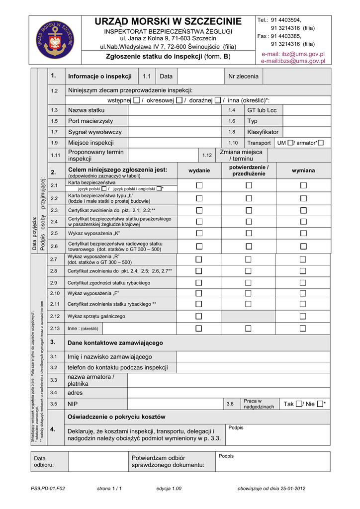 URZĄD MORSKI W SZCZECINIE INSPEKTORAT BEZPIECZEŃSTWA ŻEGLUGI ul. Jana z Kolna 9, 71-603 Szczecin ul.Nab.Władysława IV 7, 72-600 Świnoujście (filia) Tel.: 91 4403594, 91 3214316 (filia) Fax : 91 4403385, 91 3214316 (filia) e-mail: [email protected] e-mail:[email protected] Zgłoszenie statku do inspekcji (form. B) 1. Informacje o inspekcji 1.2 Niniejszym zlecam przeprowadzenie inspekcji: wstępnej przyjmującej: Podpis osoby Data przyjęcia: Data / okresowej Nr zlecenia / doraźnej / inna (określić)*: 1.3 Nazwa statku 1.4 GT lub Lcc 1.5 Port macierzysty 1.6 Typ 1.7 Sygnał wywoławczy 1.8 Klasyfikator 1.9 Miejsce inspekcji 1.10 Transport 1.11 Proponowany termin inspekcji 2. Składający wniosek wypełnia pola białe. Pola szare tylko do zapisów urzędowych. * właściwe zaznaczyć, ** należy dołączyć wniosek o zwolnienie z określonych wymagań wraz z uzasadnieniem 1.1 2.1 2.2 1.12 Celem niniejszego zgłoszenia jest: (odpowiednio zaznaczyć w tabeli) Karta bezpieczeństwa język polski / język polski i angielski Karta bezpieczeństwa typu „Ł” (łodzie i małe statki o prostej budowie) UM / armator* Zmiana miejsca / terminu potwierdzenie / przedłużenie wydanie wymiana * 2.3 Certyfikat zwolnienia do pkt. 2.1; 2.2;** 2.4 Certyfikat bezpieczeństwa statku pasażerskiego w pasażerskiej żegludze krajowej 2.5 Wykaz wyposażenia „K” 2.6 Certyfikat bezpieczeństwa radiowego statku towarowego (dot. statków o GT 300 – 500) 2.7 Wykaz wyposażenia „R” (dot. statków o GT 300 – 500) 2.8 Certyfikat zwolnienia do pkt. 2.4; 2.5; 2.6, 2.7** 2.9 Certyfikat zgodności statku rybackiego 2.10 Wykaz wyposażenia „F” 2.11 Certyfikat zwolnienia statku rybackiego ** 2.12 Wykaz sprzętu gaśniczego 2.13 Inne : (określić) 3. Dane kontaktowe zamawiającego 3.1 Imię i nazwisko zamawiającego 3.2 telefon do kontaktu podczas inspekcji 3.3 nazwa armatora / płatnika 3.4 adres 3.5 NIP Praca w nadgodzinach 3.6 Tak / Nie Oświadczenie o pokryciu kosztów 4. Deklaruję, że kosztami inspekcji, transportu, delegacji i nadgodzin należy obciążyć podmiot wymieniony w p. 3.3. Potwierdzam odbiór sprawdzonego dokumentu: Data odbioru: PS9.PD-01.F02 strona 1 / 1 edycja 1.00 Podpis Podpis obowiązuje od dnia 25-01-2012 *