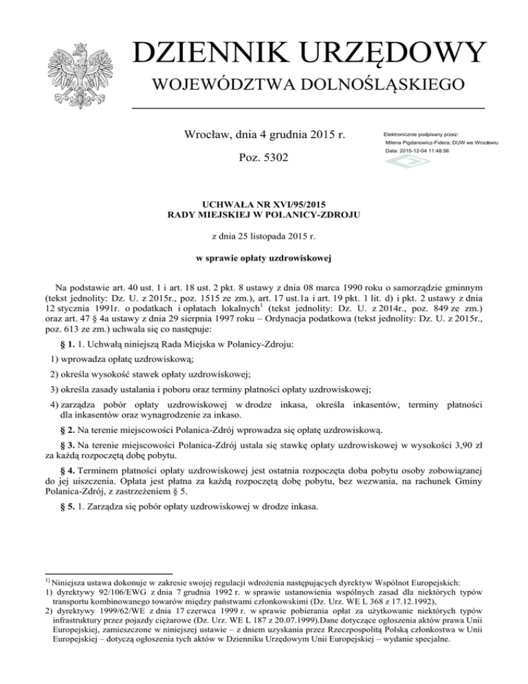 DZIENNIK URZĘDOWY WOJEWÓDZTWA DOLNOŚLĄSKIEGO Wrocław, dnia 4 grudnia 2015 r. Elektronicznie podpisany przez: Milena Pigdanowicz-Fidera; DUW we Wrocławiu Poz. 5302 Data: 2015-12-04 11:48:56 UCHWAŁA NR XVI/95/2015 RADY MIEJSKIEJ W POLANICY-ZDROJU z dnia 25 listopada 2015 r. w sprawie opłaty uzdrowiskowej Na podstawie art. 40 ust. 1 i art. 18 ust. 2 pkt. 8 ustawy z dnia 08 marca 1990 roku o samorządzie gminnym (tekst jednolity: Dz. U. z 2015r., poz. 1515 ze zm.), art. 17 ust.1a i art. 19 pkt. 1 lit. d) i pkt. 2 ustawy z dnia 12 stycznia 1991r. o podatkach i opłatach lokalnych1 (tekst jednolity: Dz. U. z 2014r., poz. 849 ze zm.) oraz art. 47 § 4a ustawy z dnia 29 sierpnia 1997 roku – Ordynacja podatkowa (tekst jednolity: Dz. U. z 2015r., poz. 613 ze zm.) uchwala się co następuje: § 1. 1. Uchwałą niniejszą Rada Miejska w Polanicy-Zdroju: 1) wprowadza opłatę uzdrowiskową; 2) określa wysokość stawek opłaty uzdrowiskowej; 3) określa zasady ustalania i poboru oraz terminy płatności opłaty uzdrowiskowej; 4) zarządza pobór opłaty uzdrowiskowej w drodze inkasa, określa inkasentów, terminy płatności dla inkasentów oraz wynagrodzenie za inkaso. § 2. Na terenie miejscowości Polanica-Zdrój wprowadza się opłatę uzdrowiskową. § 3. Na terenie miejscowości Polanica-Zdrój ustala się stawkę opłaty uzdrowiskowej w wysokości 3,90 zł za każdą rozpoczętą dobę pobytu. § 4. Terminem płatności opłaty uzdrowiskowej jest ostatnia rozpoczęta doba pobytu osoby zobowiązanej do jej uiszczenia. Opłata jest płatna za każdą rozpoczętą dobę pobytu, bez wezwania, na rachunek Gminy Polanica-Zdrój, z zastrzeżeniem § 5. § 5. 1. Zarządza się pobór opłaty uzdrowiskowej w drodze inkasa. 1] Niniejsza ustawa dokonuje w zakresie swojej regulacji wdrożenia następujących dyrektyw Wspólnot Europejskich: 1) dyrektywy 92/106/EWG z dnia 7 grudnia 1992 r. w sprawie ustanowienia wspólnych zasad dla niektórych typów transportu kombinowanego towarów między państwami członkowskimi (Dz. Urz. WE L 368 z 17.12.1992), 2) dyrektywy 1999/62/WE z dnia 17 czerwca 1999 r. w sprawie pobierania opłat za użytkowanie niektórych typów infrastruktury przez pojazdy ciężarowe (Dz. Urz. WE L 187 z 20.07.1999).Dane dotyczące ogłoszenia aktów prawa Unii Europejskiej, zamieszczone w niniejszej ustawie – z dniem uzyskania przez Rzeczpospolitą Polską członkostwa w Unii Europejskiej – dotyczą ogłoszenia tych aktów w Dzienniku Urzędowym Unii Europejskiej – wydanie specjalne. Dziennik Urzędowy Województwa Dolnośląskiego –2– Poz. 5302 2. Na inkasentów opłaty uzdrowiskowej zobowiązanych do jej poboru wyznacza się osoby prawne, jednostki organizacyjne nieposiadające osobowości prawnej oraz osoby fizyczne prowadzące hotele, pensjonaty, zakłady lecznictwa uzdrowiskowego za wyjątkiem szpitali i szpitali uzdrowiskowych, motele, domy wczasowe, domy wycieczkowe, ośrodki szkoleniowe, schroniska, kwatery prywatne, pokoje gościnne i inne obiekty, w których świadczone są usługi hotelarskie, o których mowa w ustawie z dnia 29 sierpnia 1997 roku o usługach turystycznych (tekst jednolity: Dz. U. z 2014r., poz. 196 ze zm.), a także osoby fizyczne dokonujące najmu w budynkach mieszkalnych stanowiących ich własność – opodatkowujące dochód z najmu jako niezwiązany z działalnością gospodarczą na zasadach określonych w ustawie z dnia 20 listopada 1998r. o zryczałtowanym podatku dochodowym od niektórych przychodów osiąganych przez osoby fizyczne (Dz. U. z 1998r. Nr 144, poz. 930 ze zm.). 3. Pobór opłaty uzdrowiskowej będzie dokonywany na druki ścisłego zarachowania typu kwitariusze K-103 wydawane i ewidencjonowane przez kasę Urzędu Miejskiego w Polanicy-Zdroju. 4. Inkasenci posiadający program komputerowy w zakresie inkaso opłaty uzdrowiskowej, mogą na każdą pobraną kwotę opłaty wydać pokwitowanie według ustalonego wzoru, który będzie zgodny z ustawą o rachunkowości. Równocześnie z dokonaniem wpłaty pobranej opłaty uzdrowiskowej, inkasent zobowiązany jest przedłożyć zestawienie osób (nazwisko i imię, miejsce zamieszkania, nazwę obiektu, w którym osoba jest zakwaterowana, okres pobytu oraz kwotę jaka została uregulowana z wyszczególnieniem daty wpłaty i numeru pokwitowania) w zakresie pobranej opłaty uzdrowiskowej, które będzie zgodne z ogólna kwotą wpłaconą do kasy lub na rachunek bankowy Gminy Polanica-Zdrój. 5. Pobrane kwoty opłaty uzdrowiskowej inkasenci zobowiązani są wpłacić na rachunek lub w kasie Urzędu Gminy Polanica-Zdrój raz w miesiącu, w terminie do 05-go dnia miesiąca następującego po miesiącu, w którym opłatę pobrano. 6. Inkasentom opłaty uzdrowiskowej przysługuje wynagrodzenie w wysokości 10% pobranych i terminowo odprowadzonych opłat. 7. Wynagrodzenie będzie wypłacane 10-go każdego miesiąca w kasie Urzędu Miejskiego. § 6. Wykonanie uchwały powierza się Burmistrzowi Miasta Polanica-Zdrój. § 7. Traci moc uchwała Nr XIII/68/2011 Rady Miejskiej w Polanicy-Zdroju z dnia 26 października 2011r. w sprawie ustalenia wysokości dziennych stawek opłaty uzdrowiskowej, zarządzenia jej poboru w drodze inkasa oraz określenia inkasentów i ich wynagrodzenia oraz uchwała Nr XII/67/2015 Rady Miejskiej w Polanicy-Zdroju z dnia 29 czerwca 2015r. w sprawie zmiany uchwały nr XIII/68/2011 Rady Miejskiej w Polanicy-Zdroju z dnia 26 października 2011r ustalenia wysokości dziennych stawek opłaty uzdrowiskowej, zarządzenia jej poboru w drodze inkasa oraz określenia inkasentów i ich wynagrodzenia. § 8. Uchwała wchodzi w życie po upływie 14 dni od dnia jej ogłoszenia w Dzienniku Urzędowym Województwa Dolnośląskiego z mocą obowiązującą od 01 stycznia 2016 roku. Przewodniczący Rady Miejskiej w Polanicy-Zdroju: R. Szymański