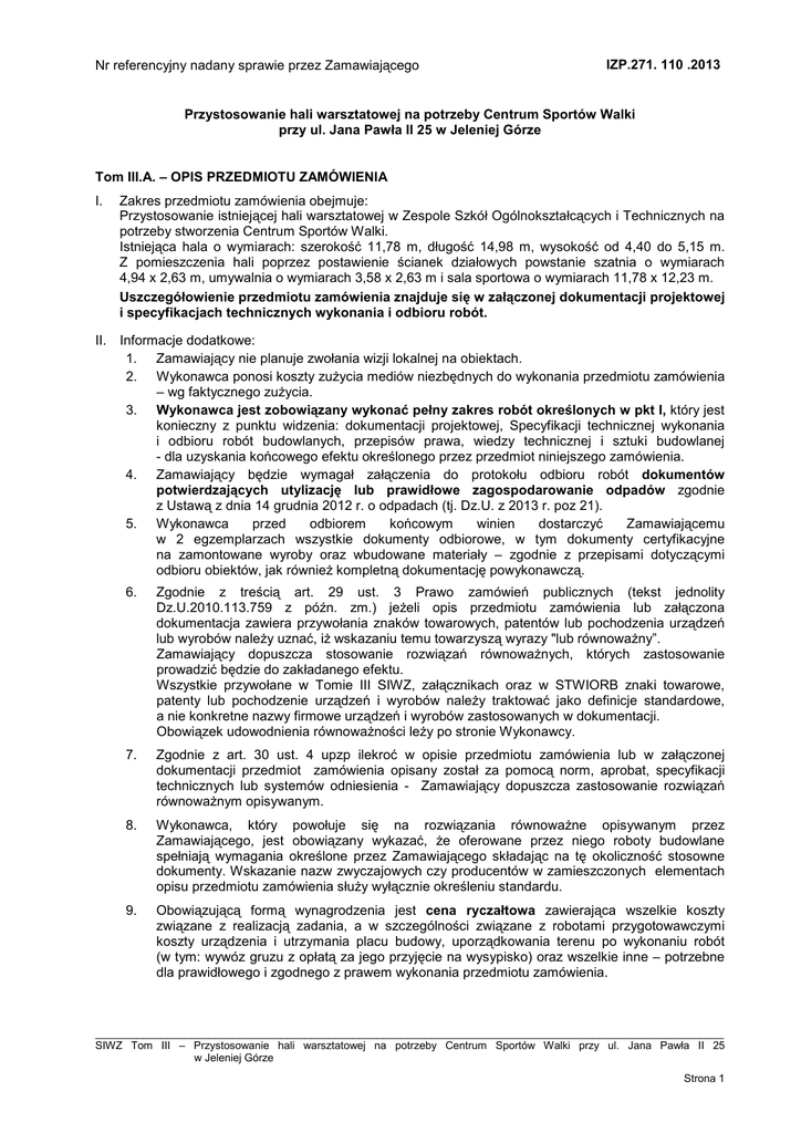 Nr referencyjny nadany sprawie przez Zamawiającego IZP.271. 110 .2013 Przystosowanie hali warsztatowej na potrzeby Centrum Sportów Walki przy ul. Jana Pawła II 25 w Jeleniej Górze Tom III.A. – OPIS PRZEDMIOTU ZAMÓWIENIA I. Zakres przedmiotu zamówienia obejmuje: Przystosowanie istniejącej hali warsztatowej w Zespole Szkół Ogólnokształcących i Technicznych na potrzeby stworzenia Centrum Sportów Walki. Istniejąca hala o wymiarach: szerokość 11,78 m, długość 14,98 m, wysokość od 4,40 do 5,15 m. Z pomieszczenia hali poprzez postawienie ścianek działowych powstanie szatnia o wymiarach 4,94 x 2,63 m, umywalnia o wymiarach 3,58 x 2,63 m i sala sportowa o wymiarach 11,78 x 12,23 m. Uszczegółowienie przedmiotu zamówienia znajduje się w załączonej dokumentacji projektowej i specyfikacjach technicznych wykonania i odbioru robót. II. Informacje dodatkowe: 1. Zamawiający nie planuje zwołania wizji lokalnej na obiektach. 2. Wykonawca ponosi koszty zużycia mediów niezbędnych do wykonania przedmiotu zamówienia – wg faktycznego zużycia. 3. Wykonawca jest zobowiązany wykonać pełny zakres robót określonych w pkt I, który jest konieczny z punktu widzenia: dokumentacji projektowej, Specyfikacji technicznej wykonania i odbioru robót budowlanych, przepisów prawa, wiedzy technicznej i sztuki budowlanej - dla uzyskania końcowego efektu określonego przez przedmiot niniejszego zamówienia. 4. Zamawiający będzie wymagał załączenia do protokołu odbioru robót dokumentów potwierdzających utylizację lub prawidłowe zagospodarowanie odpadów zgodnie z Ustawą z dnia 14 grudnia 2012 r. o odpadach (tj. Dz.U. z 2013 r. poz 21). 5. Wykonawca przed odbiorem końcowym winien dostarczyć Zamawiającemu w 2 egzemplarzach wszystkie dokumenty odbiorowe, w tym dokumenty certyfikacyjne na zamontowane wyroby oraz wbudowane materiały – zgodnie z przepisami dotyczącymi odbioru obiektów, jak również kompletną dokumentację powykonawczą. 6. Zgodnie z treścią art. 29 ust. 3 Prawo zamówień publicznych (tekst jednolity Dz.U.2010.113.759 z późn. zm.) jeżeli opis przedmiotu zamówienia lub załączona dokumentacja zawiera przywołania znaków towarowych, patentów lub pochodzenia urządzeń lub wyrobów należy uznać, iż wskazaniu temu towarzyszą wyrazy "lub równoważny”. Zamawiający dopuszcza stosowanie rozwiązań równoważnych, których zastosowanie prowadzić będzie do zakładanego efektu. Wszystkie przywołane w Tomie III SIWZ, załącznikach oraz w STWIORB znaki towarowe, patenty lub pochodzenie urządzeń i wyrobów należy traktować jako definicje standardowe, a nie konkretne nazwy firmowe urządzeń i wyrobów zastosowanych w dokumentacji. Obowiązek udowodnienia równoważności leży po stronie Wykonawcy. 7. Zgodnie z art. 30 ust. 4 upzp ilekroć w opisie przedmiotu zamówienia lub w załączonej dokumentacji przedmiot zamówienia opisany został za pomocą norm, aprobat, specyfikacji technicznych lub systemów odniesienia - Zamawiający dopuszcza zastosowanie rozwiązań równoważnym opisywanym. 8. Wykonawca, który powołuje się na rozwiązania równoważne opisywanym przez Zamawiającego, jest obowiązany wykazać, że oferowane przez niego roboty budowlane spełniają wymagania określone przez Zamawiającego składając na tę okoliczność stosowne dokumenty. Wskazanie nazw zwyczajowych czy producentów w zamieszczonych elementach opisu przedmiotu zamówienia służy wyłącznie określeniu standardu. 9. Obowiązującą formą wynagrodzenia jest cena ryczałtowa zawierająca wszelkie koszty związane z realizacją zadania, a w szczególności związane z robotami przygotowawczymi koszty urządzenia i utrzymania placu budowy, uporządkowania terenu po wykonaniu robót (w tym: wywóz gruzu z opłatą za jego przyjęcie na wysypisko) oraz wszelkie inne – potrzebne dla prawidłowego i zgodnego z prawem wykonania przedmiotu zamówienia. _________________________________________________________________________________________________________ SIWZ Tom III – Przystosowanie hali warsztatowej na potrzeby Centrum Sportów Walki przy ul. Jana Pawła II 25 w Jeleniej Górze Strona 1 Ponadto Wykonawca w cenie wykonania robót winien uwzględnić wszystkie koszty wynikające z opisu przedmiotu zamówienia z Projektu budowlanego i specyfikacji technicznych wykonania i odbioru robót budowlanych. Każdy z Wykonawców zobowiązany jest do starannego zapoznania się z zakresem robót. 10. Wykonawca zobowiązany jest prowadzić prace w sposób ograniczający niezorganizowaną emisje pyłu do atmosfery. TOM III B – PROJEKT BUDOWLANY – w załączeniu TOM III C – SPECYFIKACJE TECHNICZNE WYKONANIA I ODBIORU ROBÓT – w załączeniu _________________________________________________________________________________________________________ SIWZ Tom III – Przystosowanie hali warsztatowej na potrzeby Centrum Sportów Walki przy ul. Jana Pawła II 25 w Jeleniej Górze Strona 2